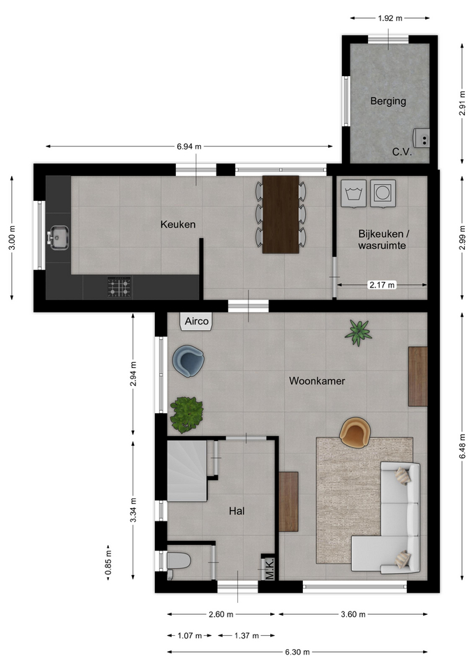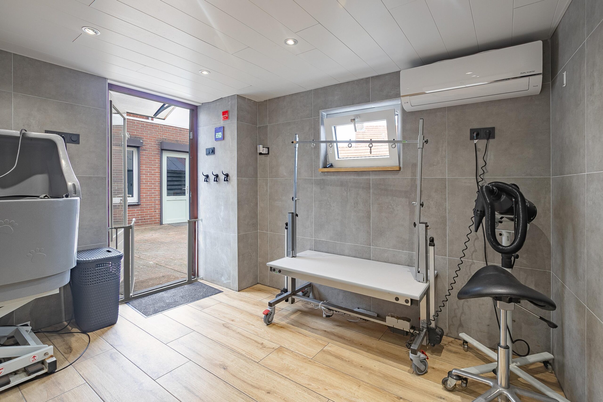 Oprit voor meerdere auto’s en carport. Hal met vernieuwde meterkast (6 groepen, 2 aardlekschakelaars) en toilet. L-vormige woonkamer (ca. 31.5m²) met veel lichtinval, grindvloer en een airco. In de aanbouw gerealiseerde keuken (ca. 22.1m²) met moderne aanrechtcombinatie voorzien granieten blad en de volgende apparatuur: gaskookplaat, vaatwasser, spoelbak en afzuigkap. Naast de keuken gelegen bijkeuken (ca. 6.6m²) met witgoed aansluitingen. Geheel omsloten, royale L-vormige tuin met gezellige zitkuil. Gemetselde hobbyruimte (ca. 11.8m²) welke geïsoleerd is en voorzien van een airco (verwarmen en koelen). Momenteel is deze ruimte in gebruik als trimsalon. Achter de bijkeuken is nog een berging (ca. 5.6m²) met opstelling CV-Combiketel (merk Nefit Baseline, bouwjaar 2014, huur).