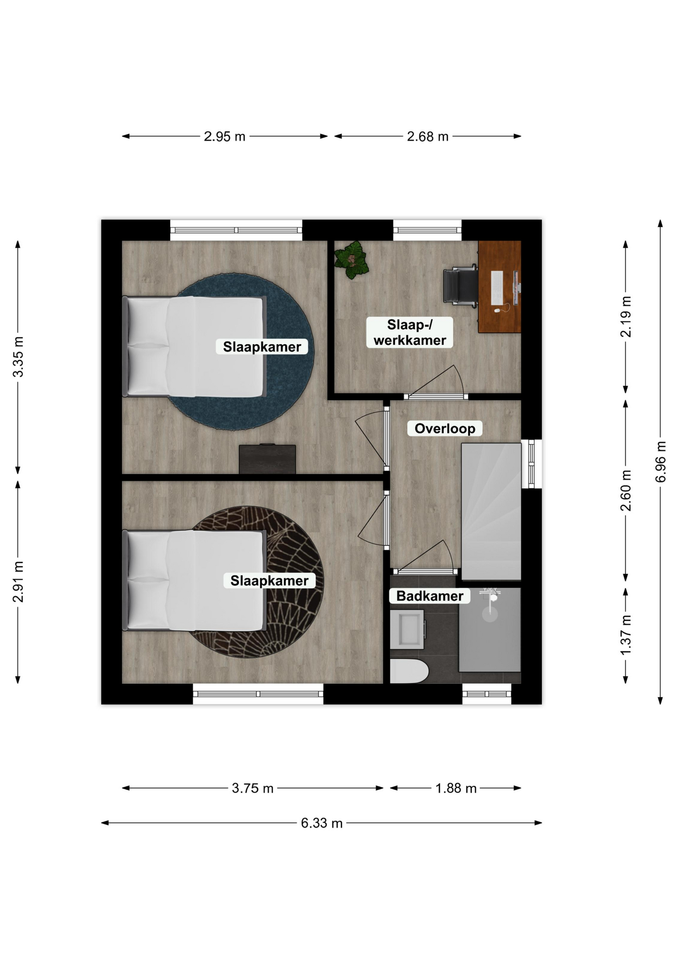 De overloop geeft toegang tot drie slaapkamers van respectievelijk: