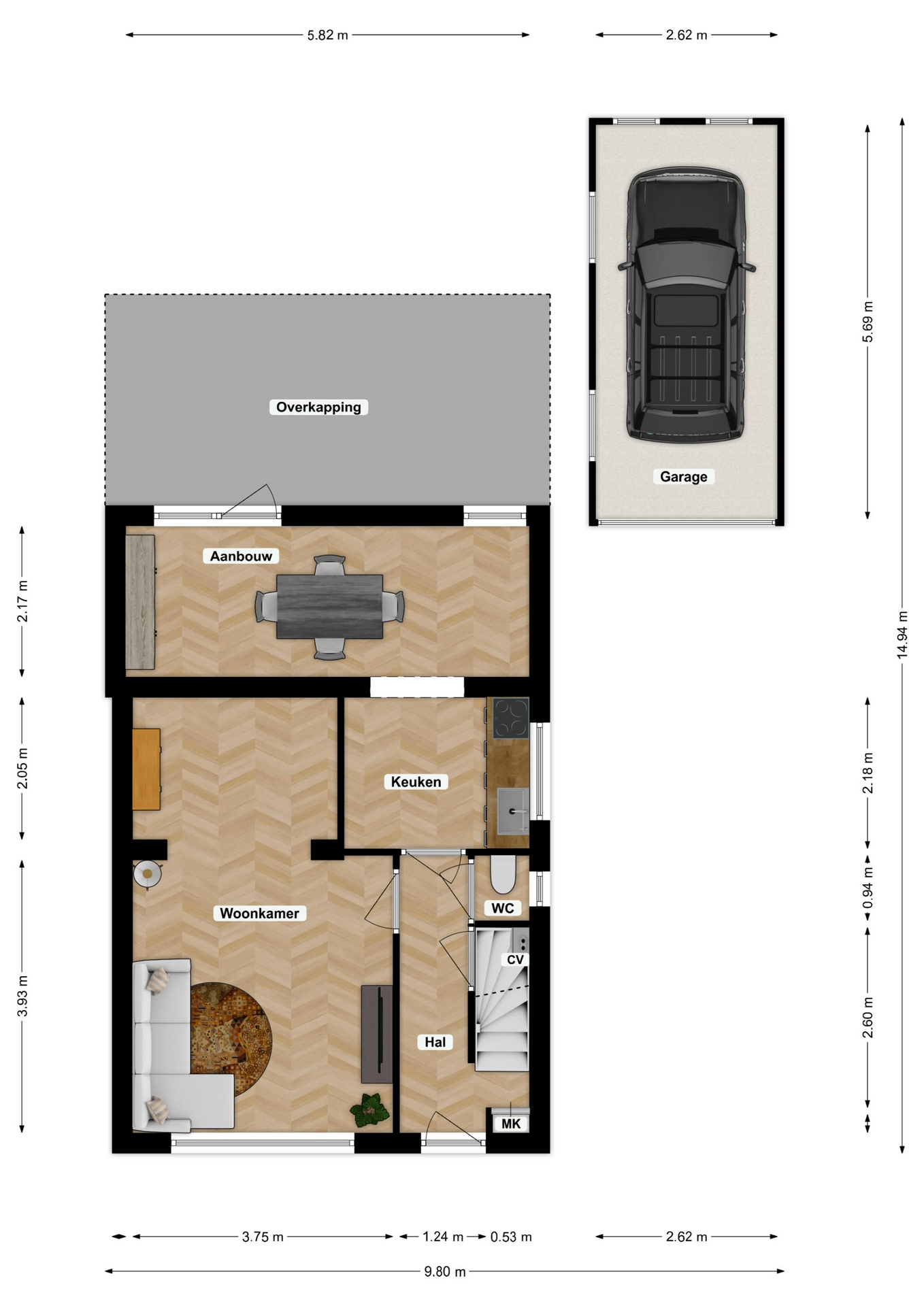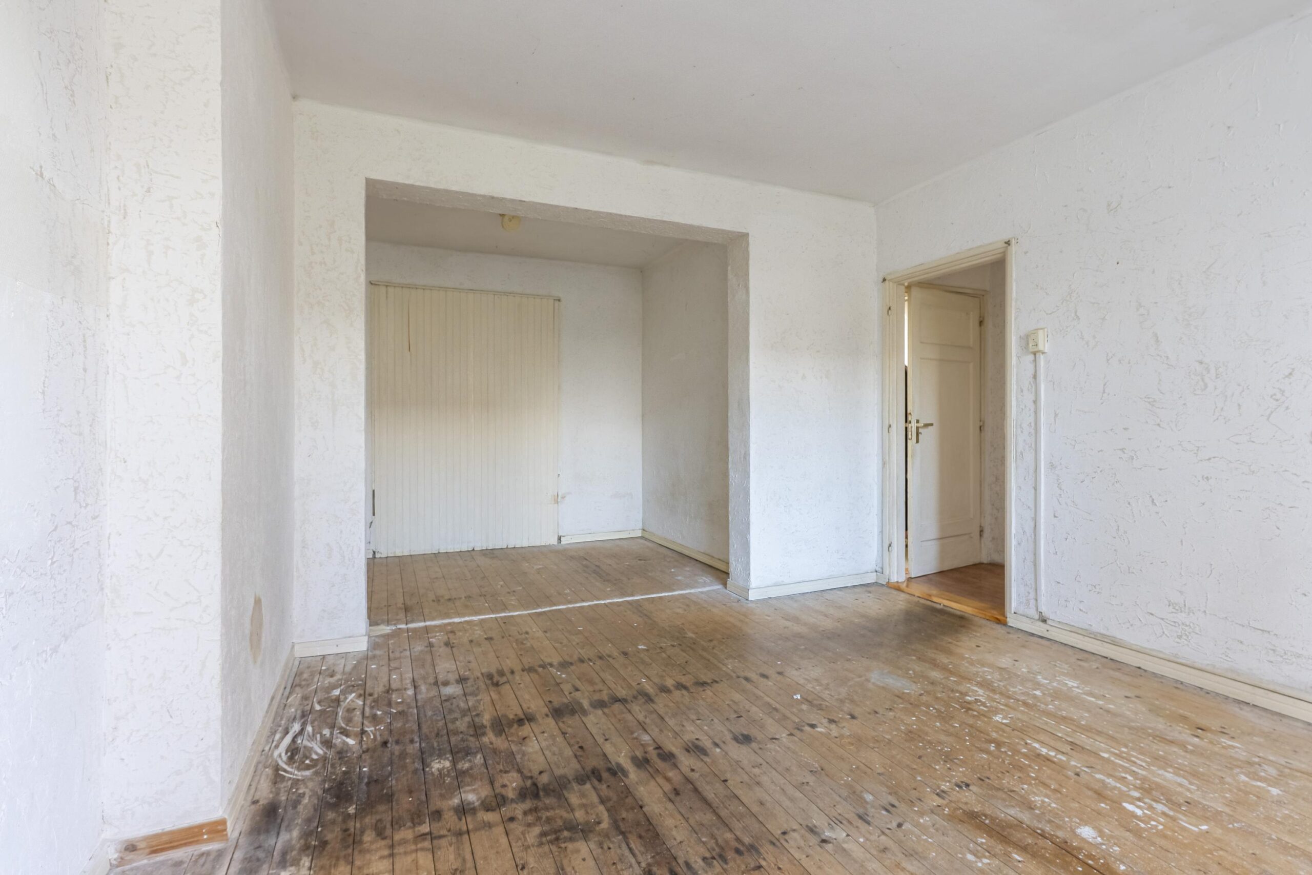 De lichte woonkamer is voorzien van houten vloerdelen en een grote raampartij aan de voorzijde. De houten schroten aan de achterzijde van de woonkamer kunnen worden verwijderd om een open verbinding te creëren met de royale aanbouw.