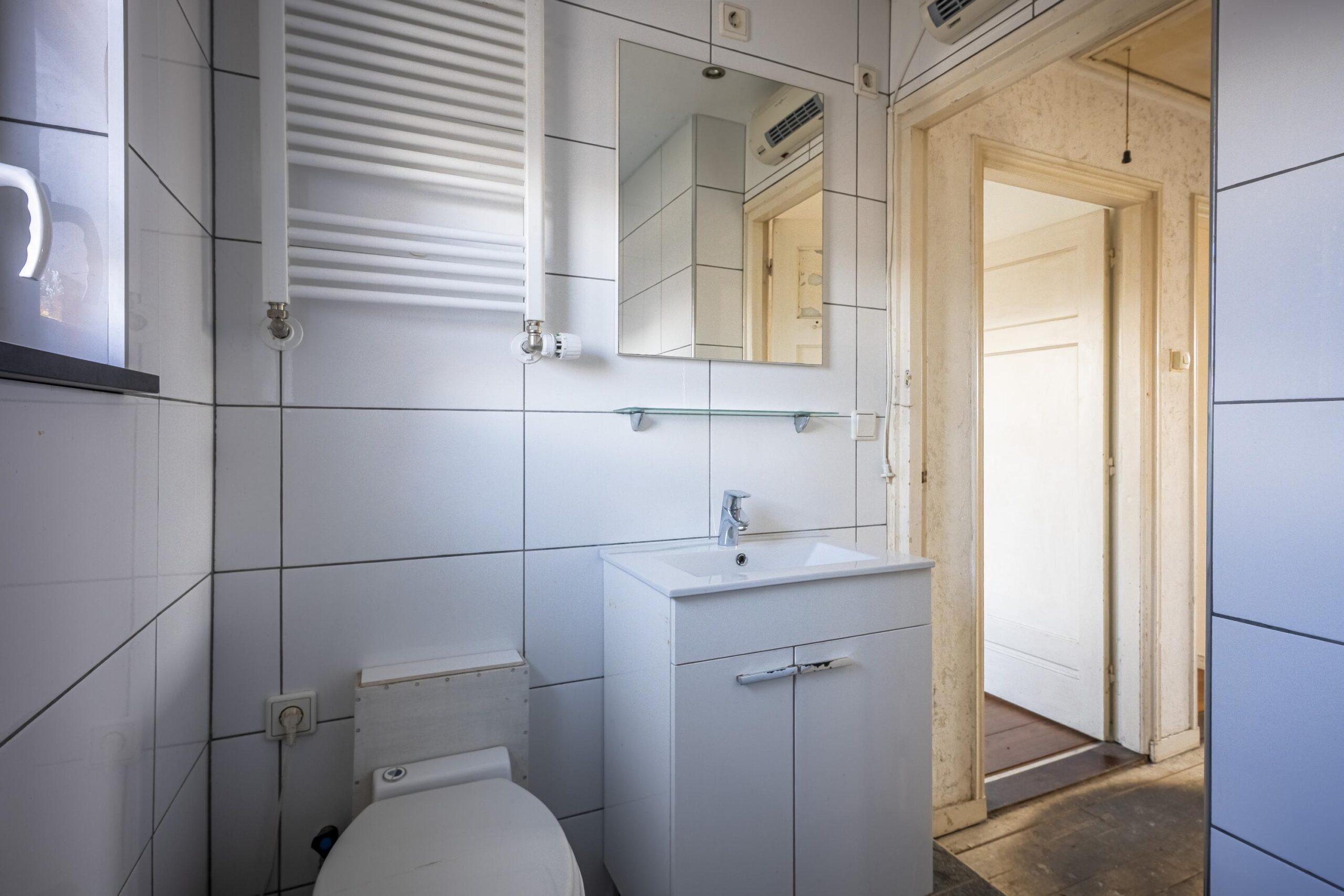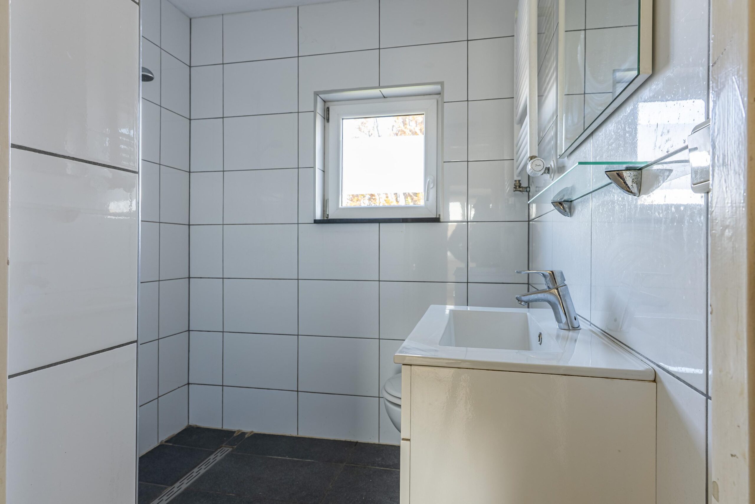 De geheel betegelde badkamer beschikt over een inloopdouche, tweede toilet (Sanibroyeur), wastafel, radiator en een raam voor natuurlijke ventilatie en daglicht.