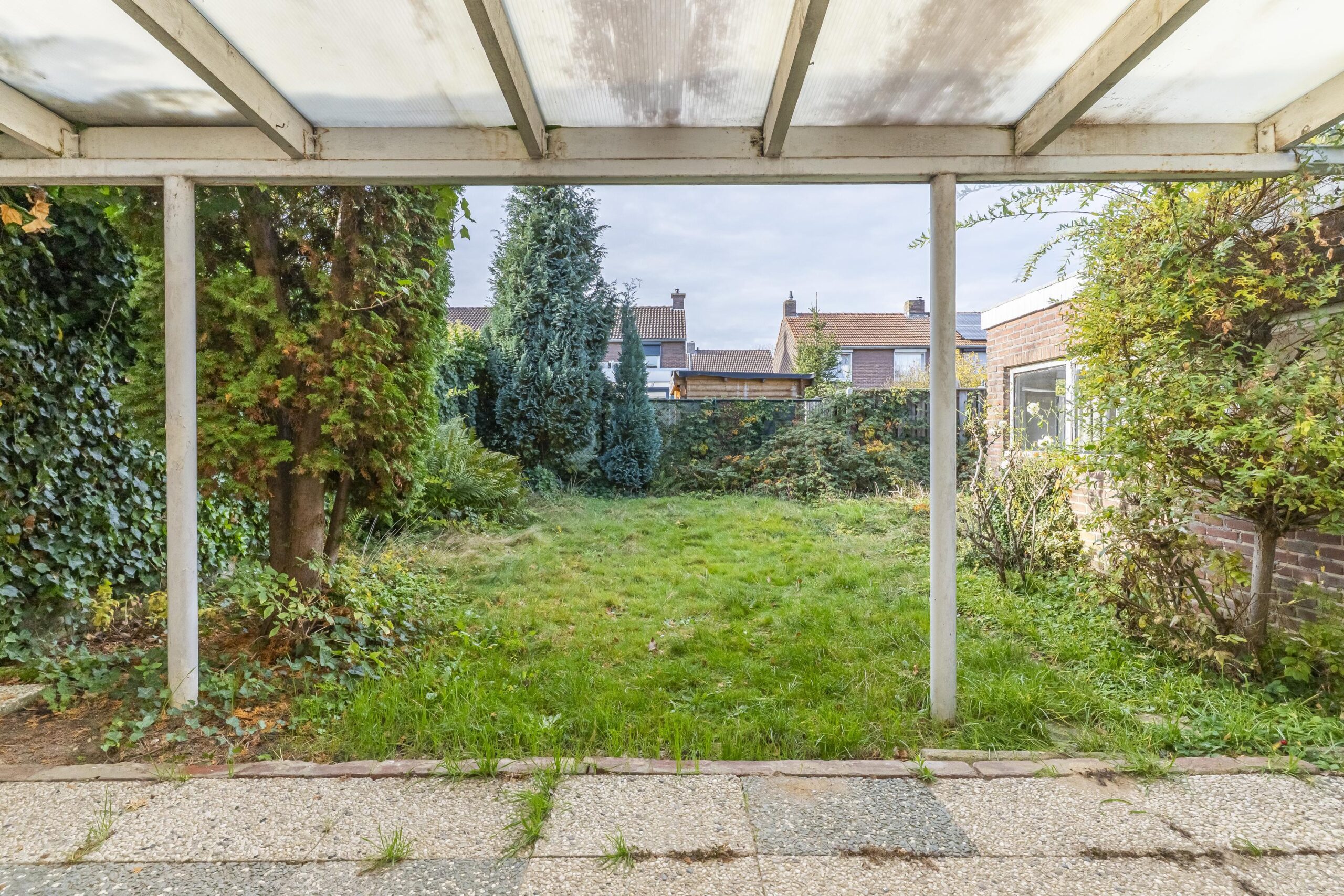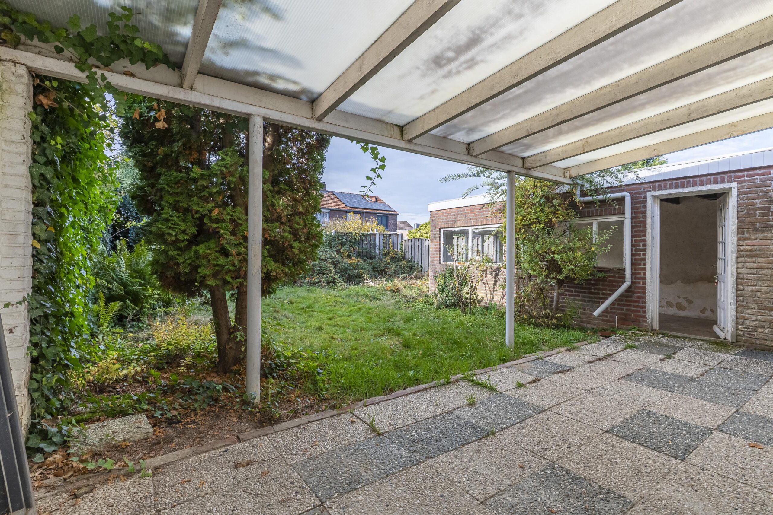 De zonnige achtertuin, gelegen op het westen, biedt privacy en is ingericht met een terras en groene erfafscheiding en overkapping
