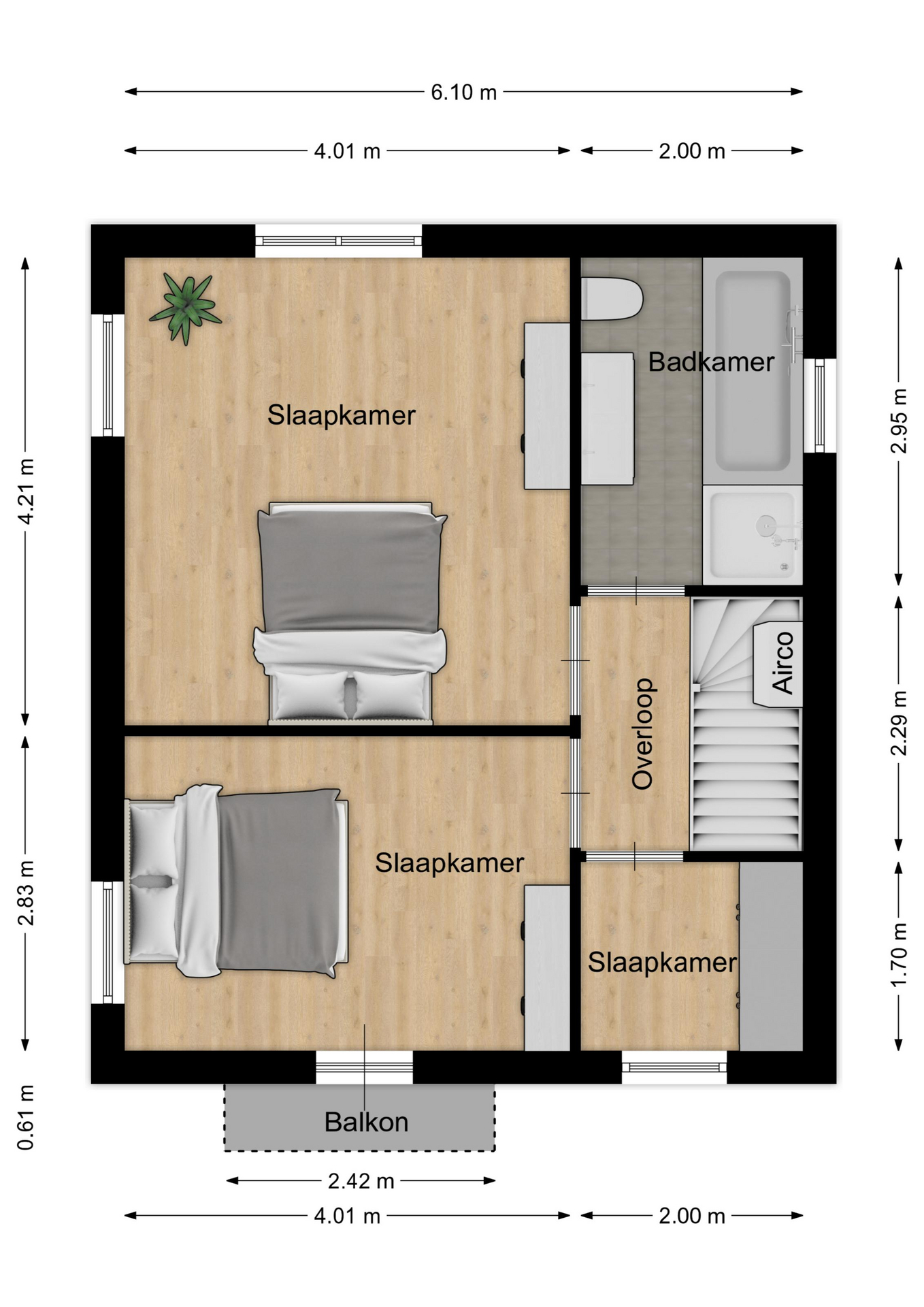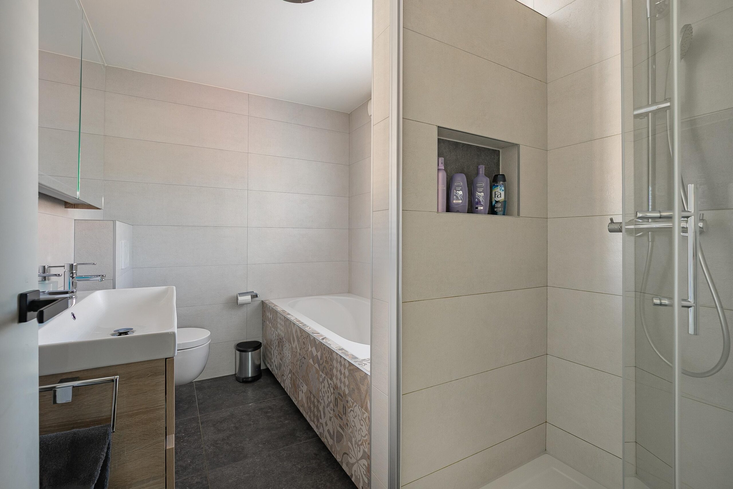 Overloop met airco t.b.v. de gehele bovenverdieping. Drie slaapkamers (resp. ca. 16.9m², 11.4m² en 3.4m². Moderne badkamer (ca. 6m²) met ligbad, douche, wandcloset en badmeubel met wastafel voorzien van twee kranen. Op de badkamer is elektrische vloerverwarming en een elektrische radiator.