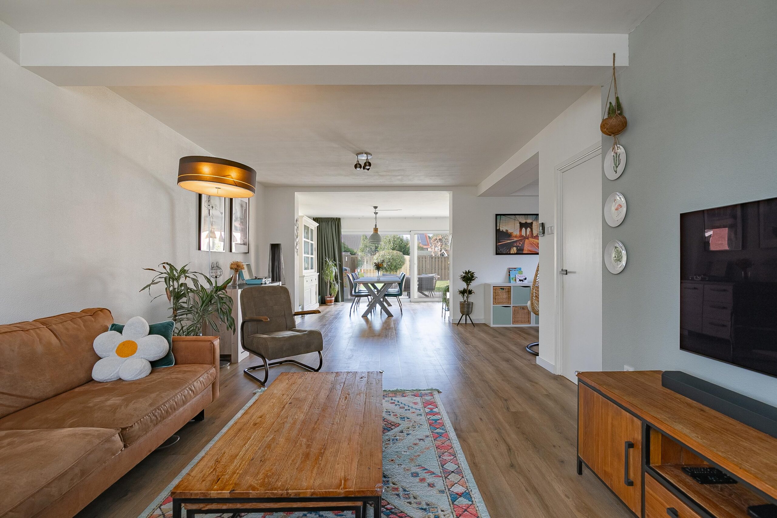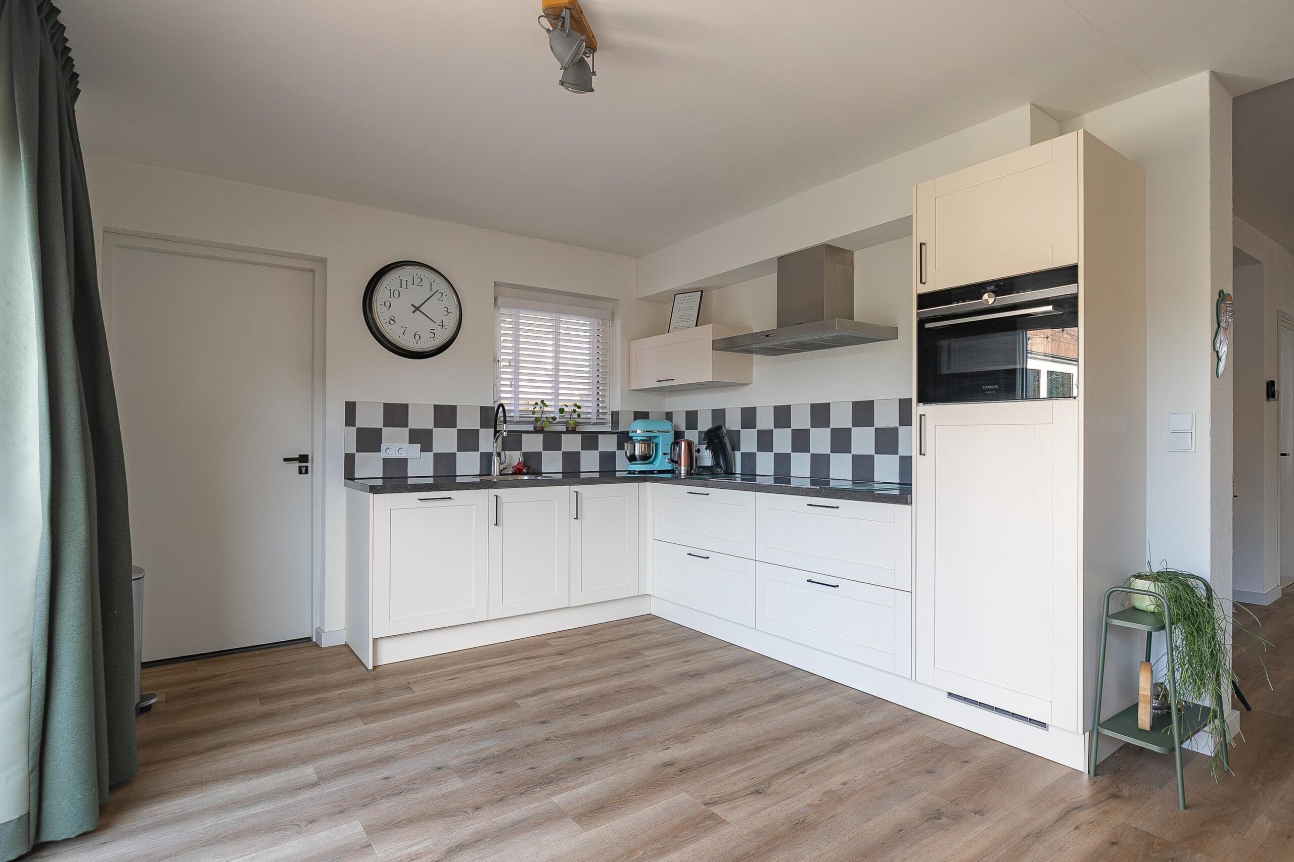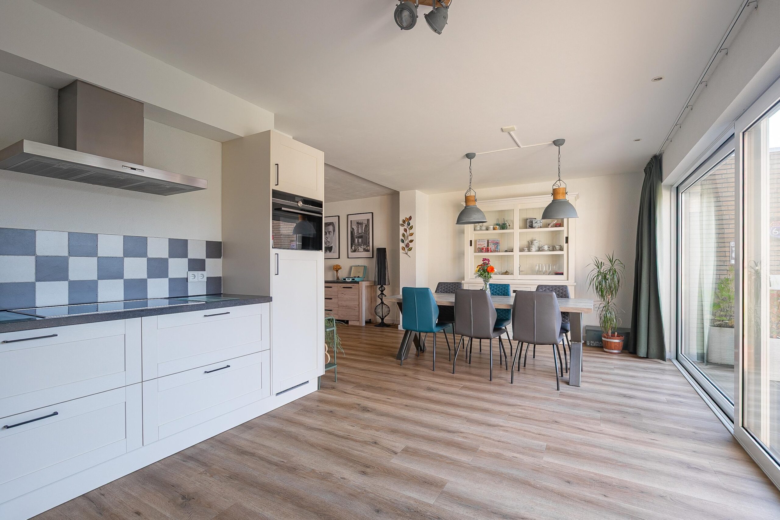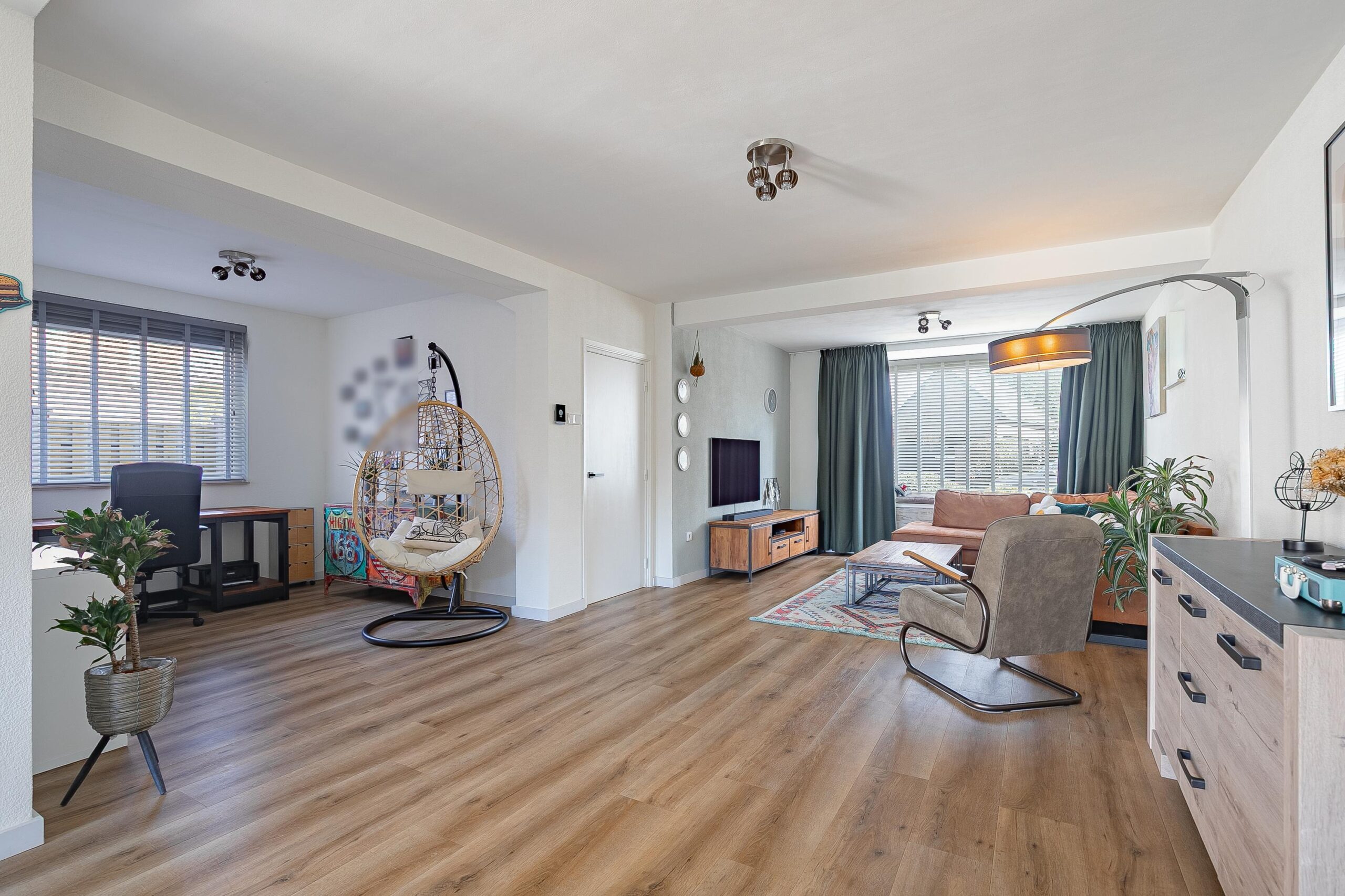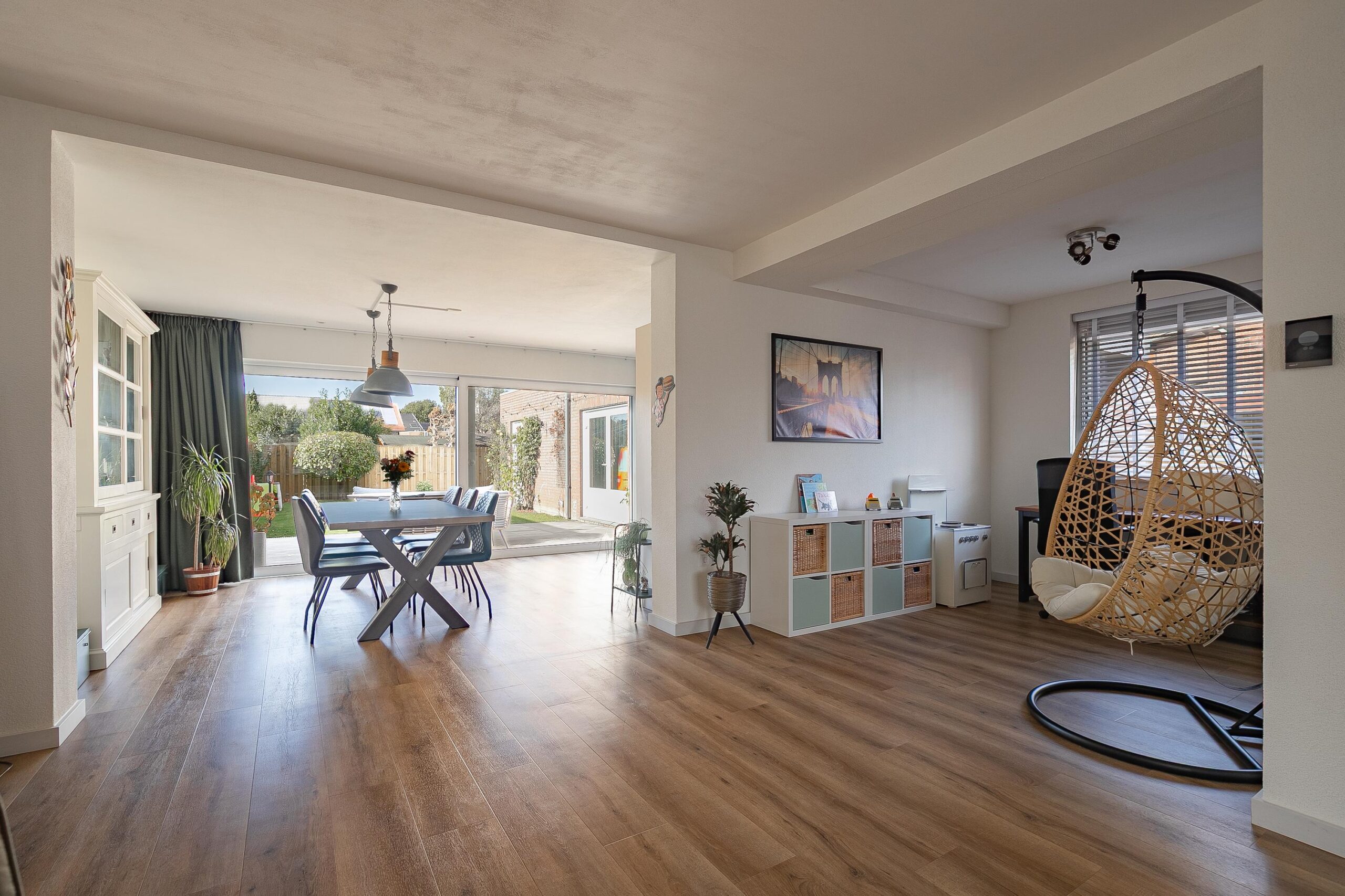 Overdekte entree. Hal met meterkast (vernieuwde groepenkast met 10 groepen en 2 aardlekschakelaars) en toilet met fonteintje. Sfeervolle, L-vormige woonkamer (ca. 38.8m²) met erker, pvc-vloeren en veel lichtinval. In de aanbouw gerealiseerde leefkeuken met moderne aanrechtcombinatie voorzien van de volgende apparatuur: inductie kookplaat, combimagnetron, vaatwasser, koelkast, spoelbak en afzuigkap. Tevens is in de keuken een schuifpui naar de achtertuin. Verwarmde, inpandig bereikbare, royale garage (ca. 37.1m² / 8,74 x 4.24 meter) met elektrisch bedienbare sectionaalpoort. In de garage zijn tevens de witgoedaansluitingen en is de opstelling van de CV-combiketel (merk Nefit, bwjr. 2017, eigendom). Achter de garage is een extra berging (ca. 10.6m²) die van buiten en via de garage bereikbaar is. Voor de garage is nog een overdekte entree. Geheel omsloten achtertuin met veel privacy. Naar achter toe is een vrij uitzicht.