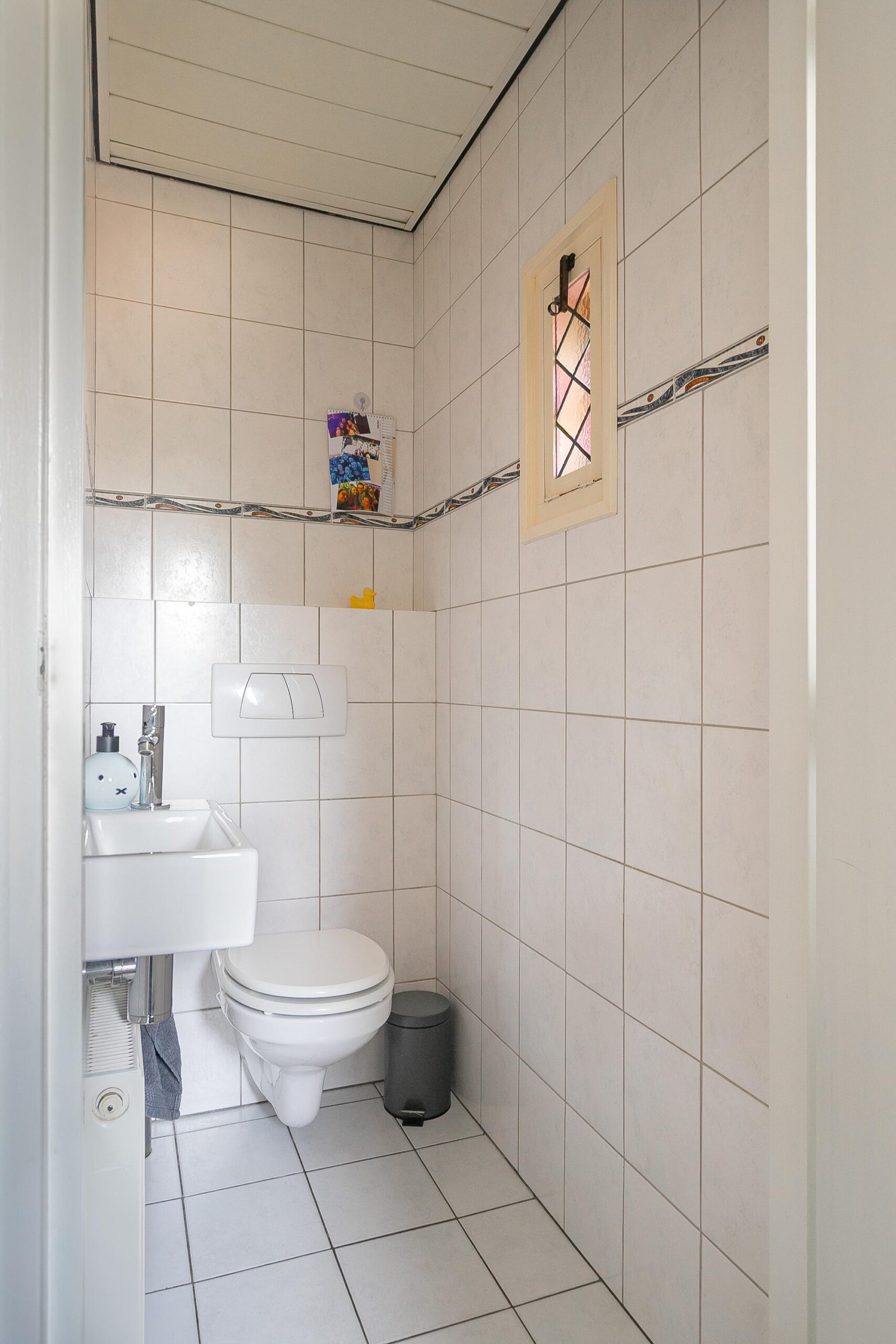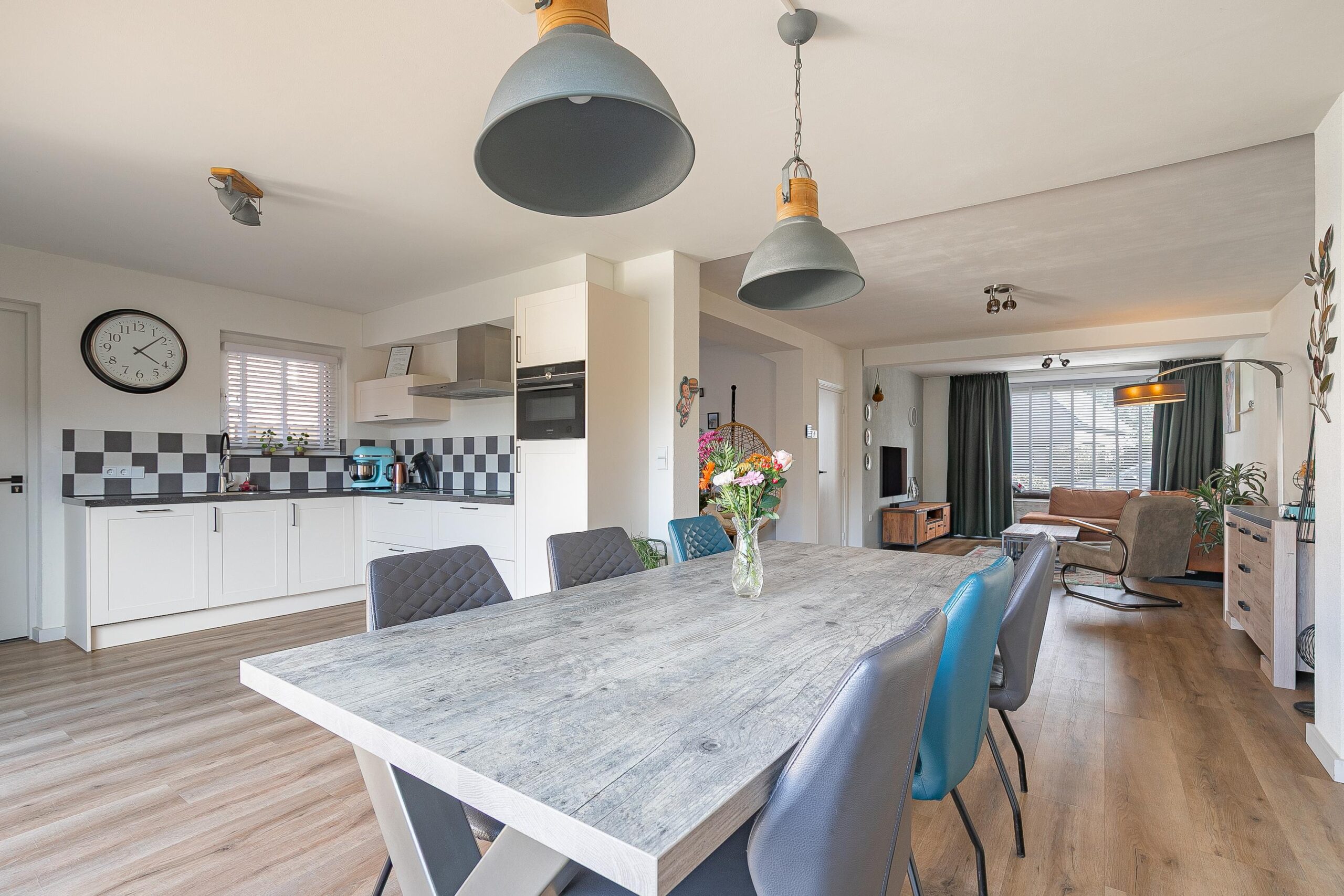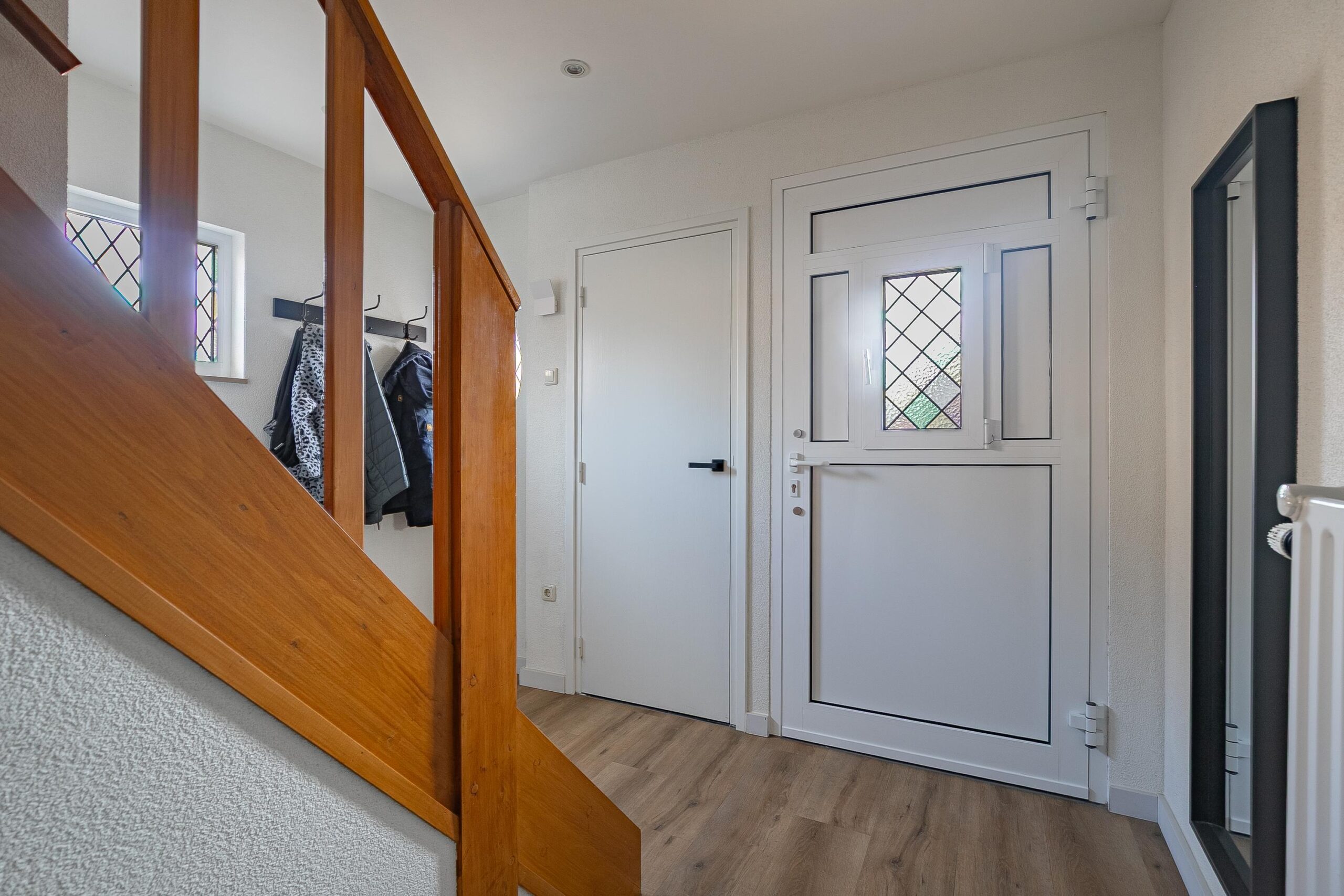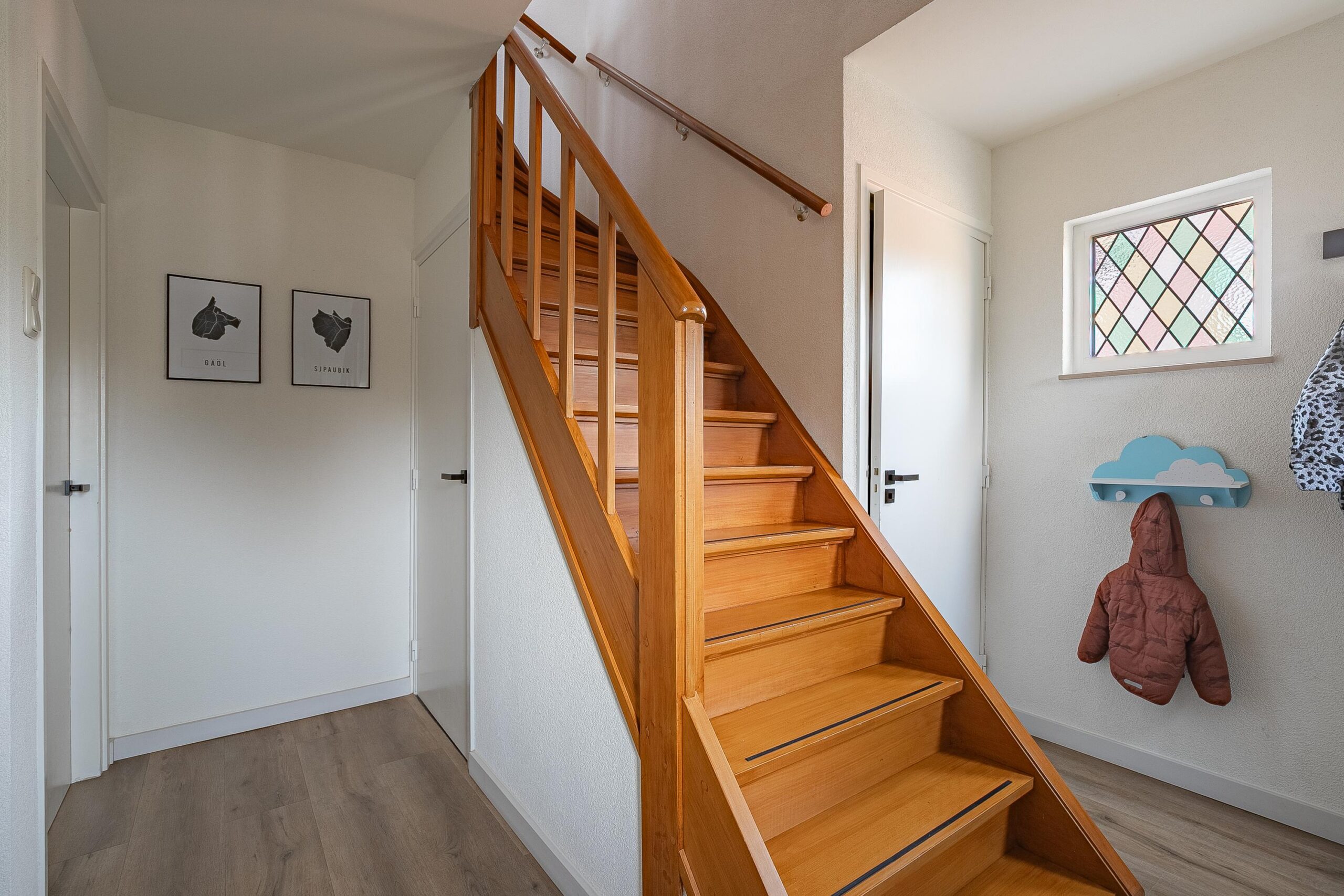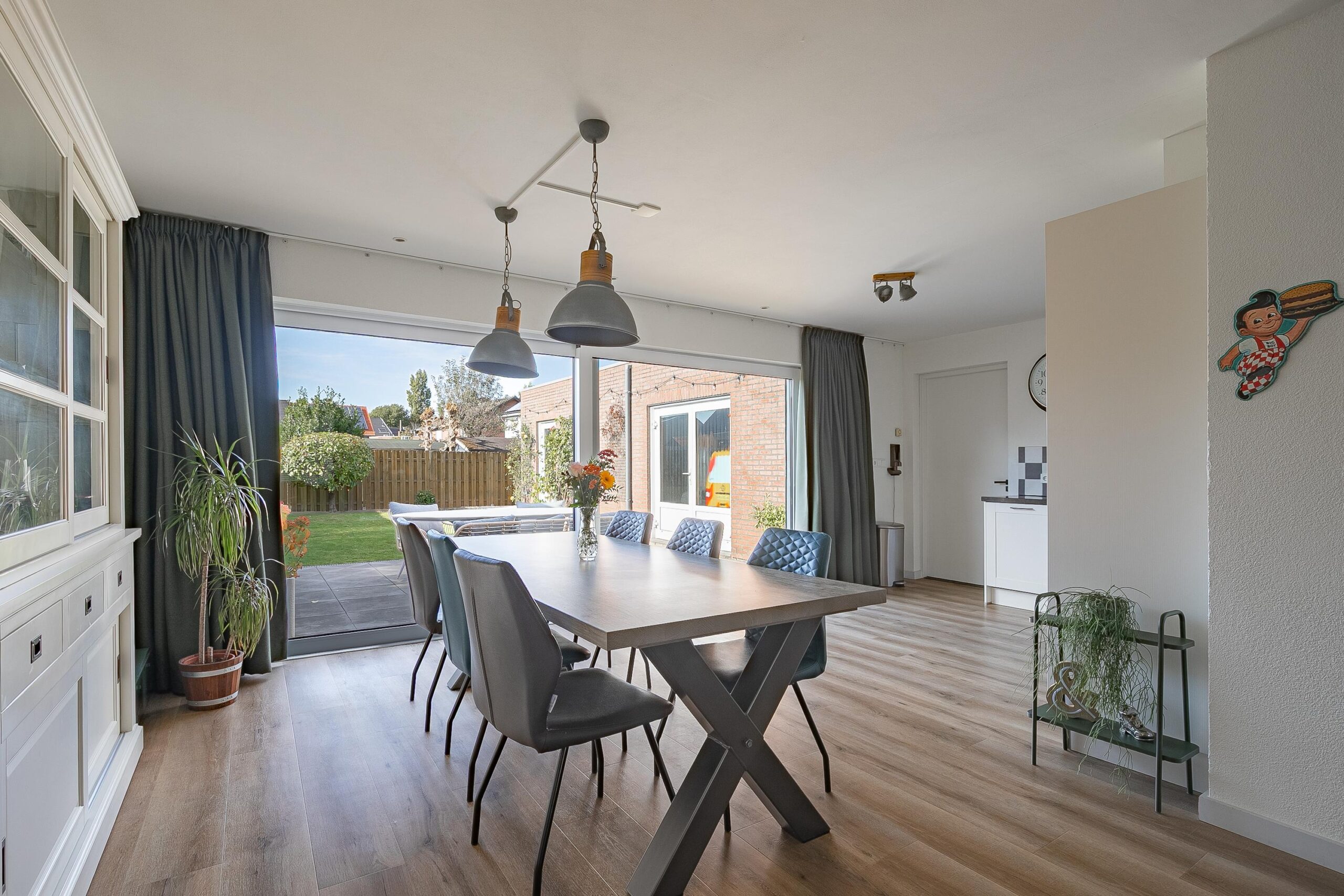 Overdekte entree. Hal met meterkast (vernieuwde groepenkast met 10 groepen en 2 aardlekschakelaars) en toilet met fonteintje. Sfeervolle, L-vormige woonkamer (ca. 38.8m²) met erker, pvc-vloeren en veel lichtinval. In de aanbouw gerealiseerde leefkeuken met moderne aanrechtcombinatie voorzien van de volgende apparatuur: inductie kookplaat, combimagnetron, vaatwasser, koelkast, spoelbak en afzuigkap. Tevens is in de keuken een schuifpui naar de achtertuin. Verwarmde, inpandig bereikbare, royale garage (ca. 37.1m² / 8,74 x 4.24 meter) met elektrisch bedienbare sectionaalpoort. In de garage zijn tevens de witgoedaansluitingen en is de opstelling van de CV-combiketel (merk Nefit, bwjr. 2017, eigendom). Achter de garage is een extra berging (ca. 10.6m²) die van buiten en via de garage bereikbaar is. Voor de garage is nog een overdekte entree. Geheel omsloten achtertuin met veel privacy. Naar achter toe is een vrij uitzicht.
