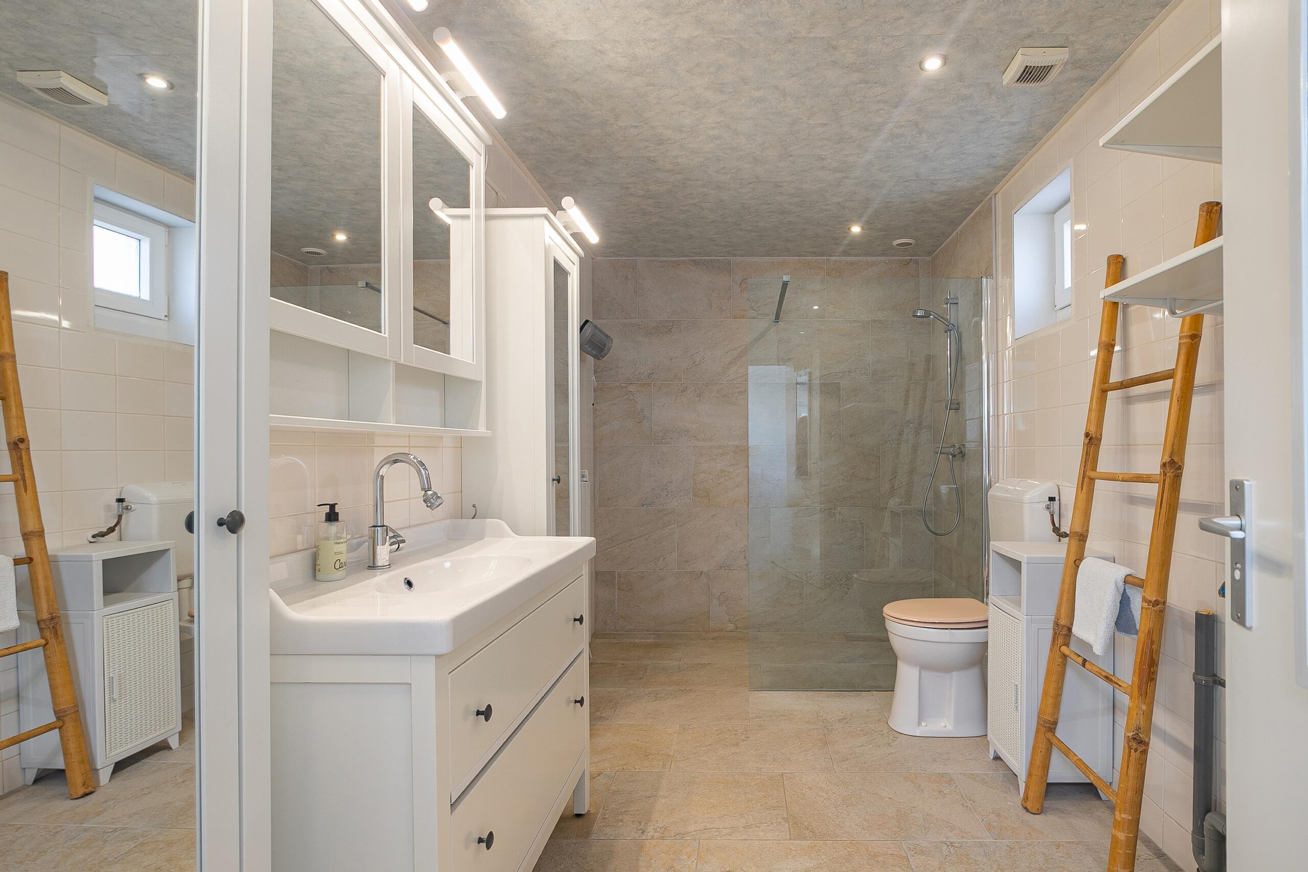 - Badkamervoorzieningen Toilet, wastafelmeubel, inloopdouche, wasmachineaansluiting