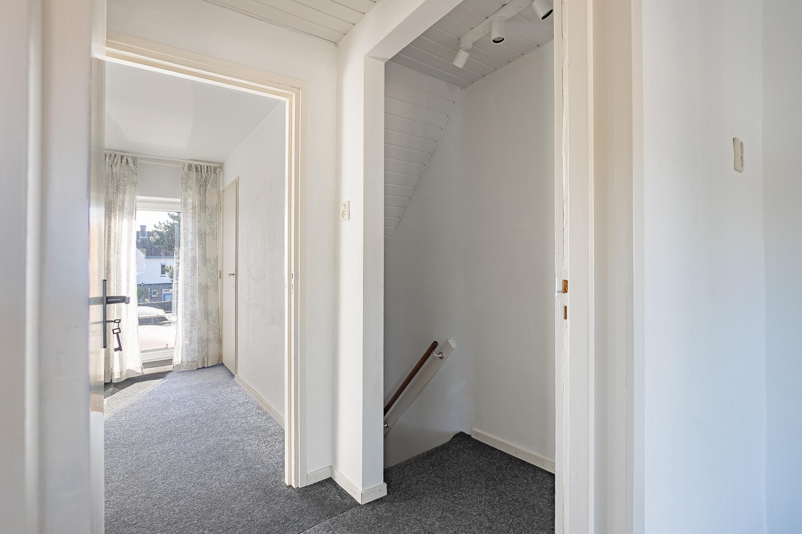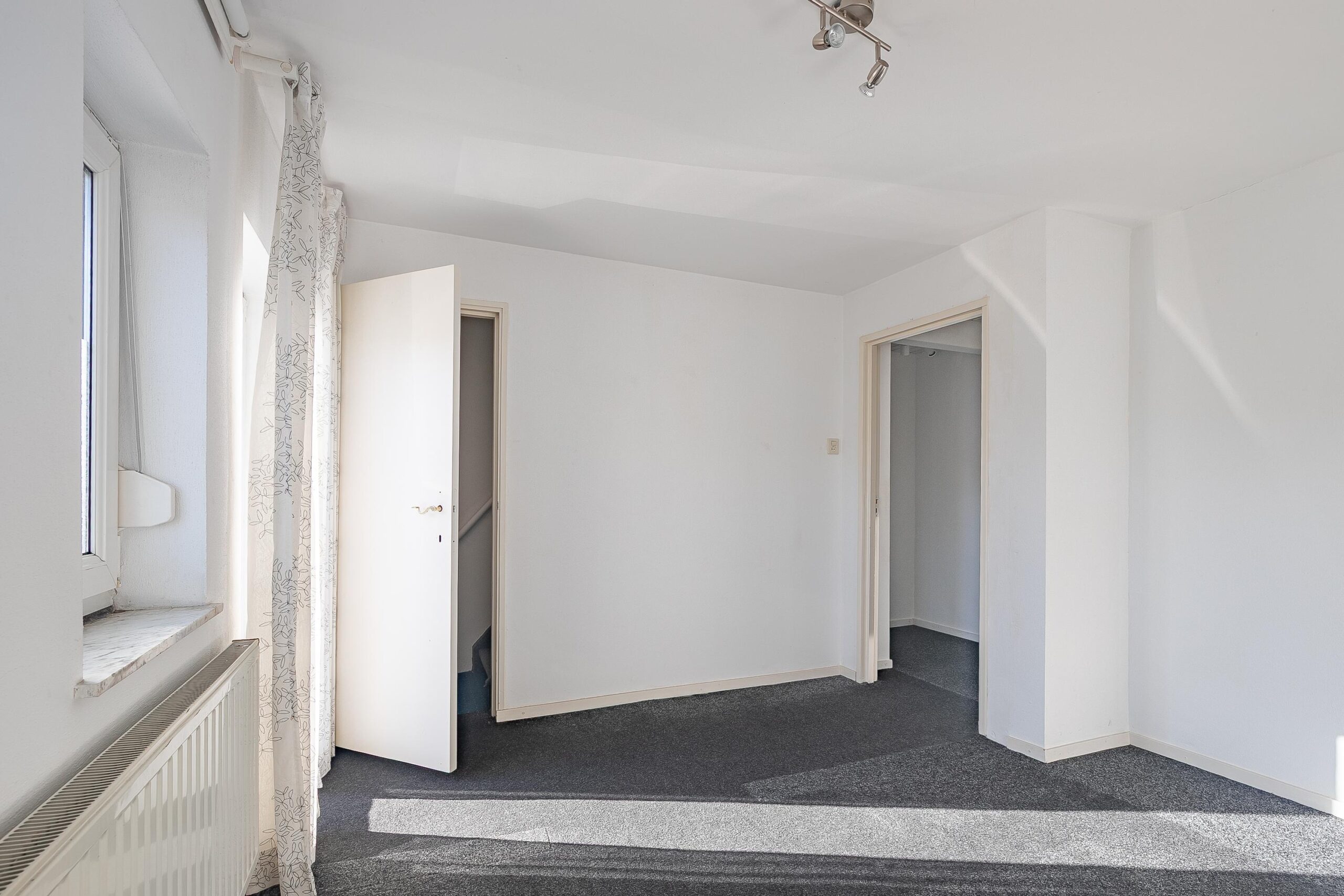 Overloop met toegang tot twee slaapkamers van respectievelijk ca. 16 m² en 12 m², beide voorzien van een donkere vloerbedekking. De slaapkamer aan de achterzijde van de woning biedt toegang tot de zolderverdieping.