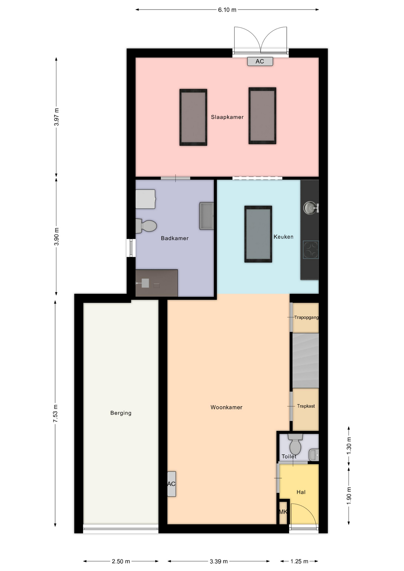 – Voorzien van twee airco’s die tevens verwarmen;