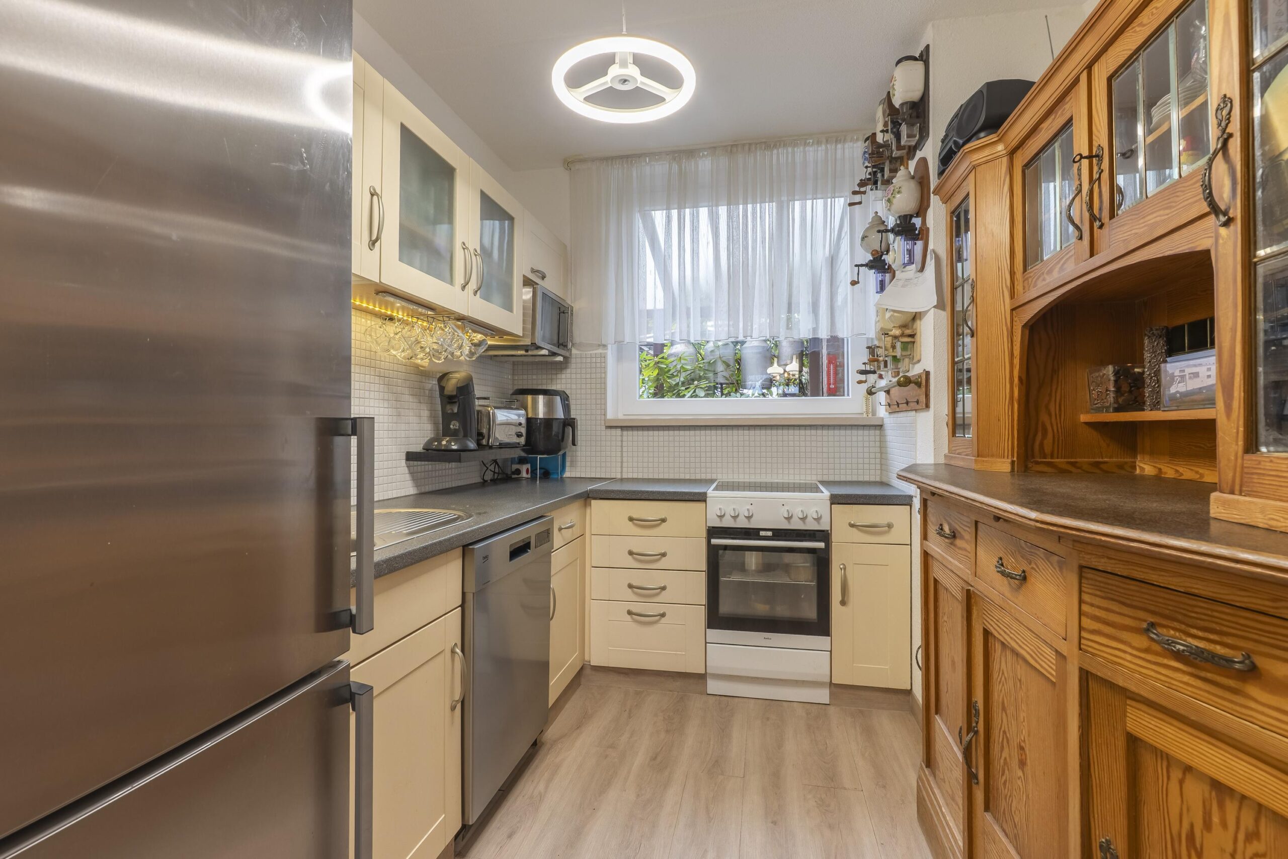 Begane grond: bestrate voortuin/ oprit en garage. Overdekte entree, verruimde hal, betegeld toilet met fonteintje, moderne meterkast en trappenhuis. Vanuit de hal is de garage inpandig te bereiken. De garage heeft een electrisch bedienbare kantelpoort en een vliering; ideaal voor opslag. Tevens is vanuit de hal de woonkamer bereikbaar met tegelvloer en een trapkast. De gesloten keuken heeft een laminaatvloer en een keuken-opstelling voorzien van een koel-, vriescombinatie, elektrische kookplaat, vaatwasser, oven en magnetron.