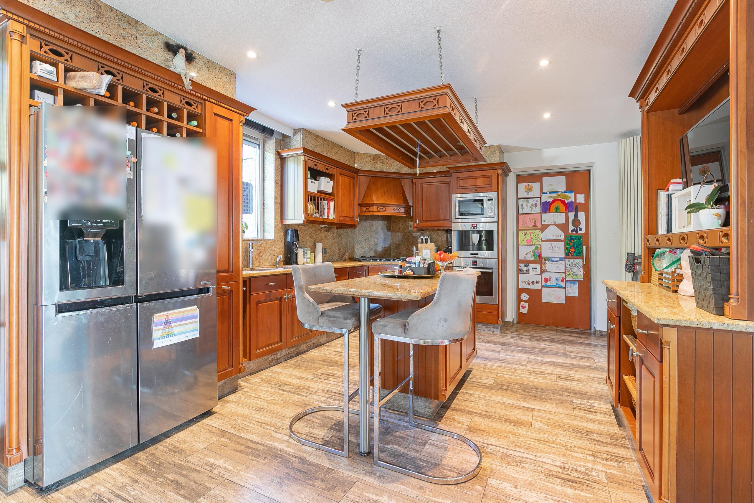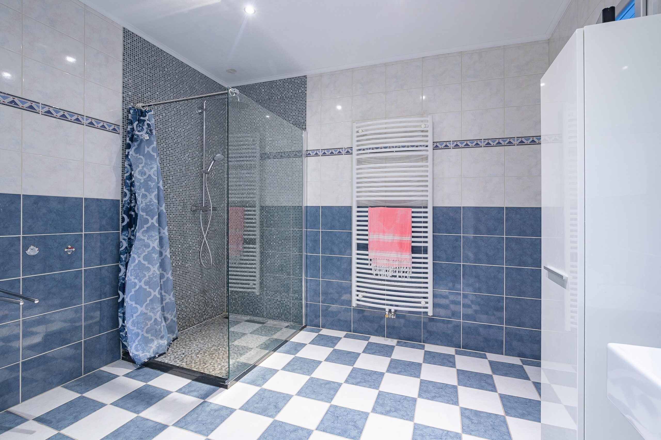 De ruime hal met meterkast, toilet en trapopgang vormt de entree naar de woning. De royale woonkamer (ca. 69 m²) met gashaard is een lichte, uitnodigende leefruimte waar modern comfort en gezelligheid samenkomen. De tegelvloer met vloerverwarming loopt over de begane grond. De leefkeuken (ca. 44 m²) is voorzien van een kookeiland en uitgerust met hoogwaardige inbouwapparatuur waaronder een dubbele spoelbak, 5-pits kookplaat met wokbrander, ingebouwde koffiemachine, magnetron, oven, vaatwasser en Amerikaanse koelkast. Vanuit de keuken heeft men directe toegang tot de inpandige garage en de praktische bijkeuken, voorzien van wasmachineaansluitingen en een ingebouwde Bosch-plaat met frituur en grill. De garage biedt niet alleen ruimte voor twee auto’s, maar is ook voorzien van een extra badkamer met douche, toilet en wastafel. Dit is ideaal voor gasten of na een dag in de tuin.