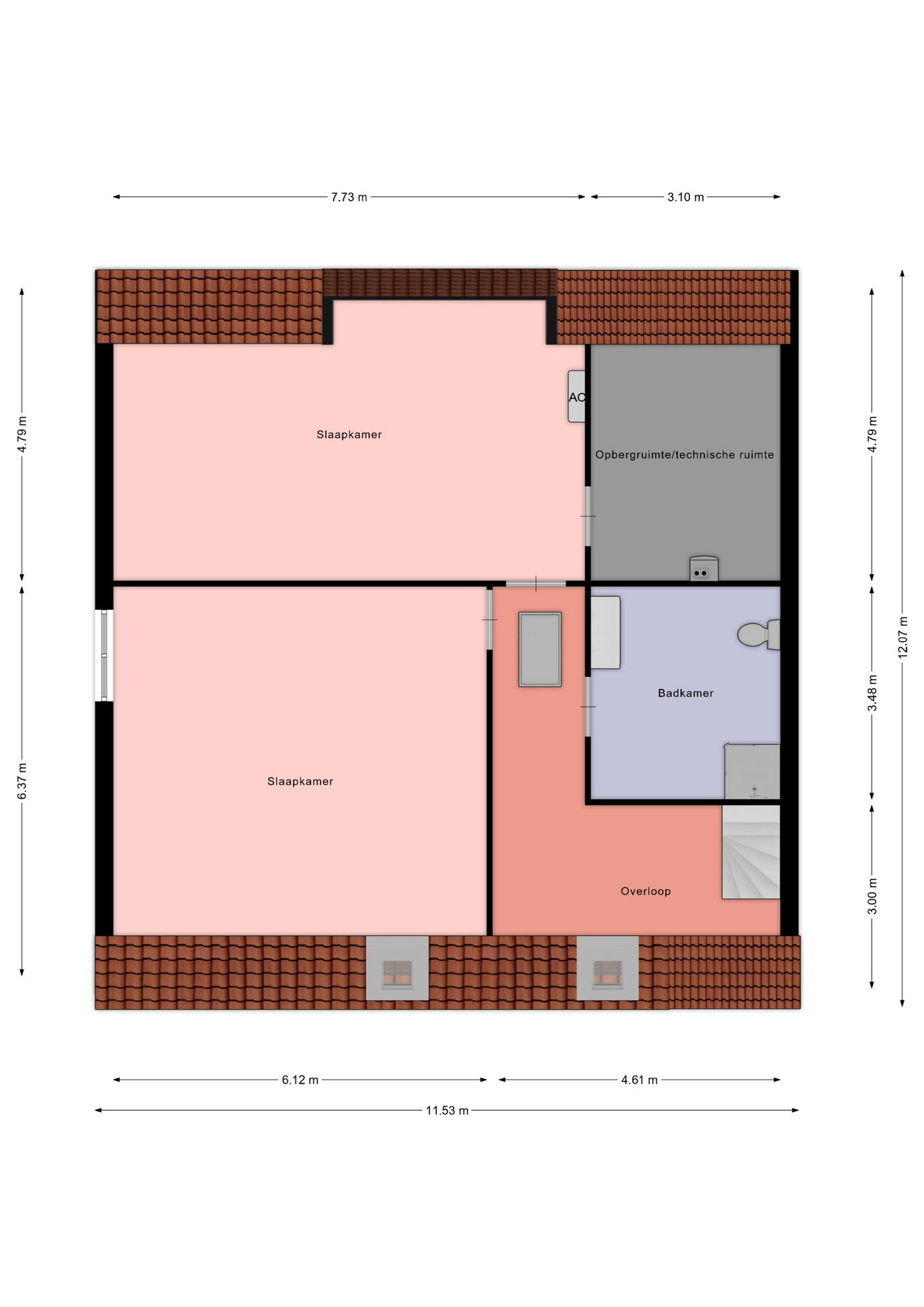 Via een vlizotrap te bereiken vliering met een stahoogte van 1,13 m die extra bergruimte biedt.