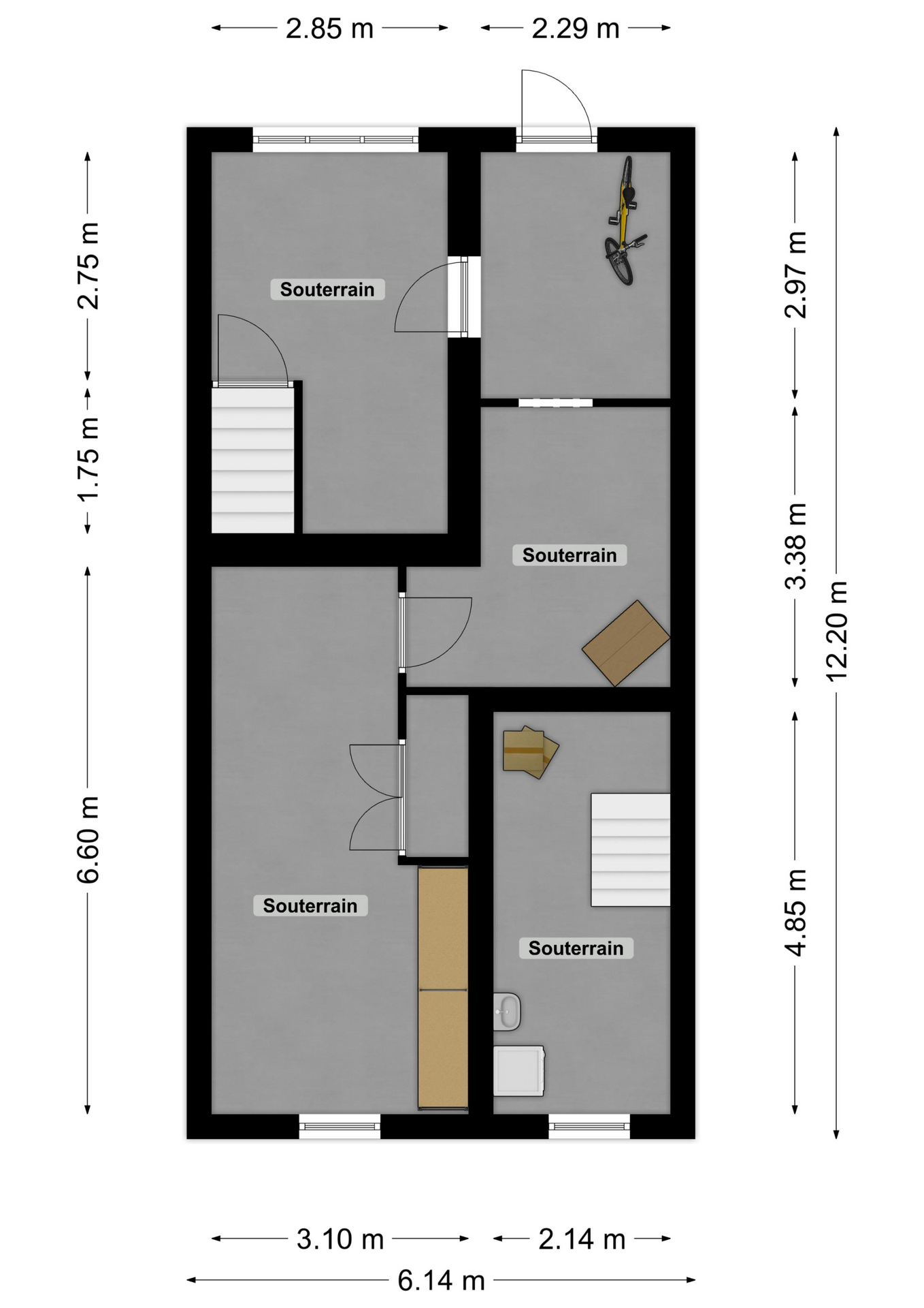 Vanuit de hal bereikbare originele provisiekelder (ca. 10 m2) met betonvloer en witgoedaansluitingen. Vanuit de woonkamer en de kelder is de rest van de kelders bereikbaar, verdeeld over vier ruimtes van resp. ca. 11, 7 ,9 en 17 m2 met beton/tegelvloeren.