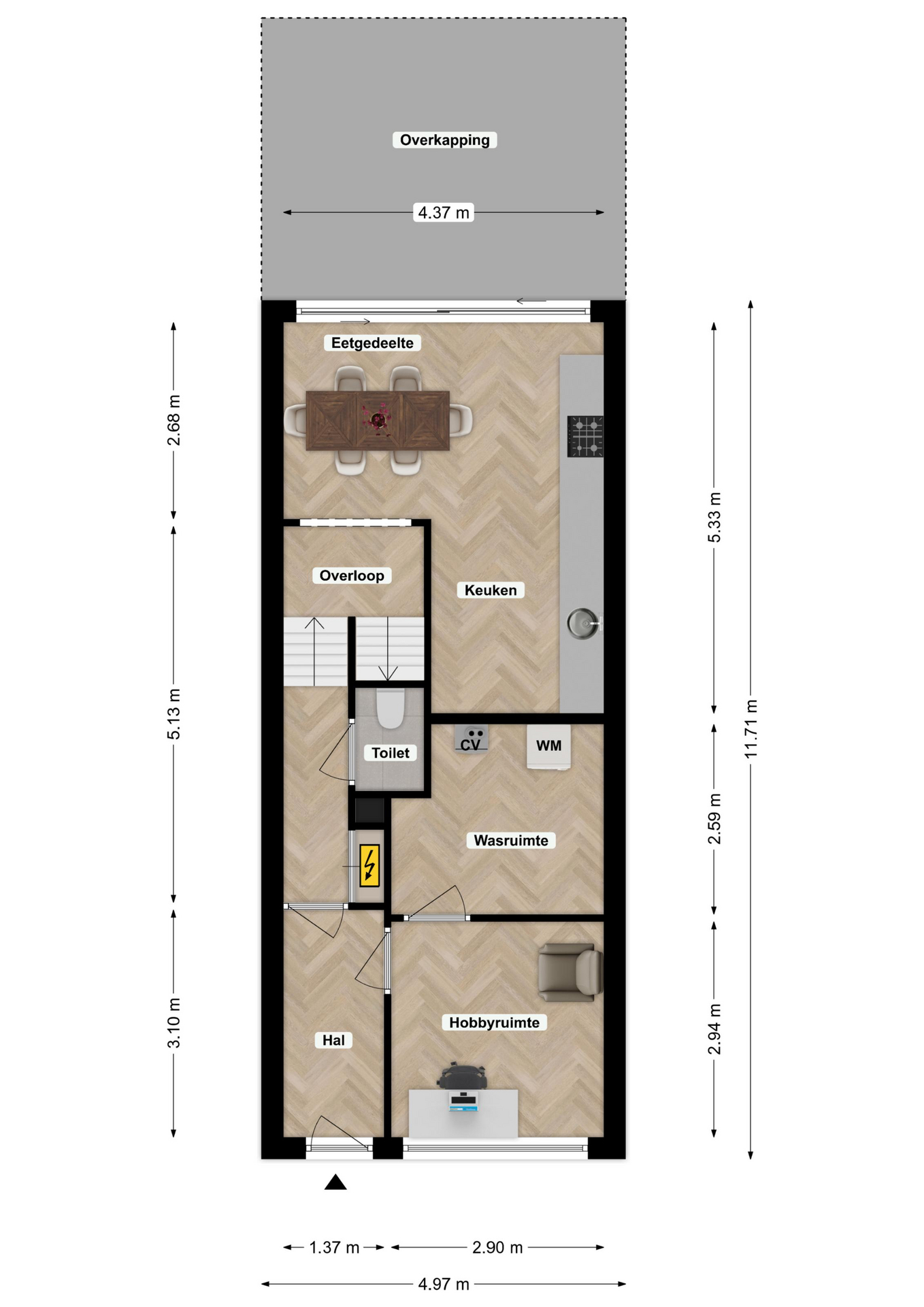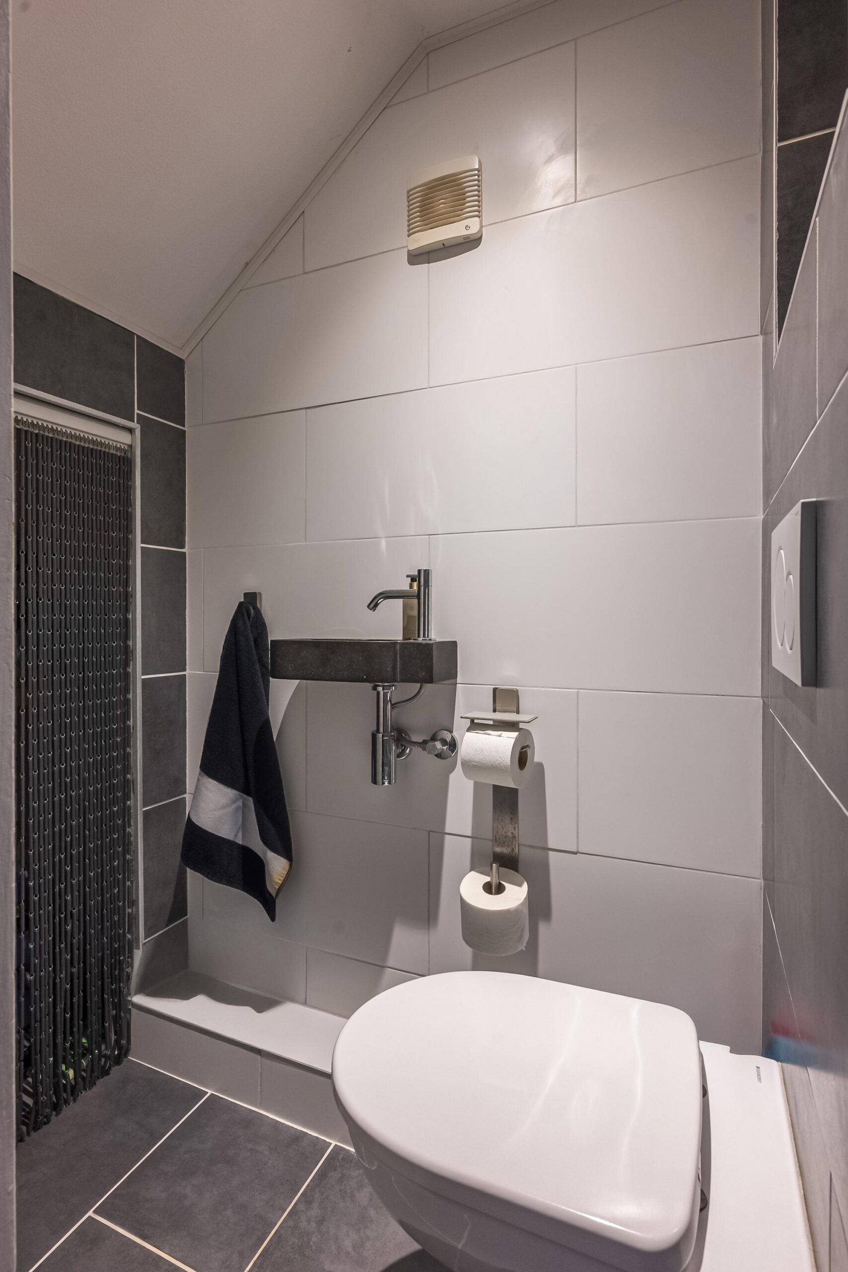 Via de overdekte entree bereikt u de ontvangsthal met garderobe, vernieuwde meterkast en een modern, geheel betegeld vrijhangend toilet met fonteintje en mechanische afzuiging.