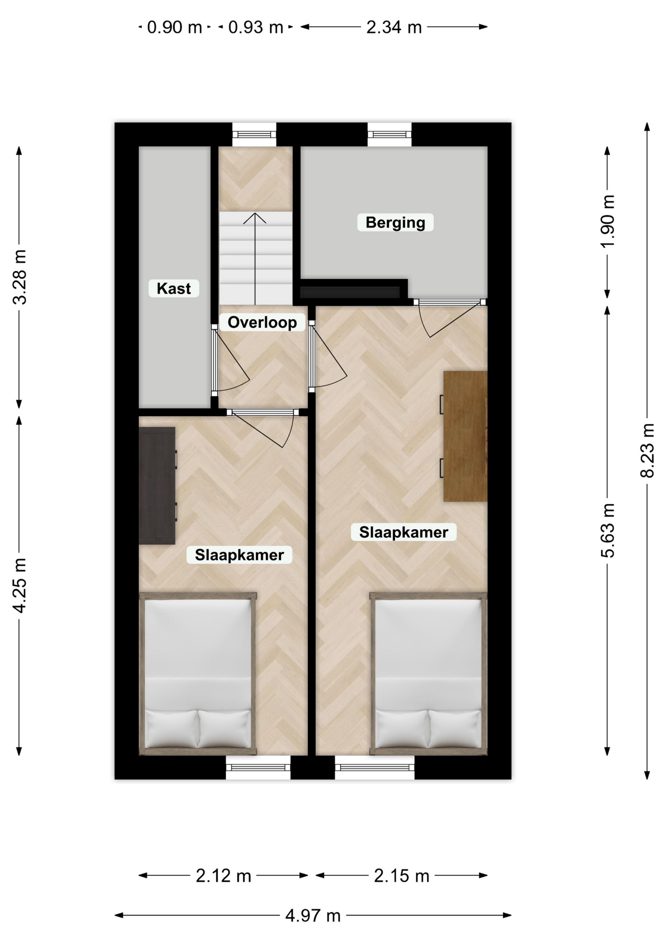 Op de bovenste verdieping bevindt zich een overloop met diepe bergkast en toegang tot twee ruime slaapkamers (3 en 4). Beide slaapkamers beschikken over rolluiken en een verlaagd plafond met inbouwverlichting.