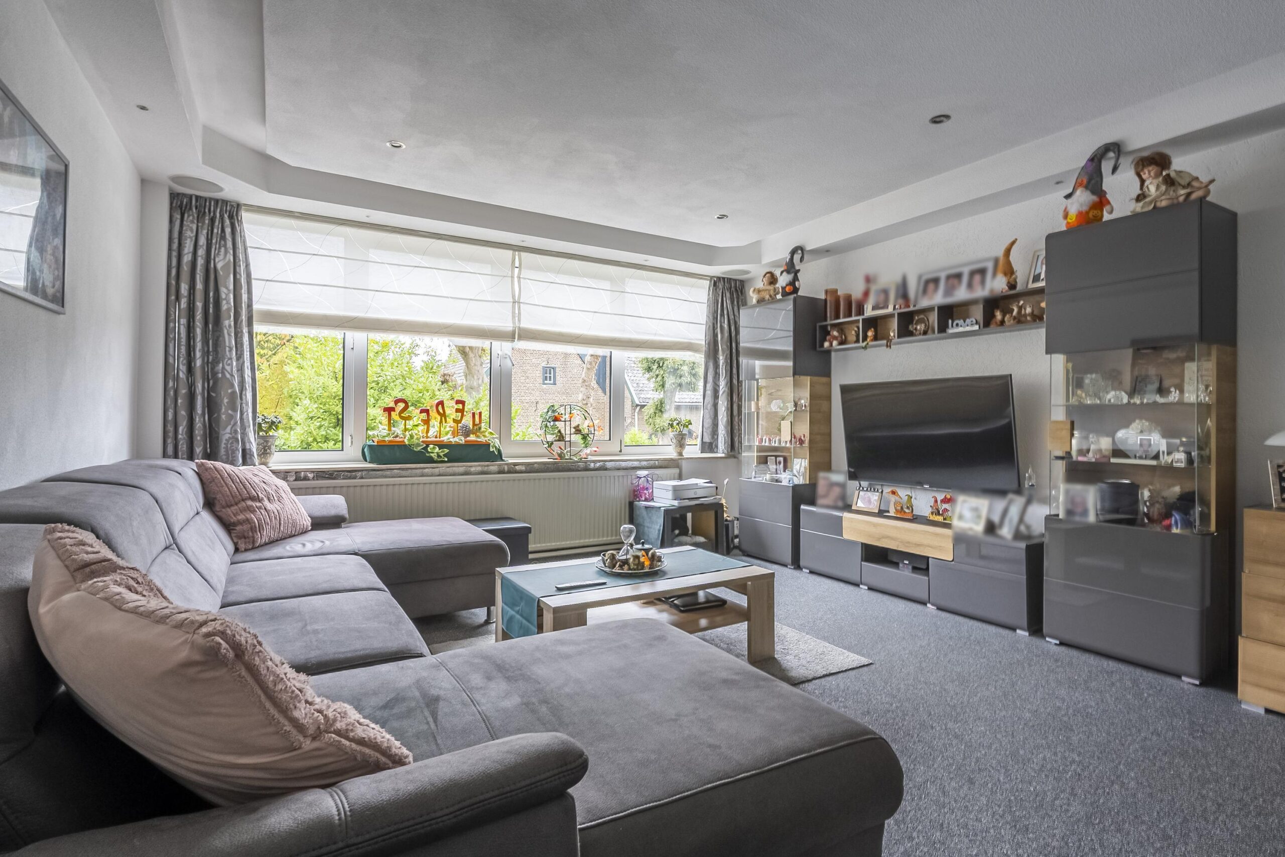 De gezellige, vierkante woonkamer beschikt over een siergrindvloer, een verlaagd plafond met geïntegreerde ledverlichting en een royale raampartij aan de voorzijde, wat zorgt voor een prachtige lichtinval. Daarnaast is de woonkamer uitgerust met een geïntegreerd surround-audiosysteem.