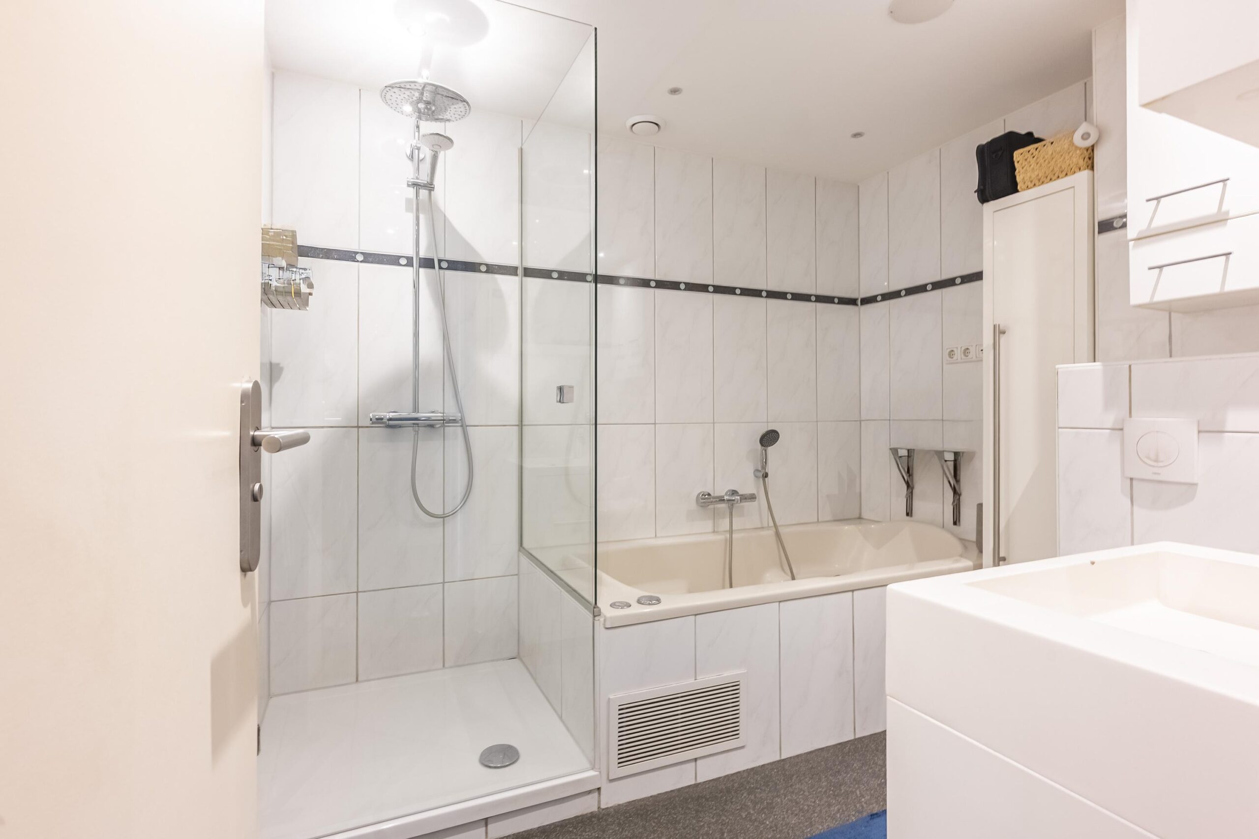 Via een melkglazen deur bereikt u de tussenliggende overloop met toegang tot de hoofdslaapkamer (voorzien van airco) en de aangrenzende badkamer. De volledig betegelde badkamer is uitgerust met elektrische vloerverwarming, een whirlpool, tweede vrijhangend toilet, wastafel en een inloopdouche met hardglazen deur en mechanische afzuiging.