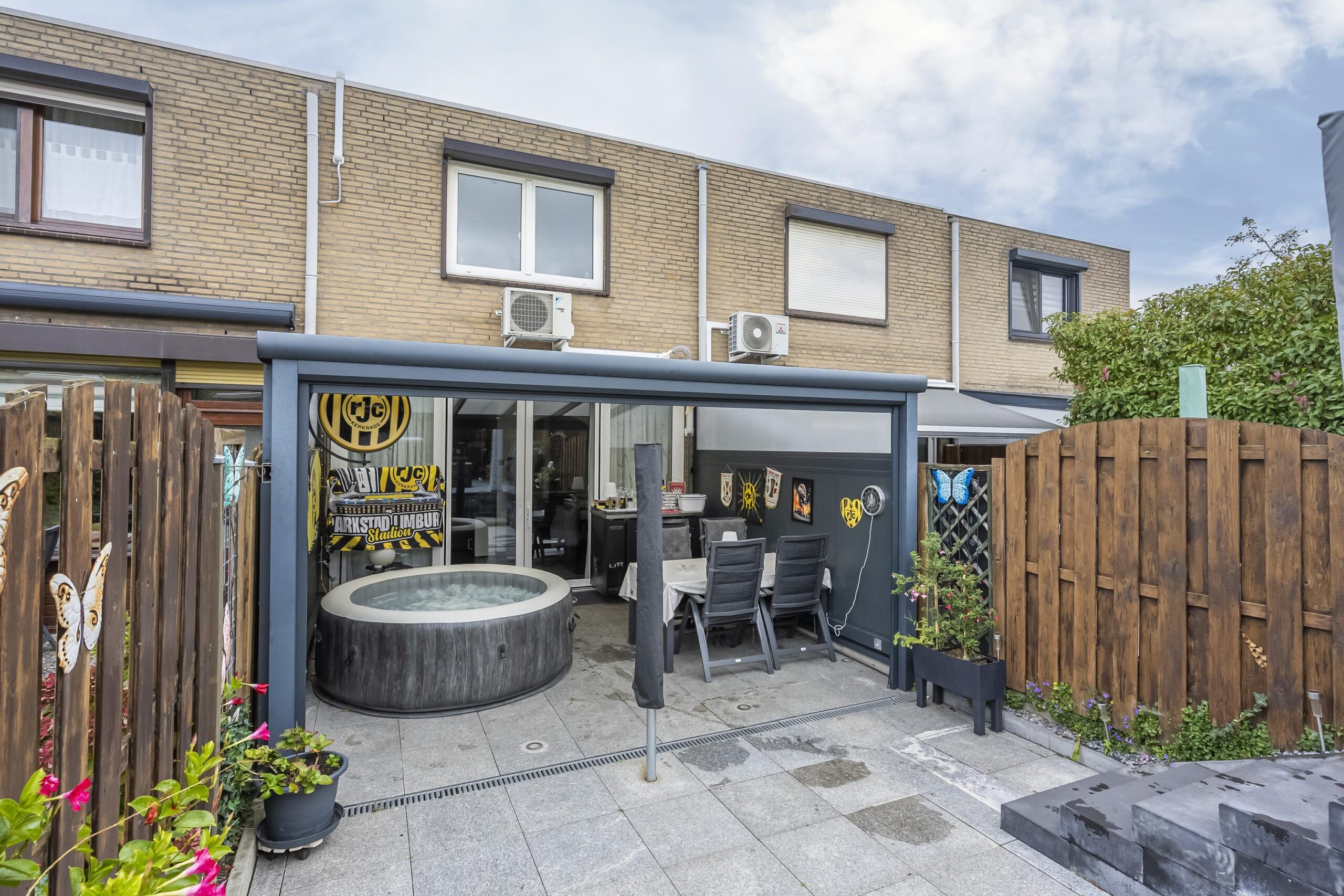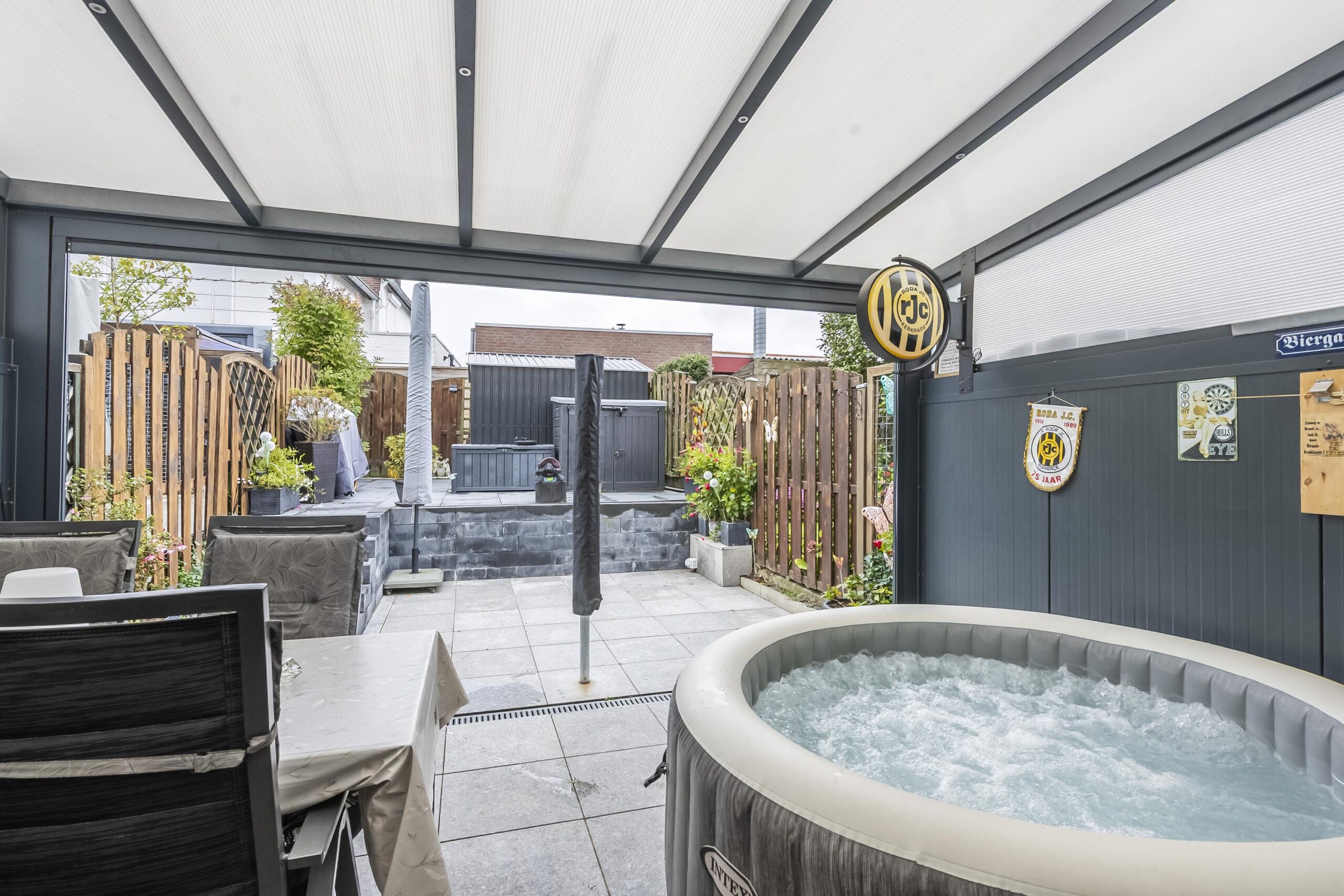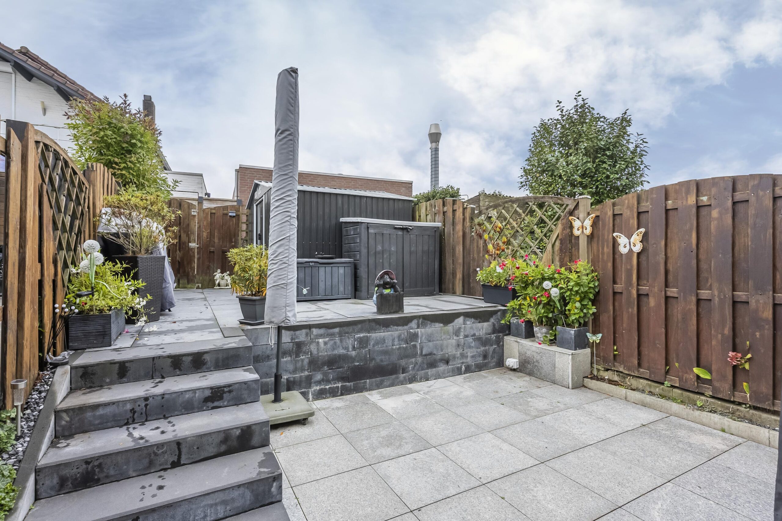 Via de dubbele schuifpui in de woonkamer en het poortje aan de achterzijde bereikt u de onderhoudsvriendelijke tuin, die is aangelegd op twee niveaus. De tuin is zorgvuldig ingericht en beschikt over een praktische aluminium buitenberging. Onder de ruime overkapping, voorzien van ledverlichting en een elektrisch bedienbaar screen, kunt u het hele jaar door beschut en comfortabel buiten zitten.