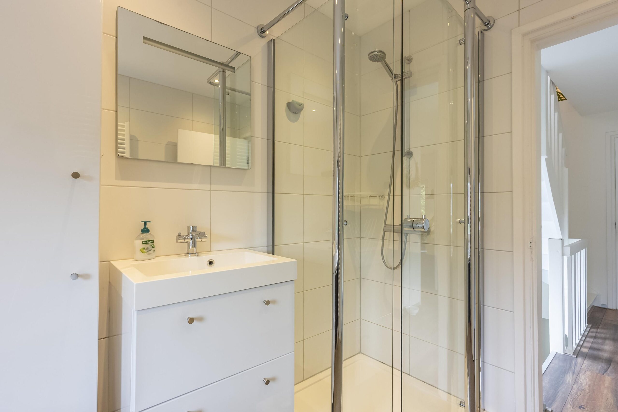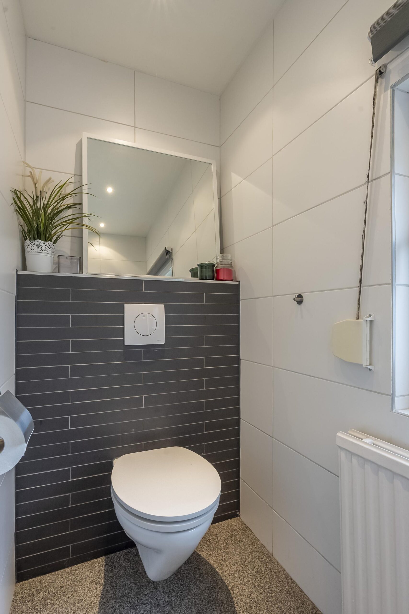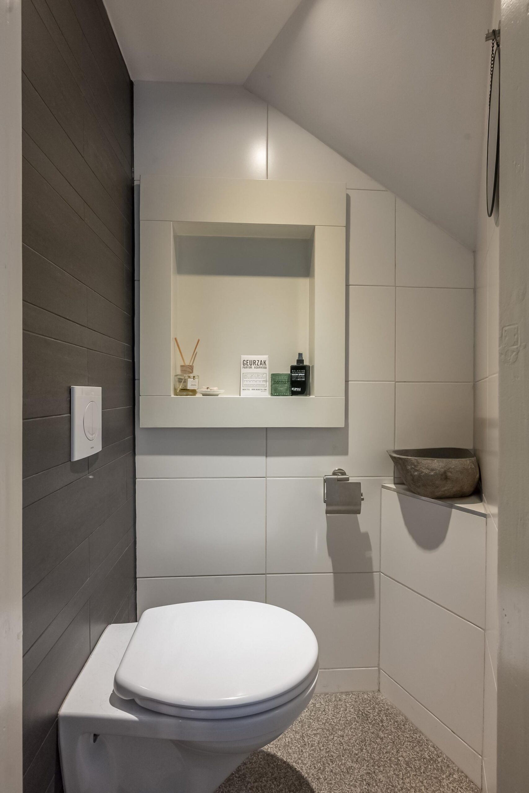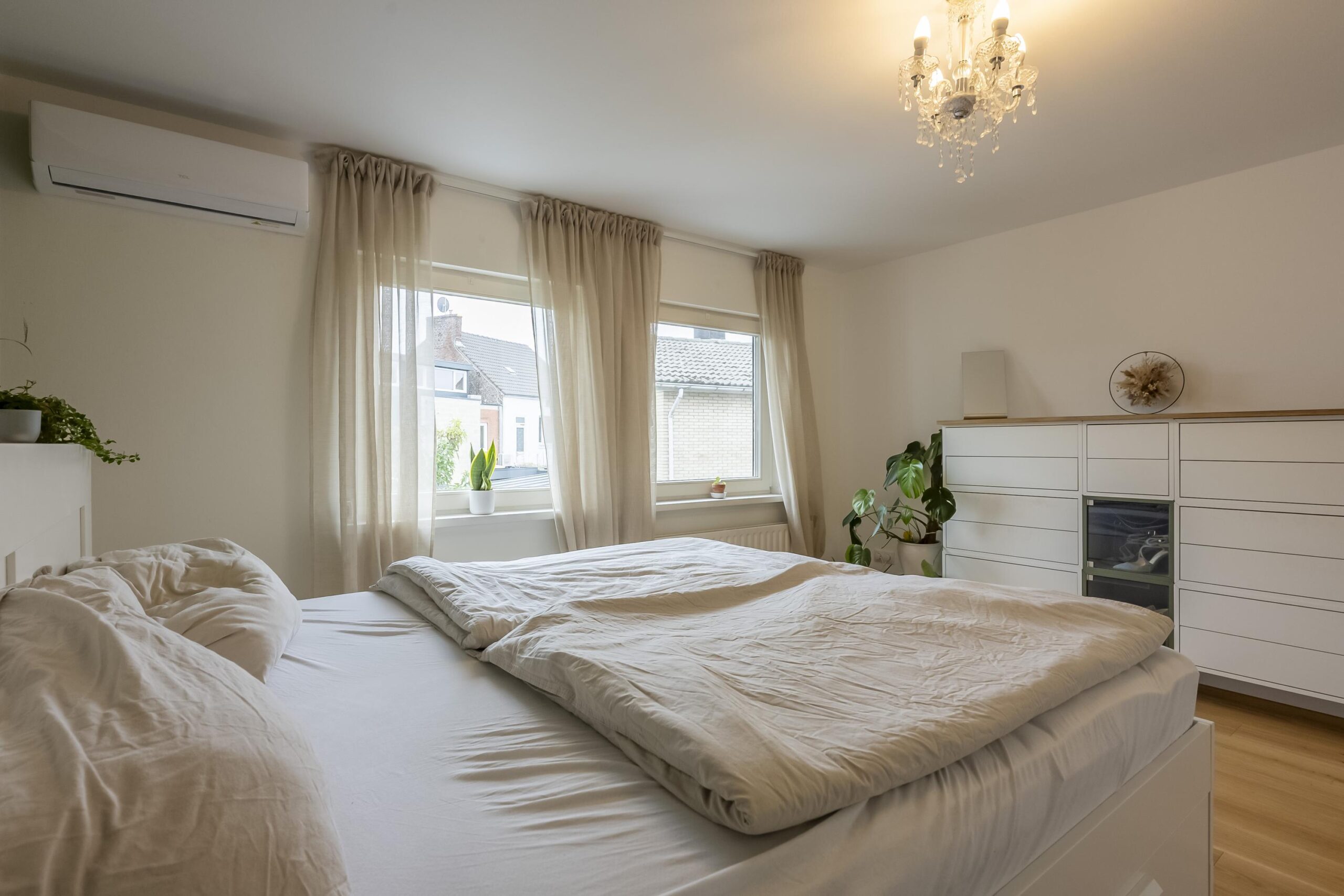 Eerste verdieping: overloop, twee slaapkamers met parketvloer en airco-installatie. De geheel betegelde badkamer heeft een duo ligbad, een separate douche, een wastafelmeubel en design radiator. Op deze verdieping bevindt zich ook een tweede toilet, separaat van de badkamer.