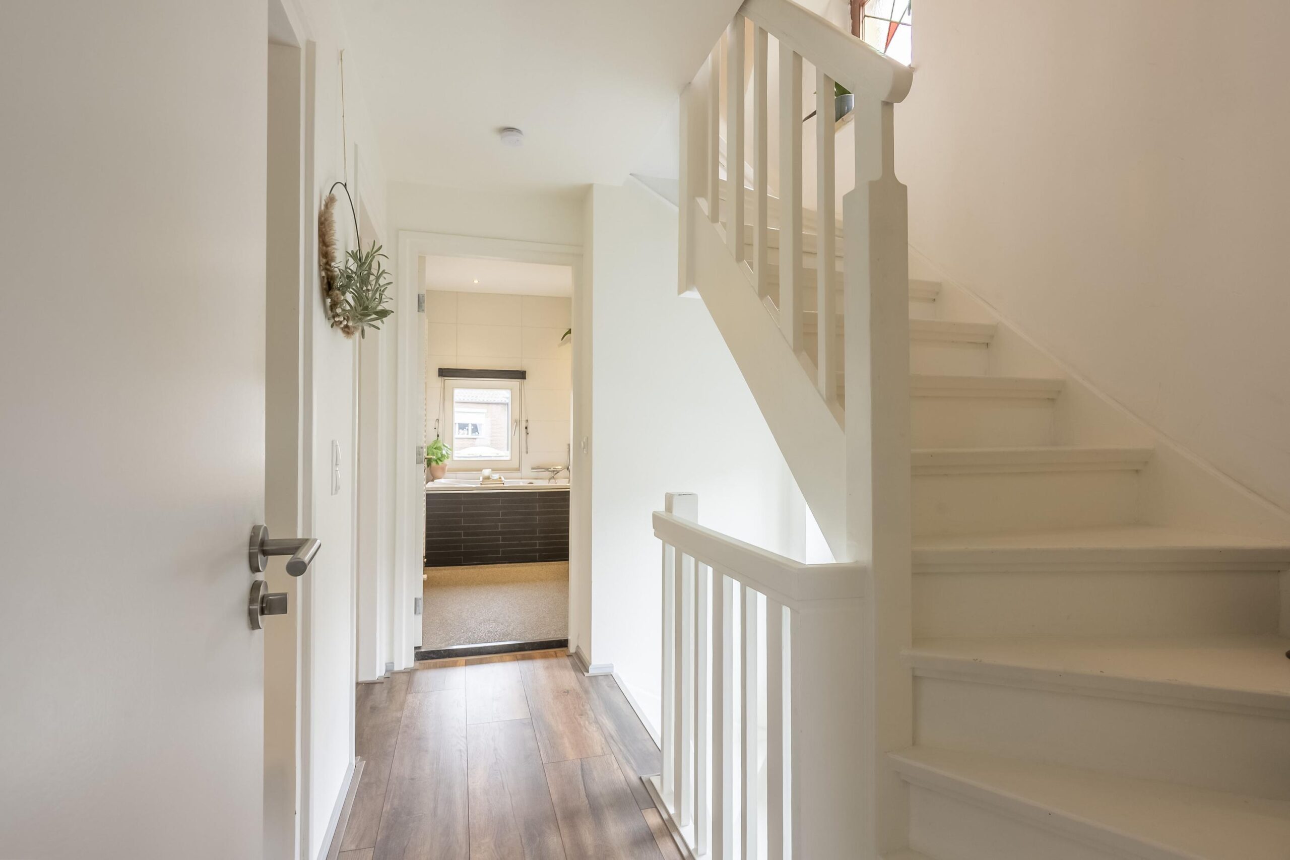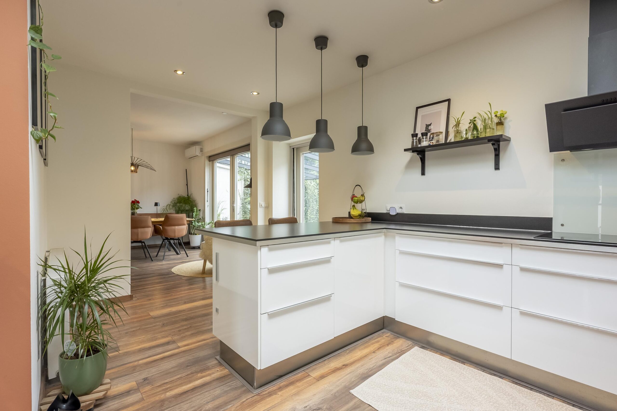 Begane grond: hal met garderobe, moderne meterkast, trappenhuis en het geheel betegelde zwevende toilet. De woonkamer met doorlopende laminaatvloer heeft openslaande deuren naar de tuin en een open keuken welke in de aanbouw is gelegen en voorzien is van een fraaie lichtstraat voor veel lichtinval. De moderne keuken-installatie heeft een U-opstelling en is voorzien van inbouwapparatuur waaronder een koelkast, combi-oven, inductiekookplaat, afzuigkap en vaatwasser en een (ontbijt)barretje maakt het geheel compleet. Tevens ligt hier aansluitend een extra ruimte welke dienst kan doen als kantoor of bijkeuken en nu ook voorzien is van een wasmachine-aansluiting.