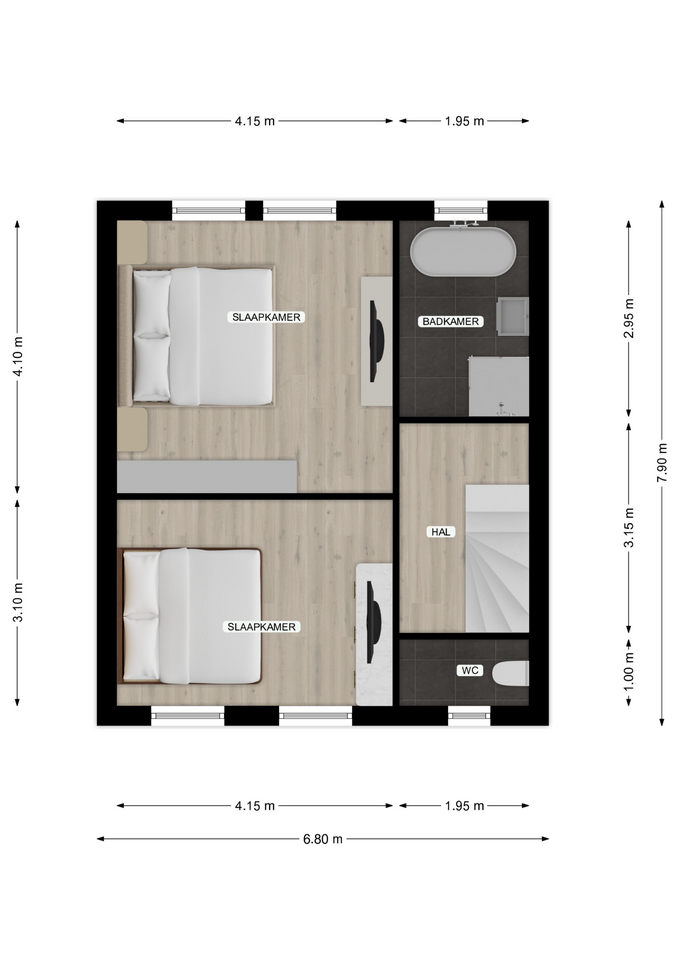 Tweede verdieping: vaste trap naar verdieping met overloop en een derde slaapkamer uitgebouwd met een dakkapel.
