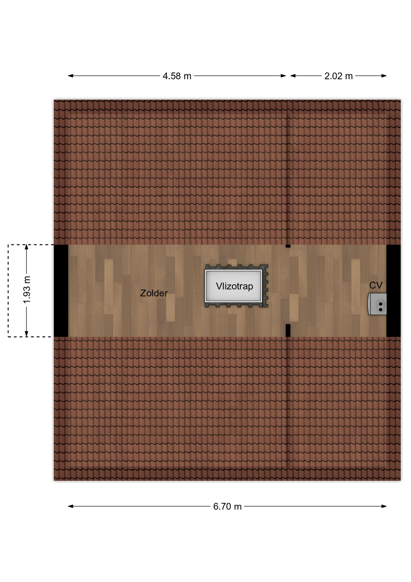 Via vlizotrap bereikbare bergzolder (nokhoogte van 1.93 meter) alwaar opstelling van de CV-Combiketel (merk Intergas, eigendom, bouwjaar 2021).