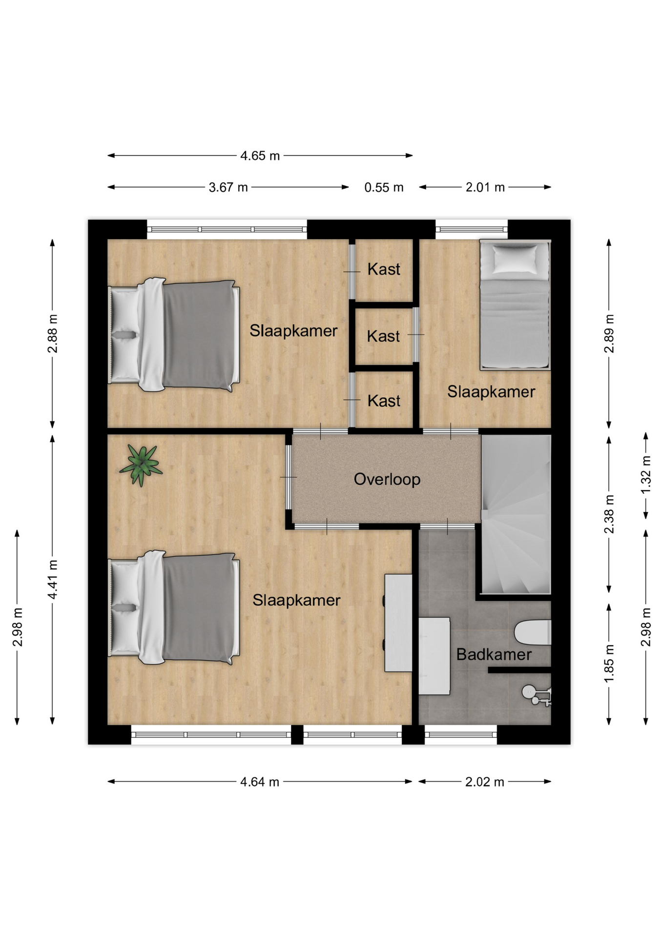 Overloop. Drie slaapkamers (resp. 17.8m², 10.6m² en 5.8m²). Oorspronkelijk waren in deze woning vier slaapkamers. De twee slaapkamers aan de voorzijde van de woning zijn samengevoegd tot één grote slaapkamer. De mogelijkheid bestaat om hier weer twee slaapkamers van te maken. De tweede slaapkamer heeft twee muurkasten, de derde slaapkamer heeft één muurkast. Moderne badkamer uit 2024 (ca. 4.8m²) met inloopdouche, wandcloset en badmeubel met vaste wastafel voorzien van twee kranen.