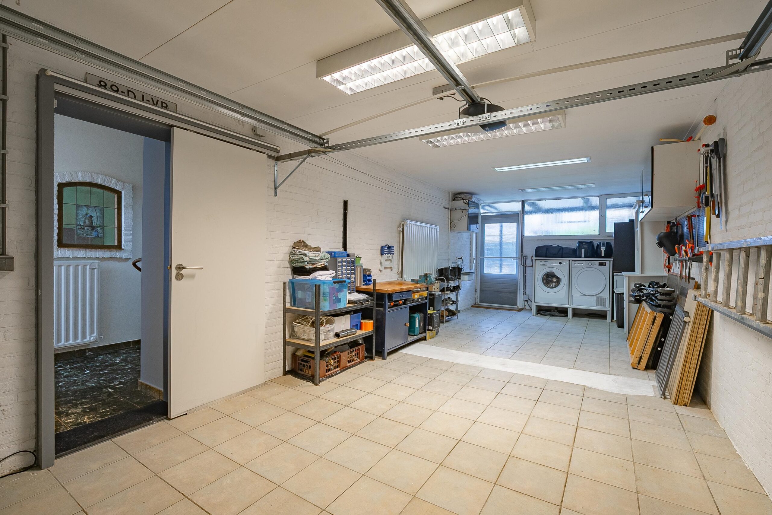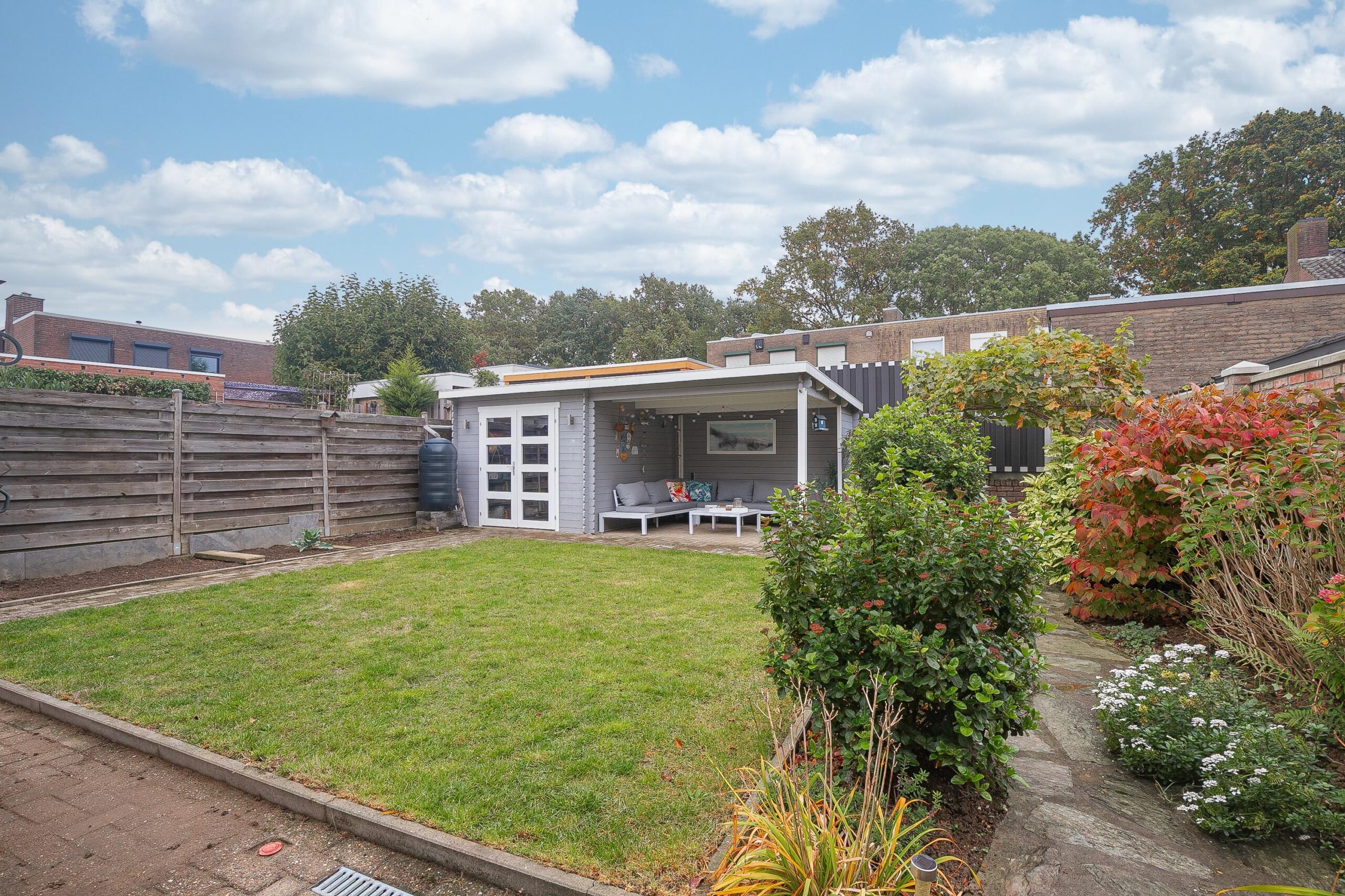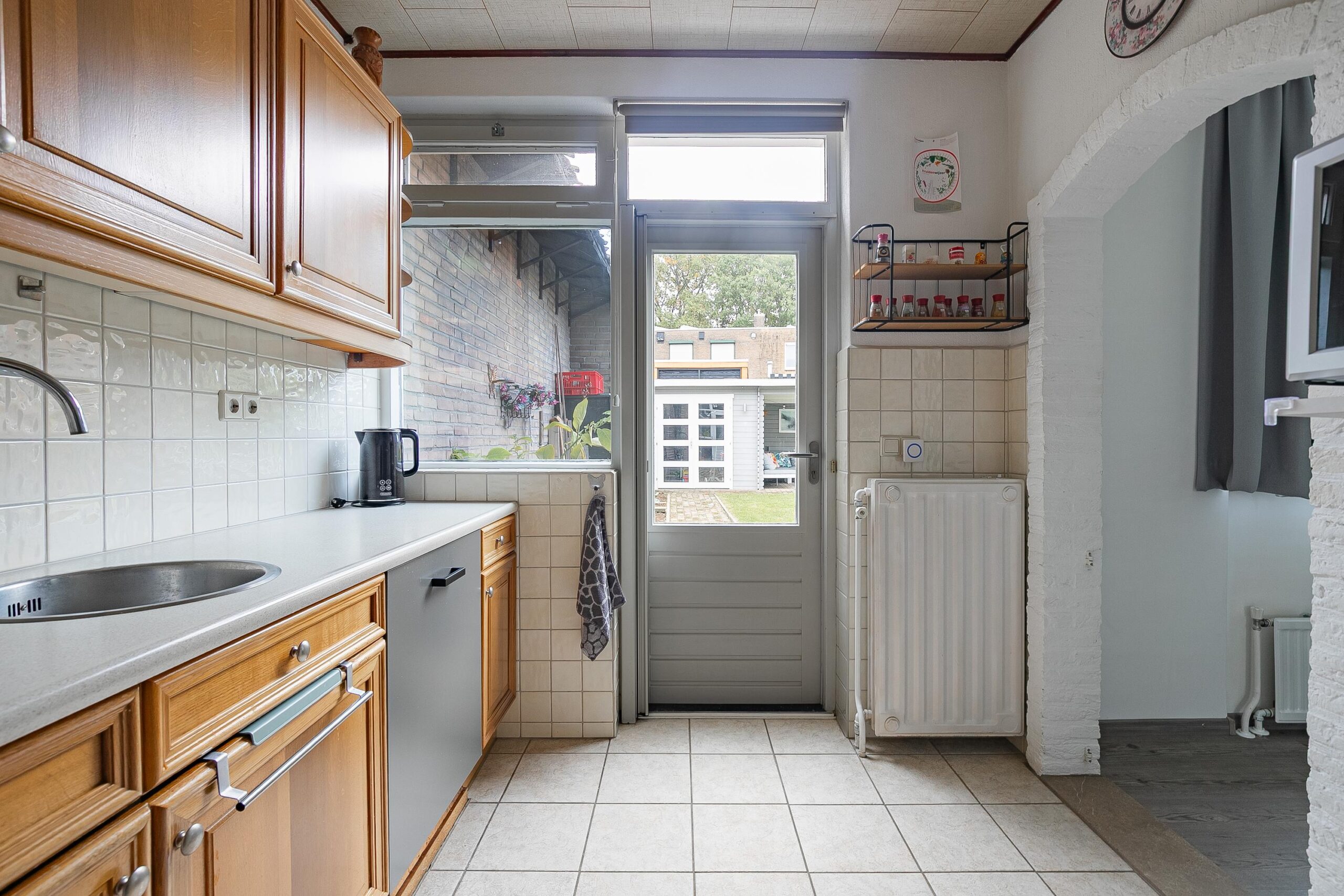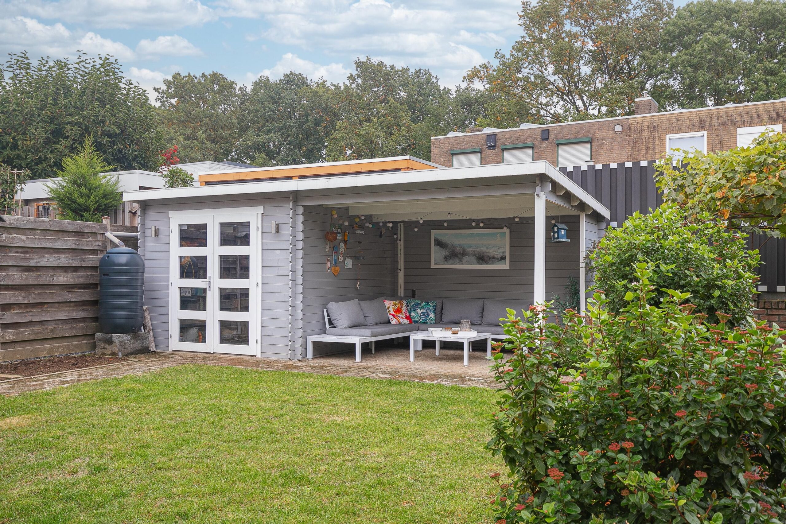 Hal met tegelvloer, meterkast (vernieuwde groepenkast met 10 groepen en 4 aardlekschakelaars) en toilet met wandcloset en wastafeltje. Z-vormige woonkamer (ca. 34m²) verdeeld in een zitkamer en een eetkamer. Keuken (ca. 7m²) met aanrechtcombinatie voorzien van de volgende apparatuur: inductie kookplaat, vaatwasser, spoelbak en afzuigkap. Verwarmde garage (ca. 28.5m²) met elektrisch bedienbare sectionaalpoort. In de garage zijn de witgoedaansluitingen. Achter de garage is een overkapping (ca. 7.7m²). Op het oosten georiënteerde, geheel omsloten achtertuin met houten tuinhuis (ca. 7.3m²) met overkapping (ca. 8.7m²).