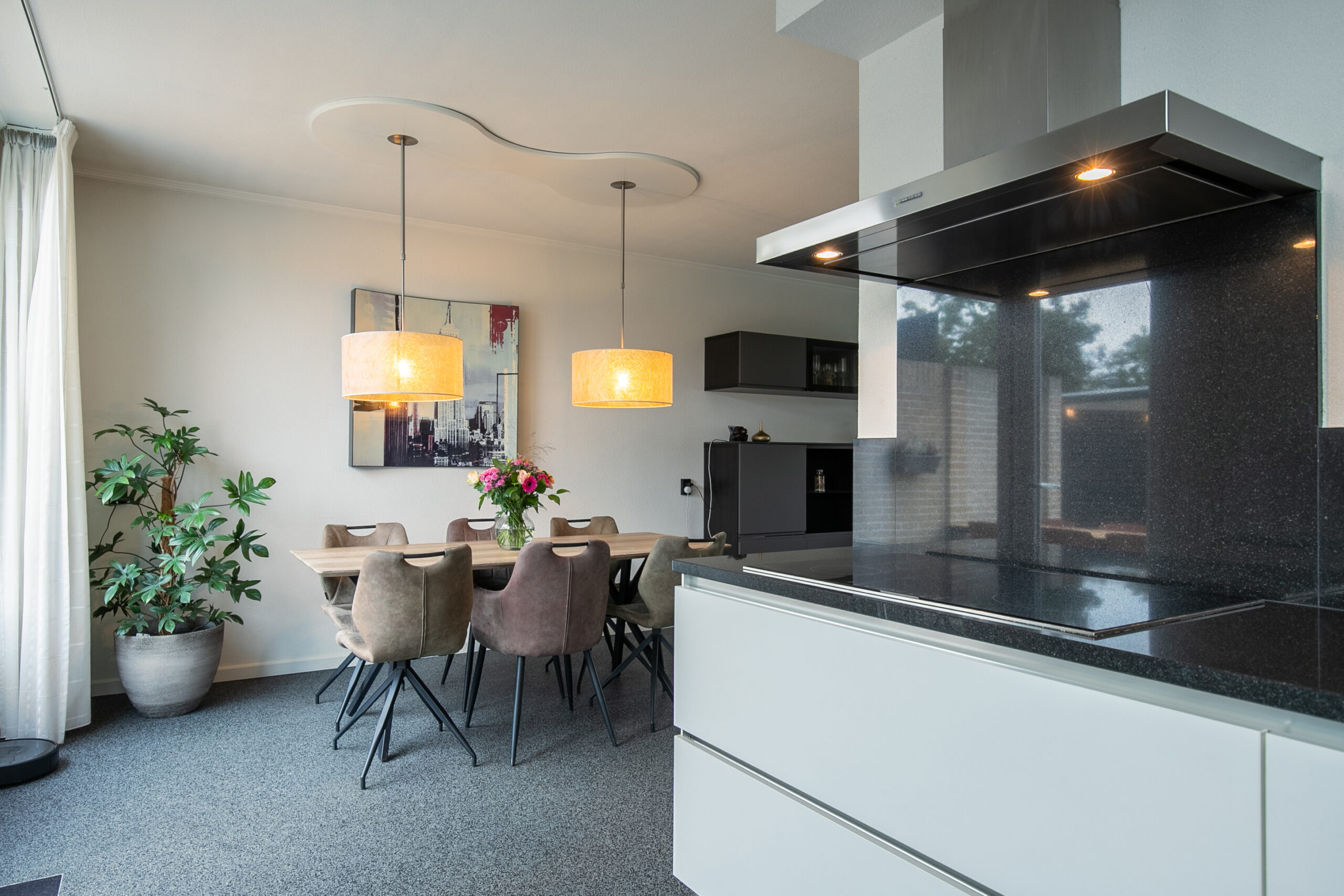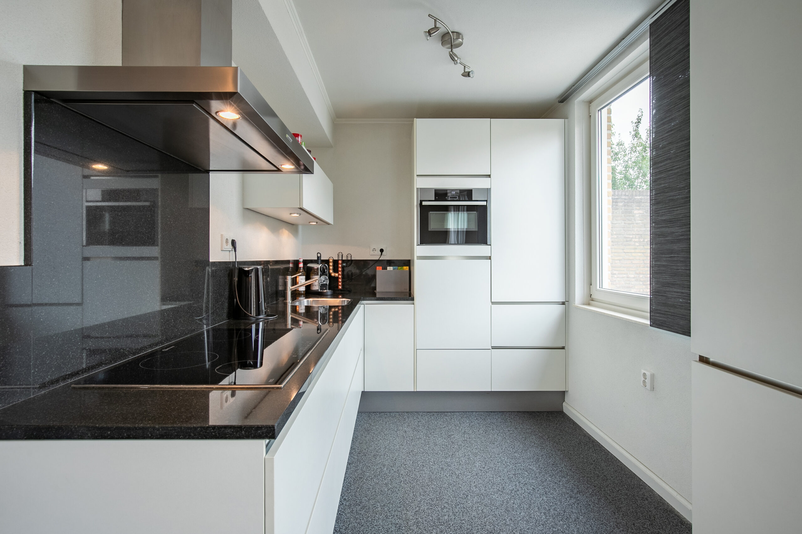 De entree geeft toegang tot het toilet met fonteintje, de meterkast en de trap naar de eerste verdieping. De ruime U-vormige woonkamer geniet van veel lichtinval en heeft direct tuincontact. Bovendien is de woonkamer uitgerust met een airconditioning, wat zorgt voor extra comfort in alle seizoenen. De moderne keuken in hoekopstelling is volledig uitgerust met inbouwapparatuur, waaronder een koelkast, vaatwasser, afzuigkap, inductiekookplaat en combi-oven. De gehele begane grond is voorzien van een grindvloer.