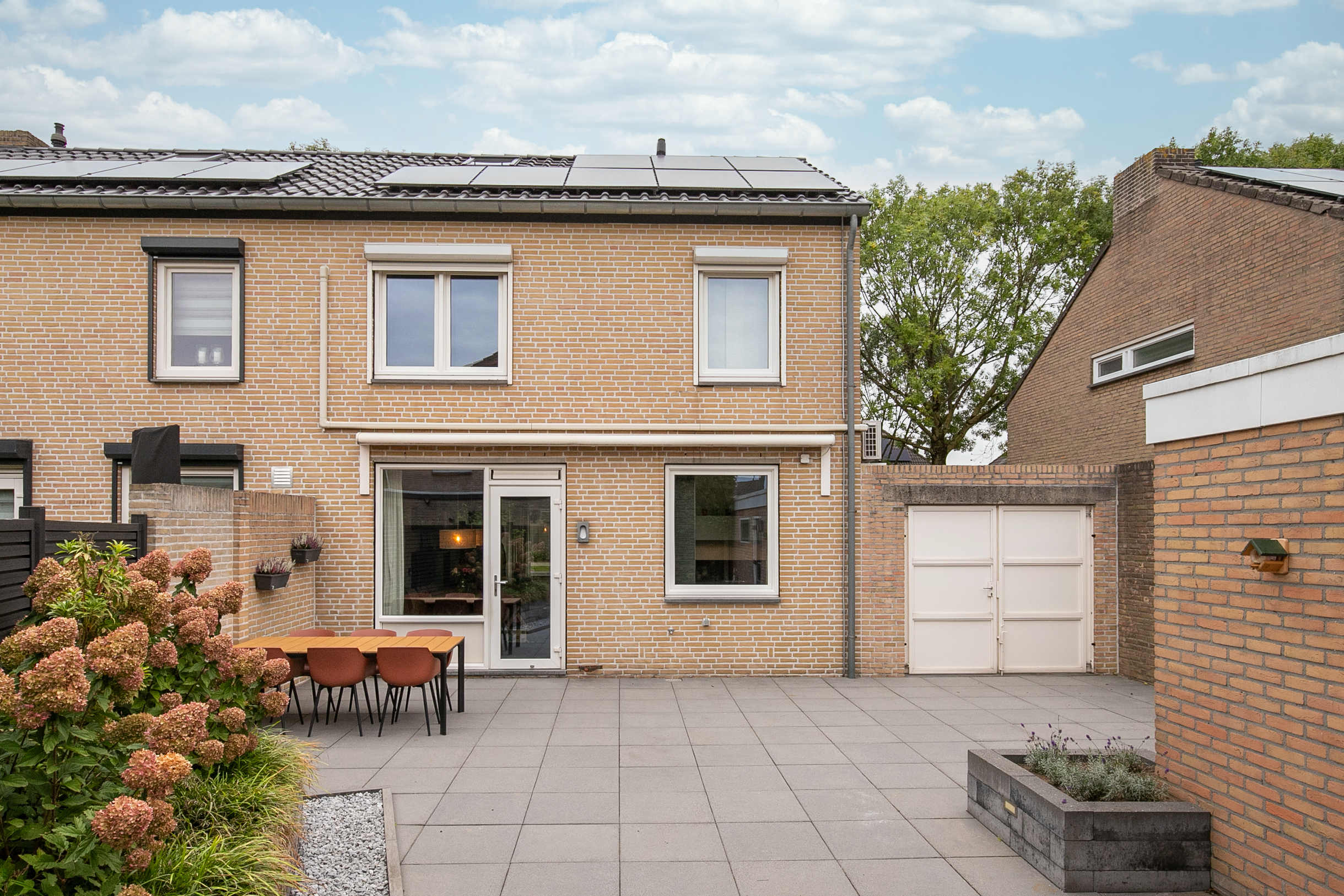 De ruime, verzorgde tuin is voorzien van een elektrisch zonnescherm aan de woning en een vrijstaande garage met handmatige kantelpoort. De garage biedt extra bergruimte en beschikt over aansluitingen voor witgoed.