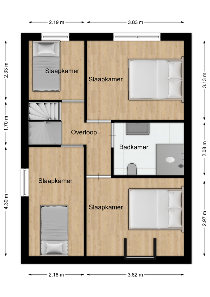 Via de overloop is er toegang tot vier slaapkamers en de badkamer. Aan de voorzijde liggen twee slaapkamers van ca. 9 m² en ca. 12 m², waarvan de laatste is voorzien van een dakkapel. Aan de achterzijde bevinden zich nog twee slaapkamers van ca. 12 m² en ca. 5 m², waarbij de grootste slaapkamer is voorzien van airconditioning en de kleinste kamer ook uitstekend kan dienen als kleedkamer. Alle slaapkamers zijn voorzien van rolluiken. De moderne badkamer (ca. 6 m²) is uitgerust met een inloopdouche, dubbele wastafel en toilet. Vanaf de overloop is tevens de tweede verdieping bereikbaar.