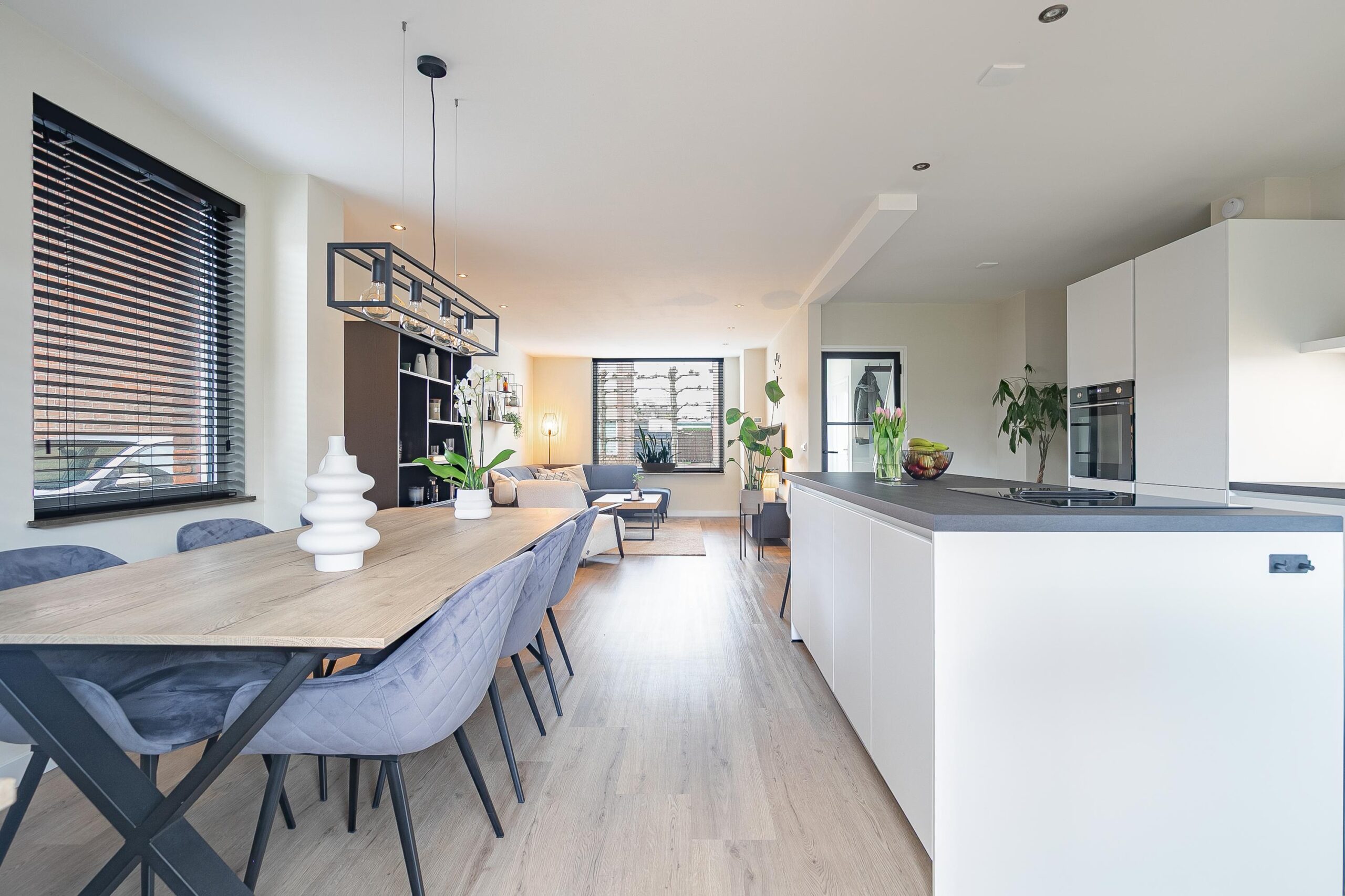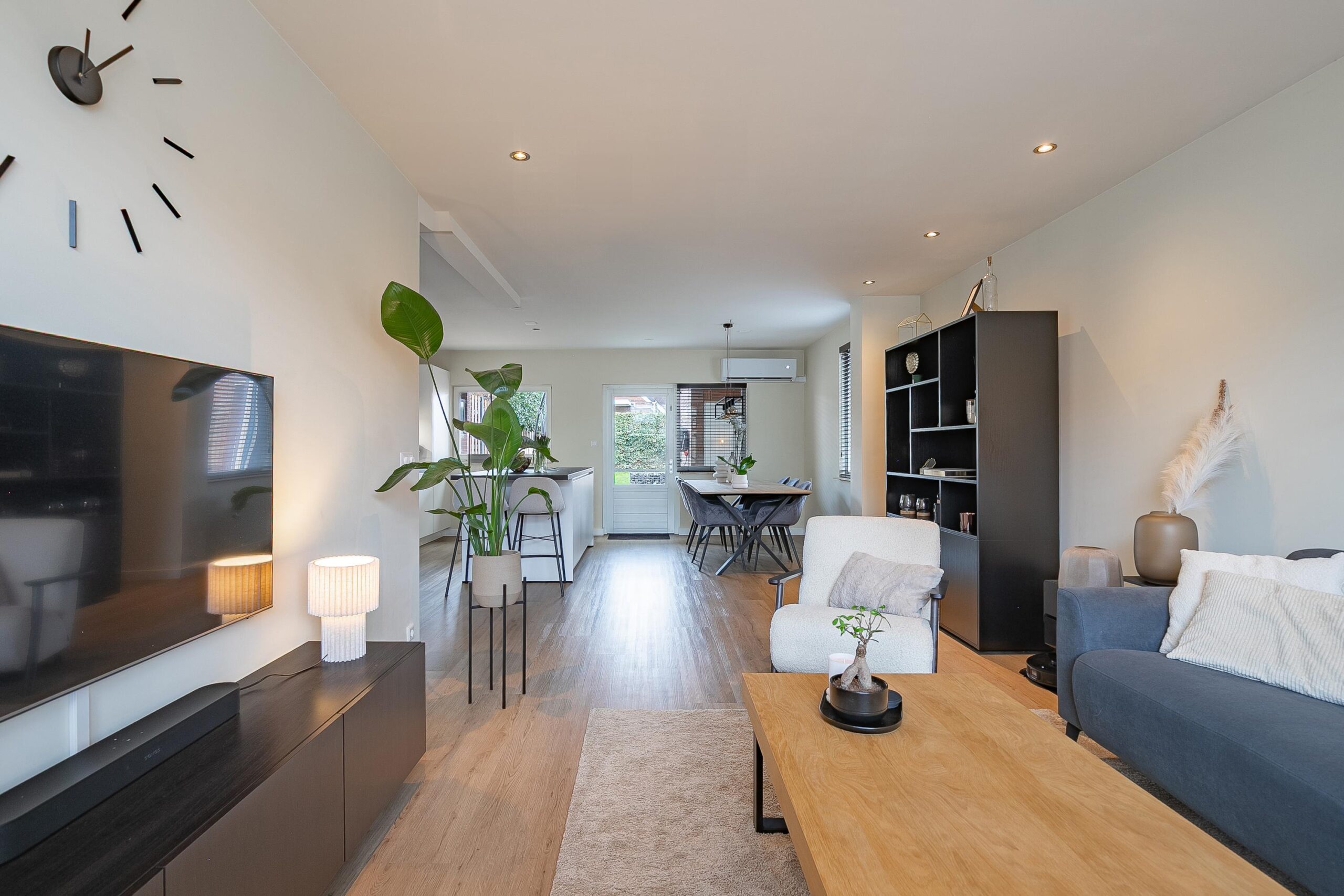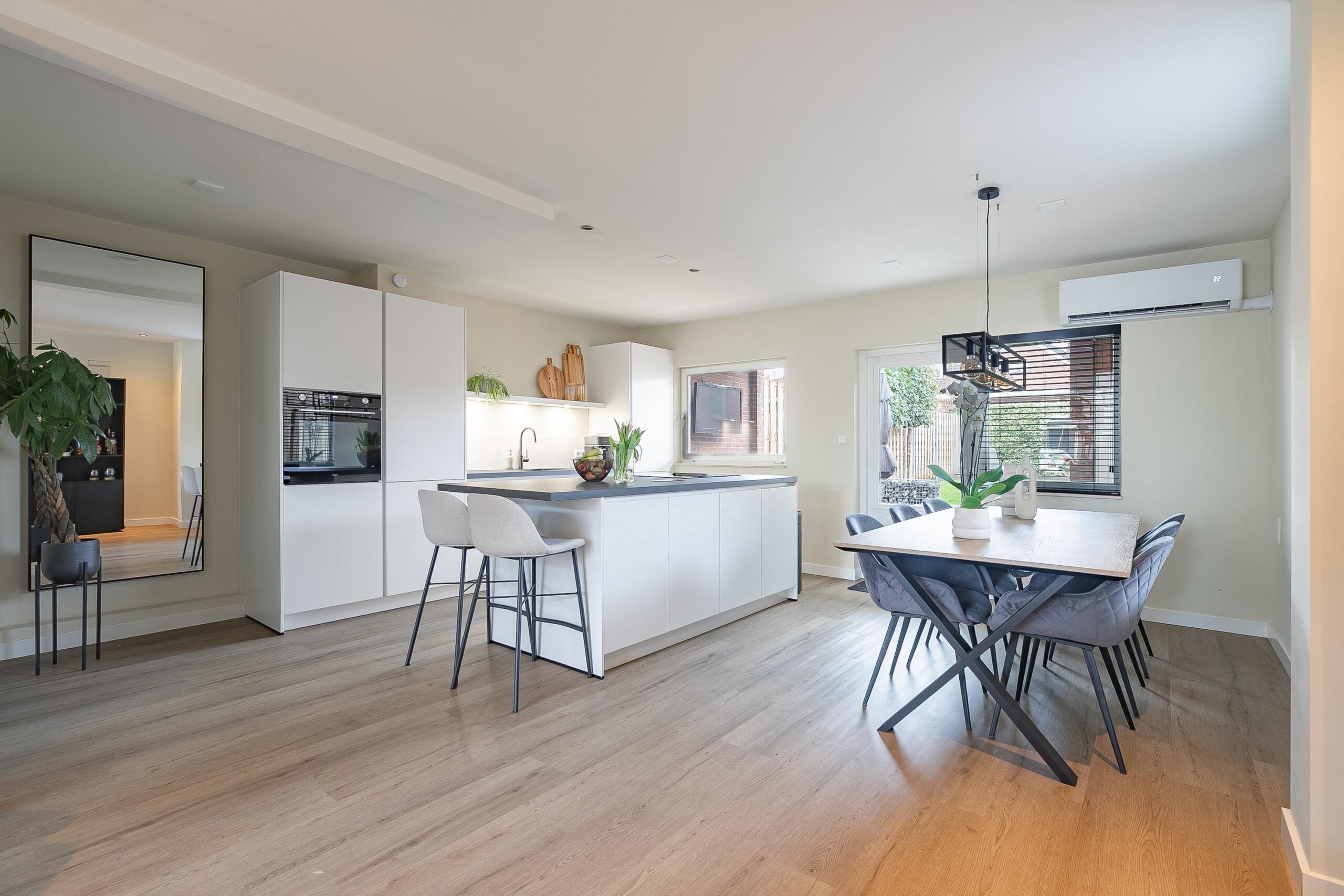 Hal met meterkast (14 groepen, 5 aardlekschakelaars en 3 fase aansluiting) en geheel in 2021 vernieuwd toilet. De sfeervolle keuken en de woonkamer hebben een open indeling (samen ca. 43m²) en zijn in 2022 geheel vernieuwd en voorzien van comfortabele vloerverwarming met PVC vloer in houtlook. De moderne keuken met kookeiland is voorzien van de volgende apparatuur: inductie kookplaat met ingebouwde afzuiging, combi-oven, vaatwasser, koelkast, diepvries en spoelbak. Vanuit de keuken en via de oprit bereikbaar overdekt terras (ca. 13m²), geheel omsloten tuin met voldoende privacy en een 7 meter lange garage (ca. 25.2m²) met elektrische sectionaalpoort en aansluitingen witgoed.