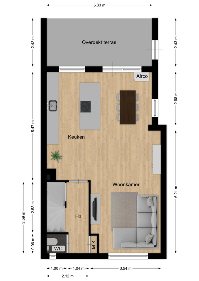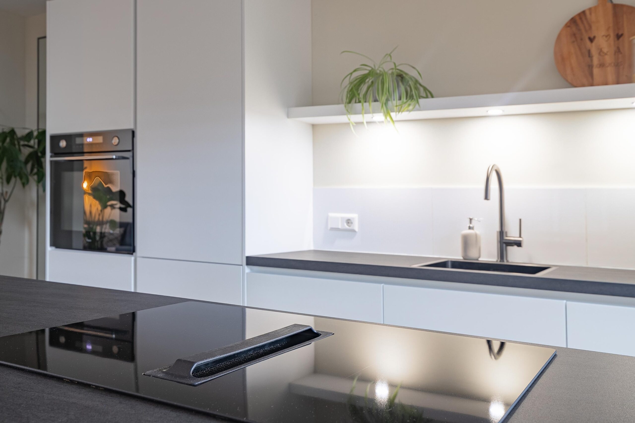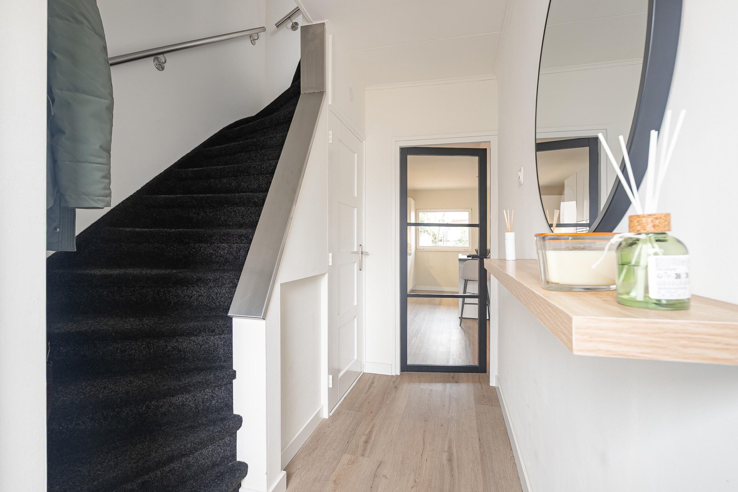 Hal met meterkast (14 groepen, 5 aardlekschakelaars en 3 fase aansluiting) en geheel in 2021 vernieuwd toilet. De sfeervolle keuken en de woonkamer hebben een open indeling (samen ca. 43m²) en zijn in 2022 geheel vernieuwd en voorzien van comfortabele vloerverwarming met PVC vloer in houtlook. De moderne keuken met kookeiland is voorzien van de volgende apparatuur: inductie kookplaat met ingebouwde afzuiging, combi-oven, vaatwasser, koelkast, diepvries en spoelbak. Vanuit de keuken en via de oprit bereikbaar overdekt terras (ca. 13m²), geheel omsloten tuin met voldoende privacy en een 7 meter lange garage (ca. 25.2m²) met elektrische sectionaalpoort en aansluitingen witgoed.