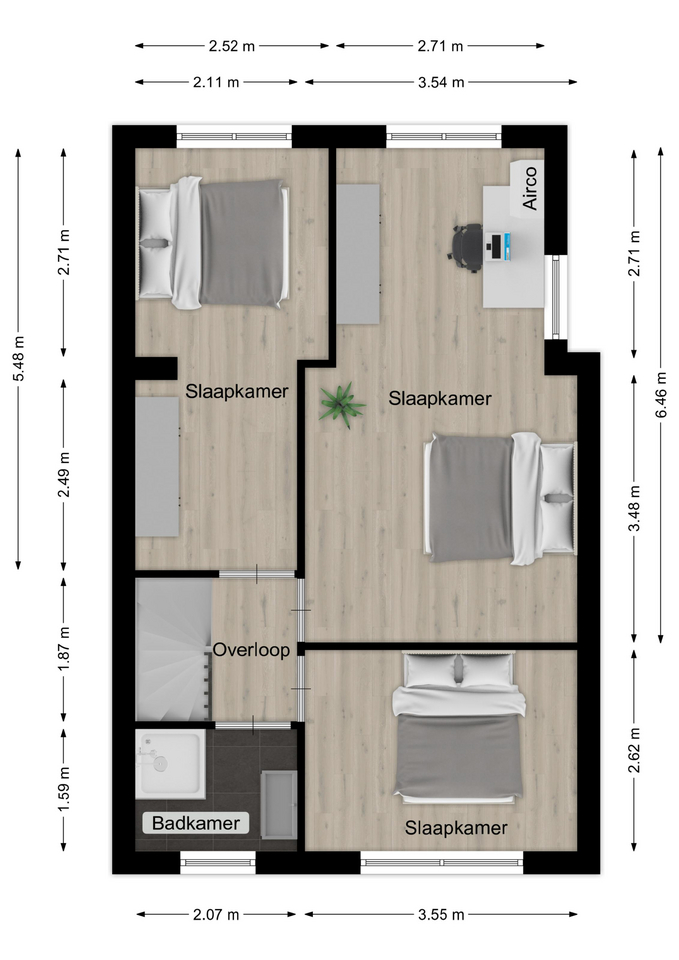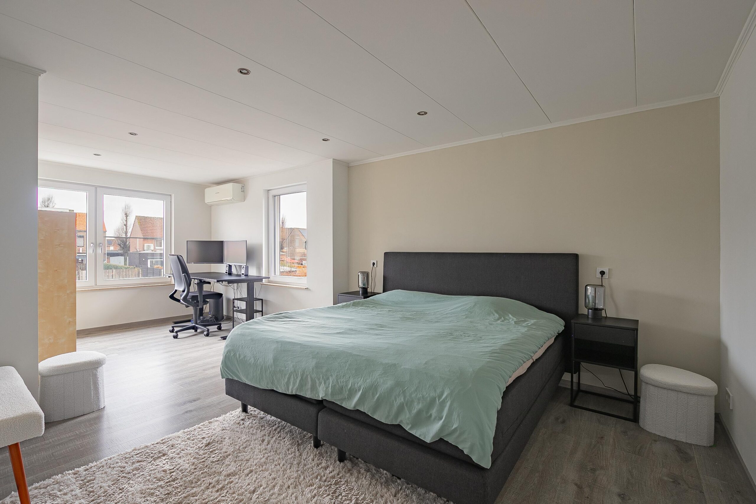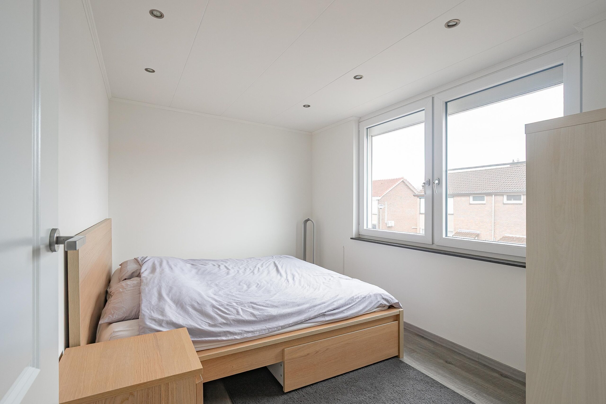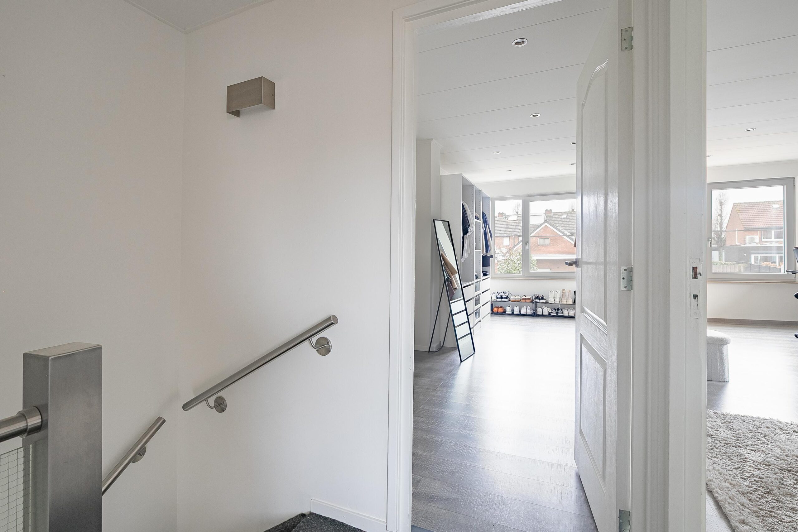 Overloop, drie slaapkamers (resp. ca. 20.4m², 12.7m² en 9.3m²). De trap naar de eerste verdieping is net als de overloop voorzien van vloerbedekking. De slaapkamers zijn voorzien van een laminaatvloer. Moderne badkamer (ca. 3.4m²) met douche en wastafel met meubel. De badkamer is geheel vernieuwd in 2019.