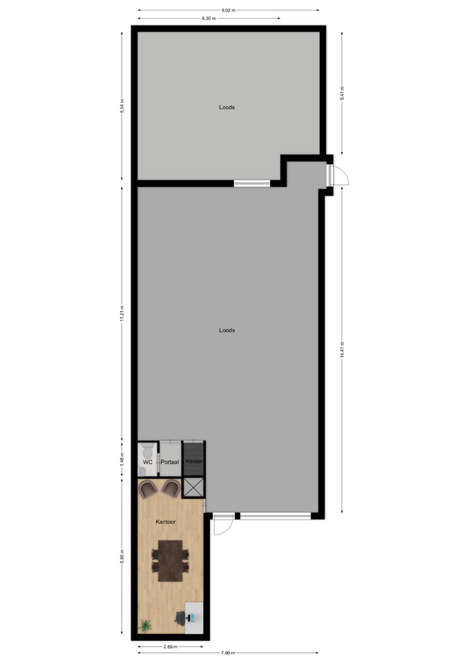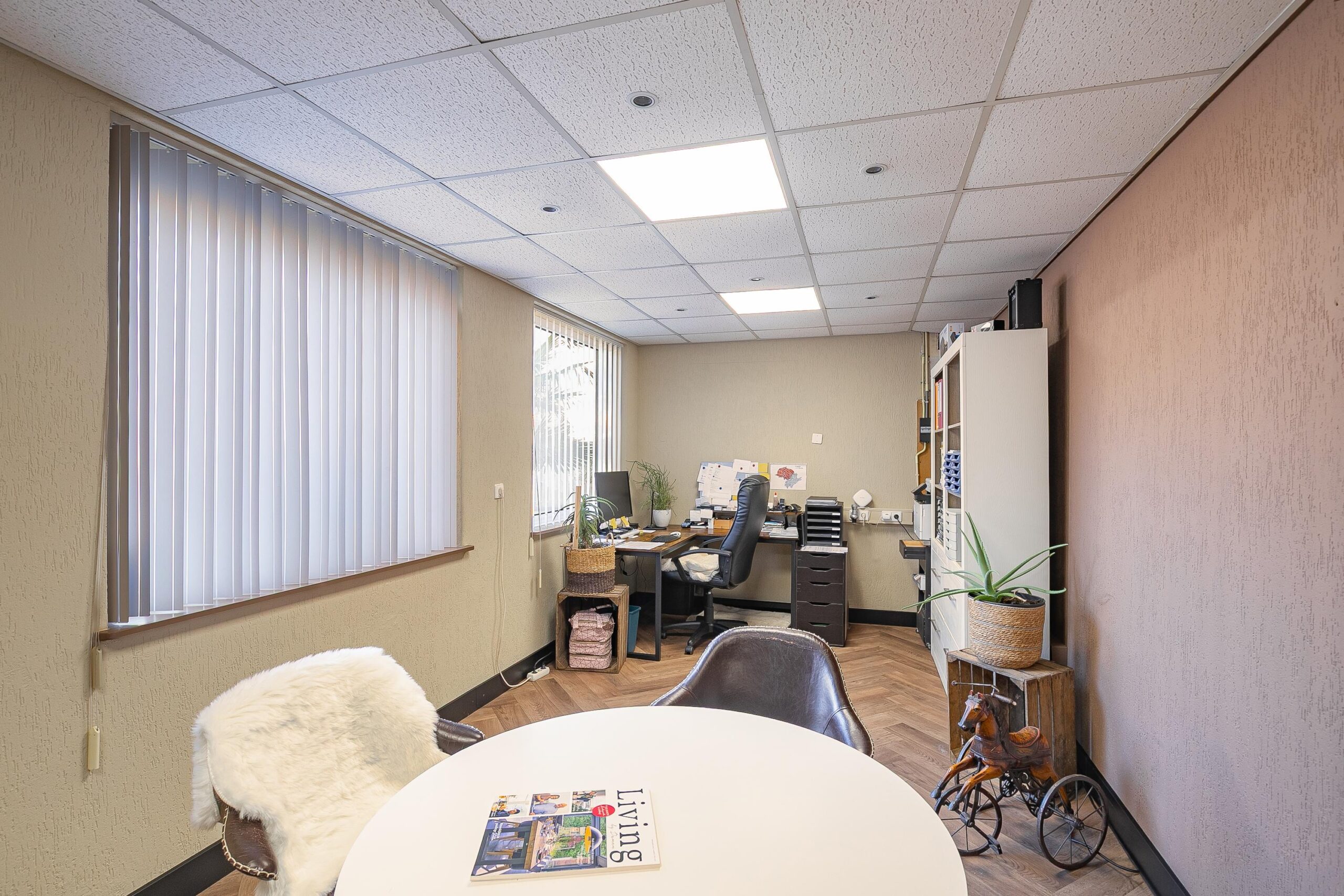 Vanuit de loods is tevens een kantoorruimte (ca. 20 m²) met airconditioning bereikbaar, ideaal voor wie wonen en werken wil combineren.