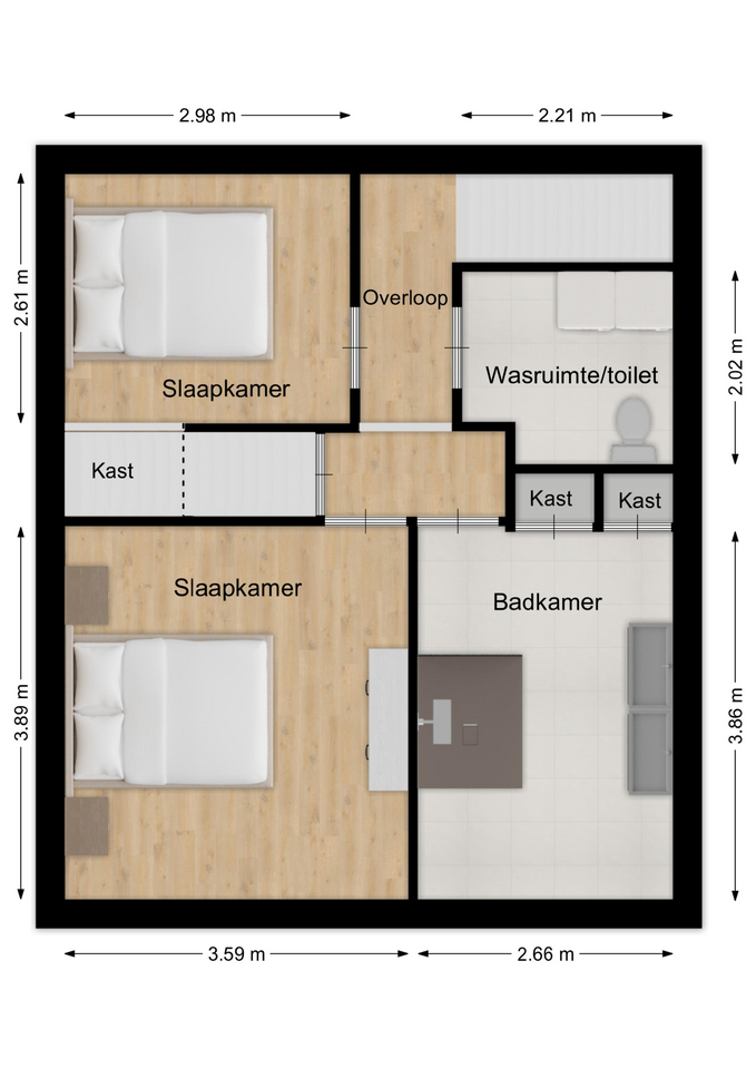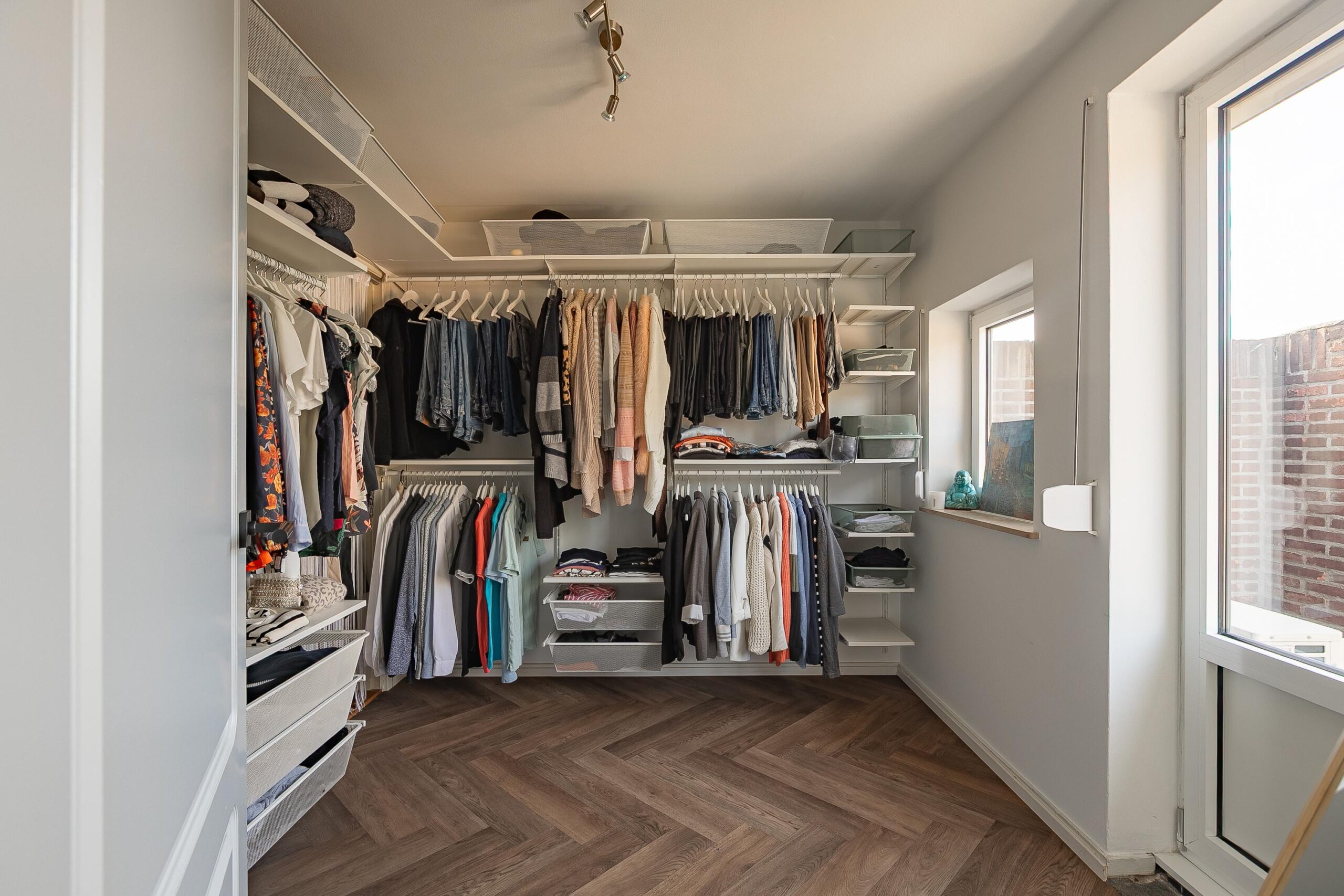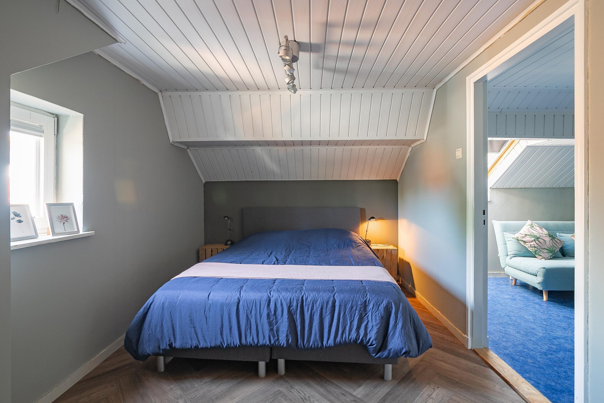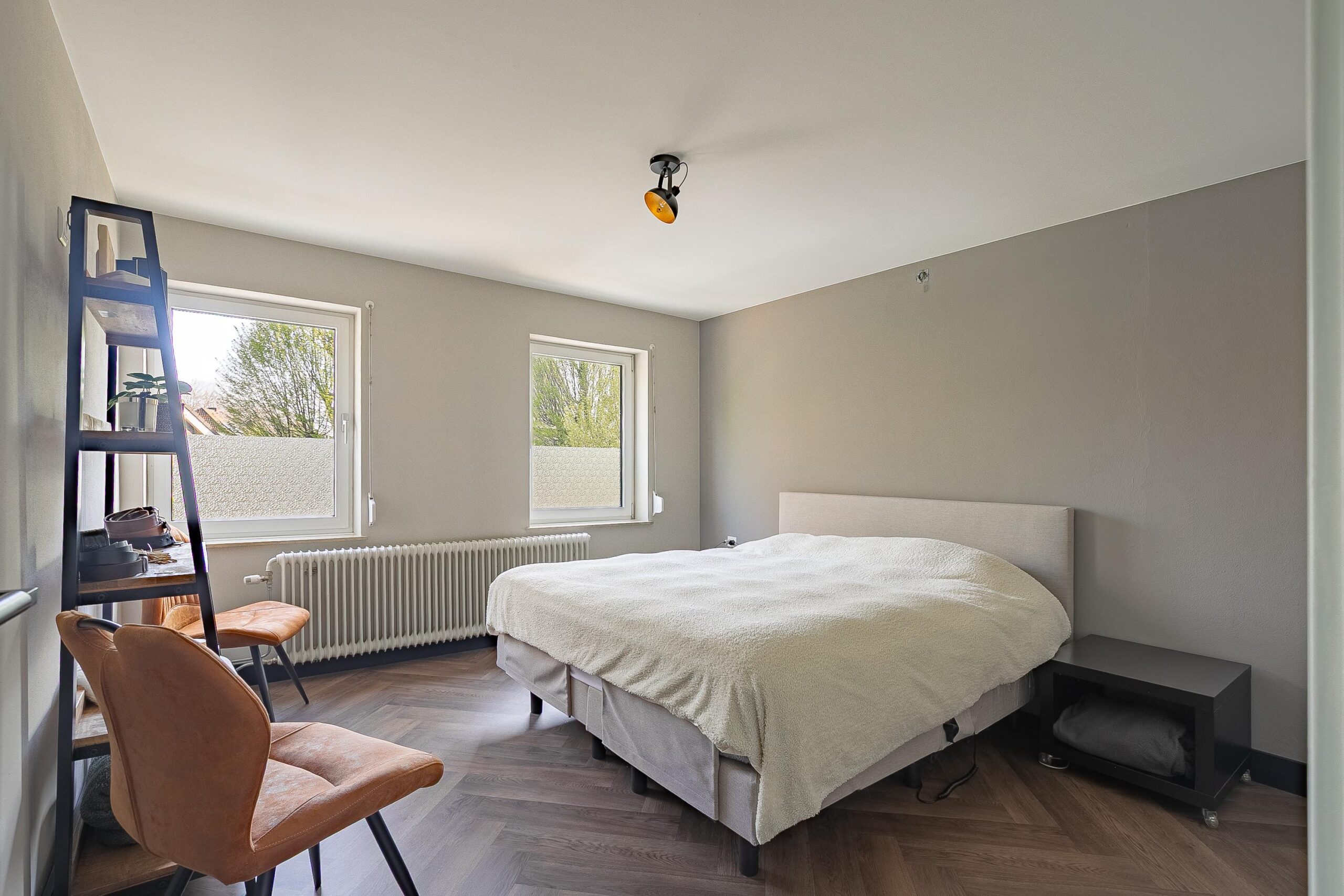 De slaapkamer aan de voorzijde is ca. 14 m² en de slaapkamer aan de achterzijde van de woning is ca. 9 m². Beide kamers beschikken over twee ramen met rolluiken, wat zorgt voor veel lichtinval en comfort. De achterste slaapkamer wordt momenteel gebruikt als kleedruimte en is voorzien van een ingebouwde kast, maar kan eenvoudig weer als volwaardige slaapkamer worden ingericht.