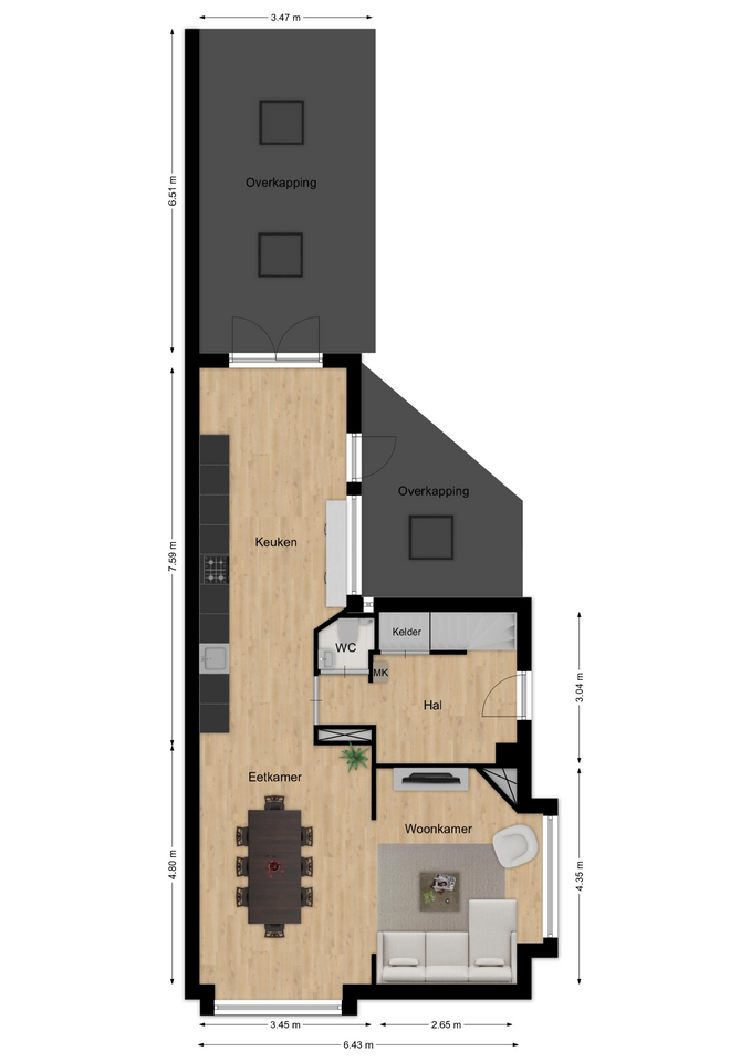 Via de entree aan de zijkant van de woning bereikt u de hal (ca. 7 m²), welke toegang biedt tot de keuken, toiletruimte, meterkast, trapopgang en het souterrain.