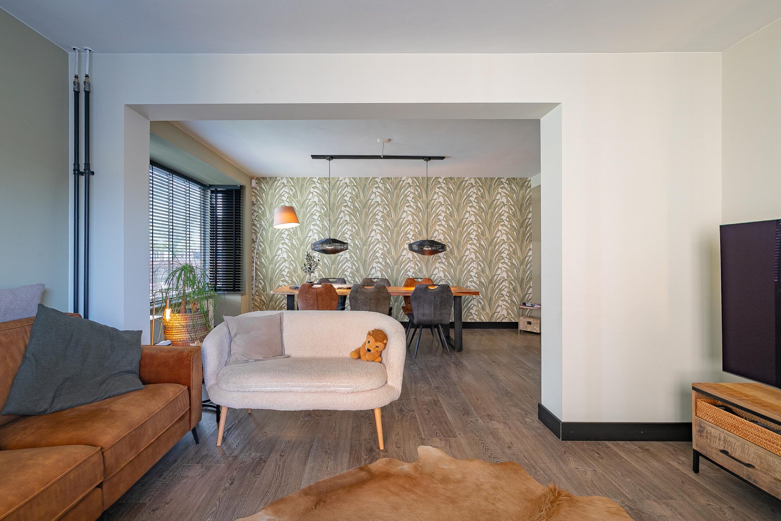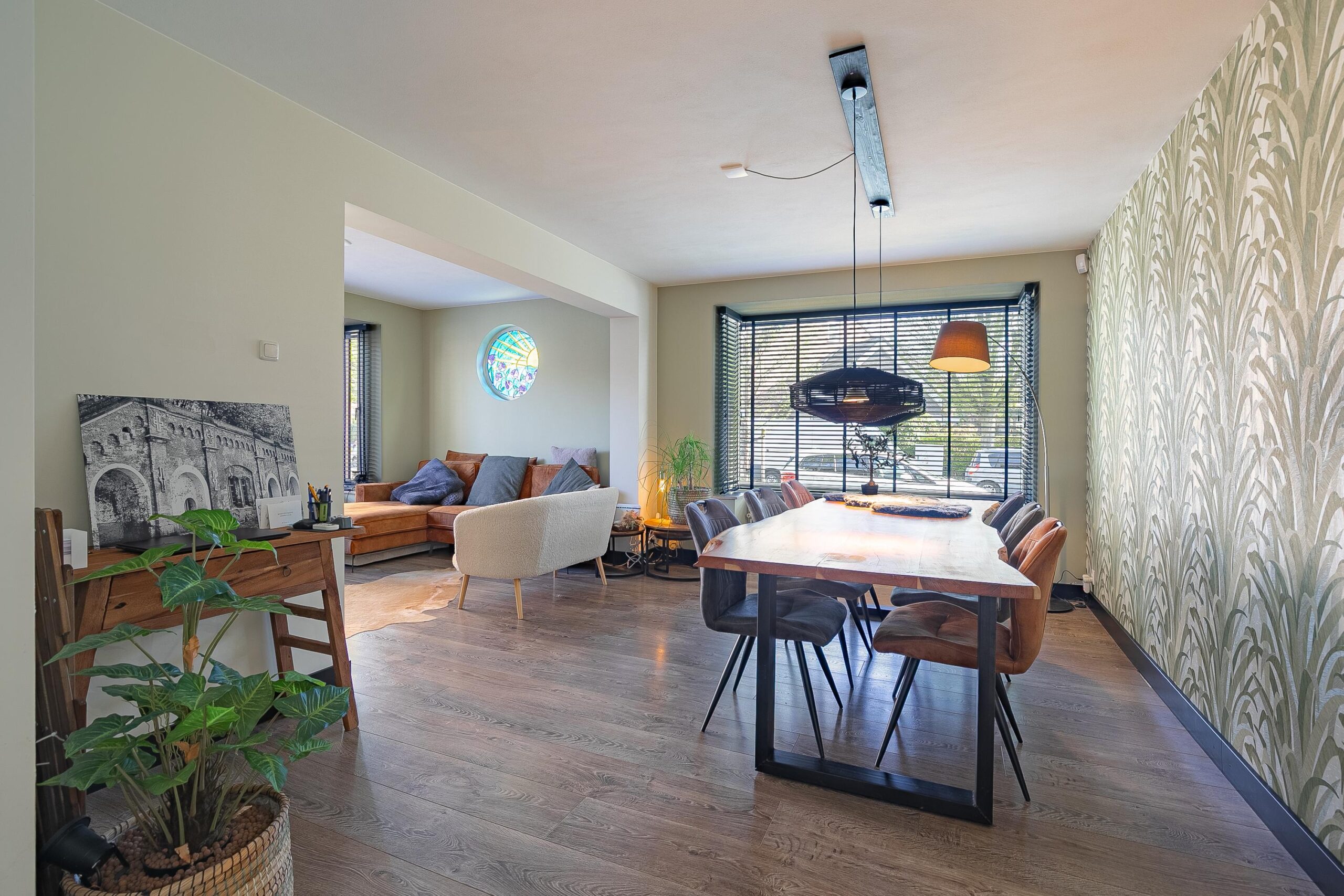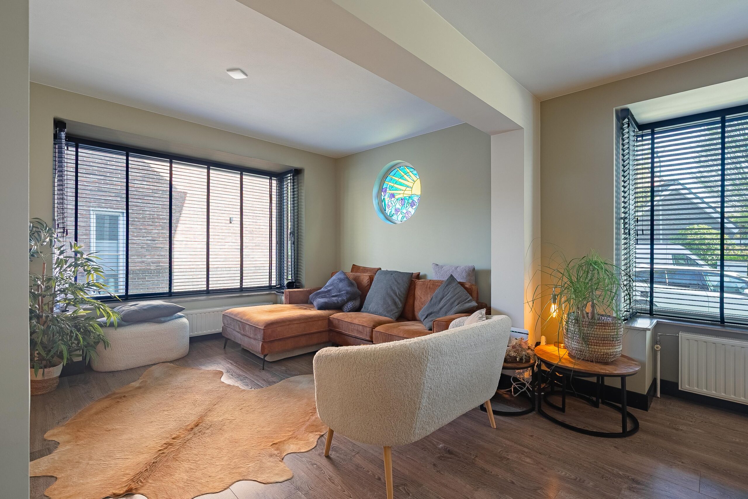 De woonkamer (ca. 28 m²) kenmerkt zich door een prettig lichtinval dankzij de erkers met grote raampartijen aan zowel de voor- als zijkant van de woning. De donkere houten vloer en het cirkelvormig glas-in-loodraam zorgen voor een sfeervol en karakteristieke uitstraling.