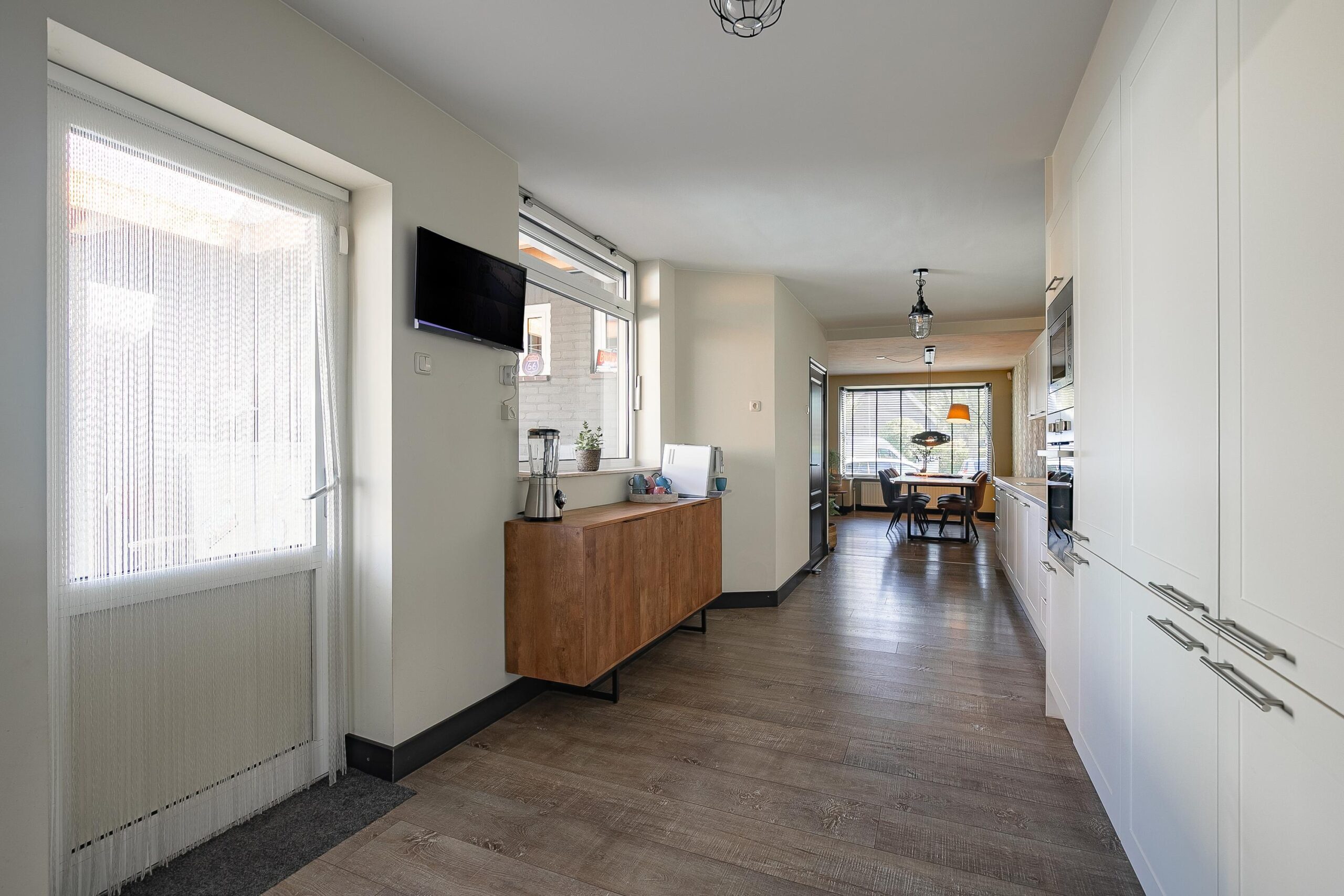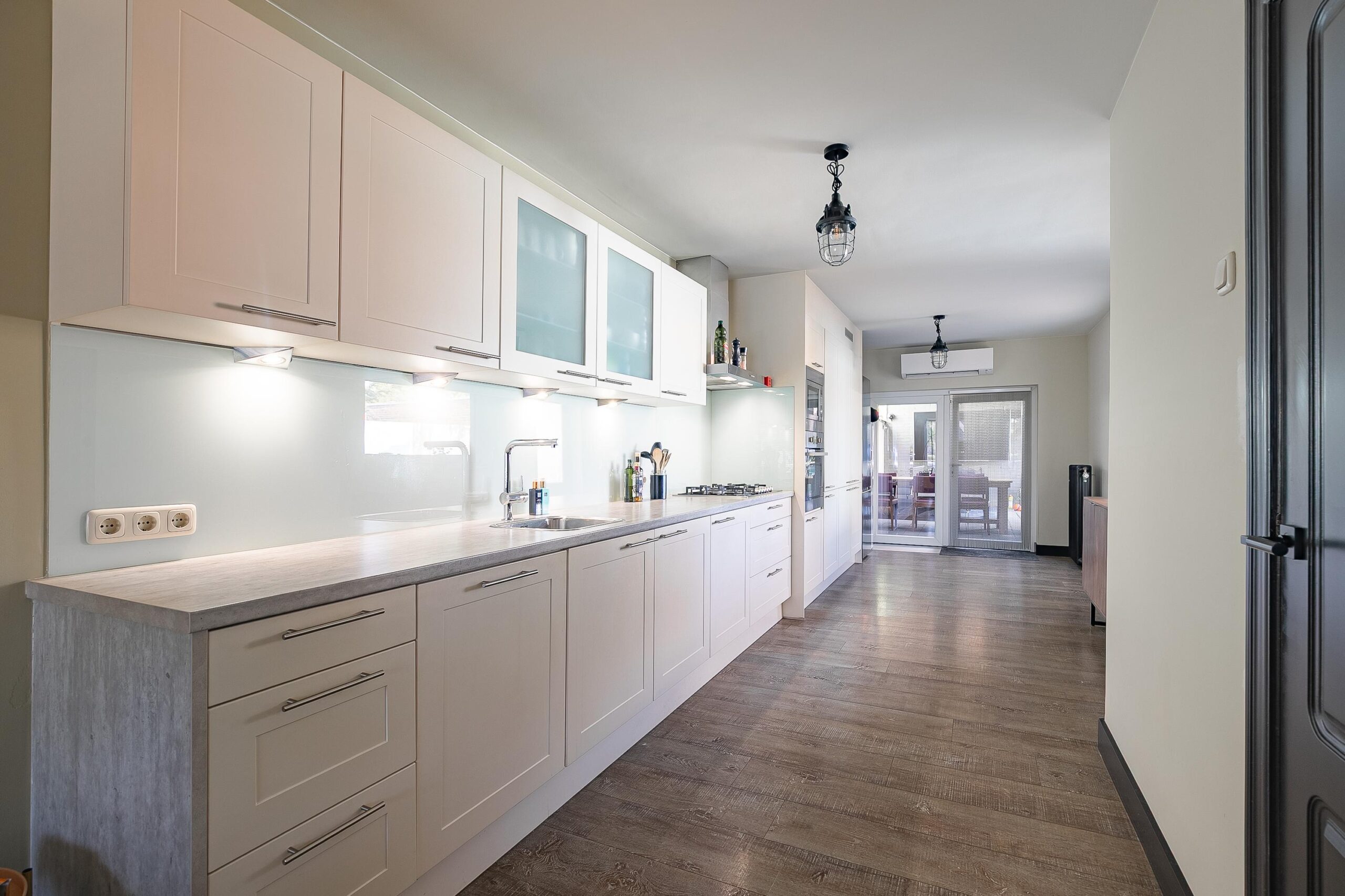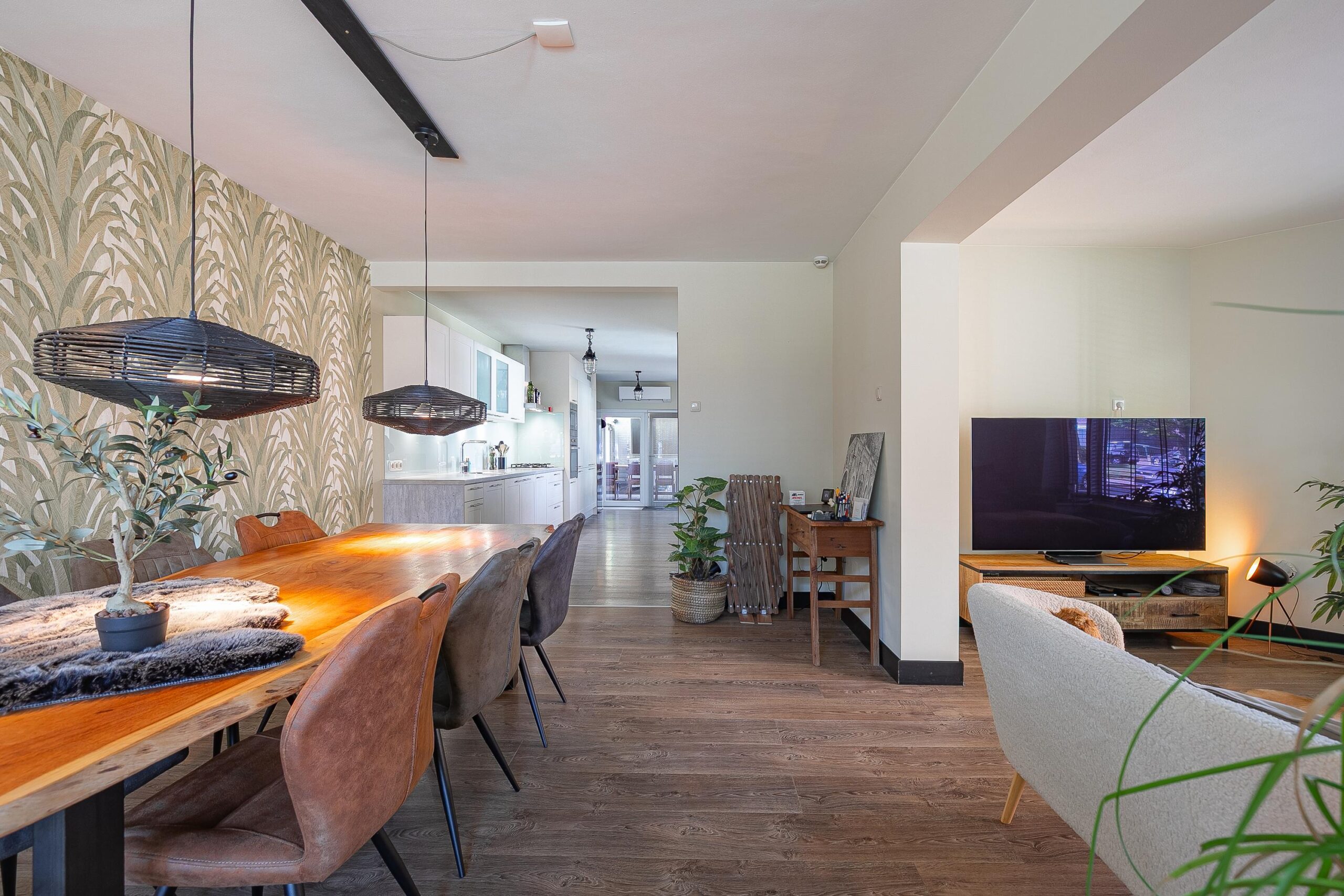 Aangrenzend bevindt zich de halfopen keuken (ca. 15 m²), uitgevoerd in een praktische rechte wandopstelling. De keuken is onder andere voorzien van een 5-pits gaskookplaat, koelkast, oven, combimagnetron, vaatwasser en afzuigkap. Een deel van de apparatuur is vernieuwd in 2023. Daarnaast is de begane grond uitgerust met een Daikin airconditioning (2023), wat bijdraagt aan extra comfort. Vanuit de keuken is er een directe toegang tot de tuin.