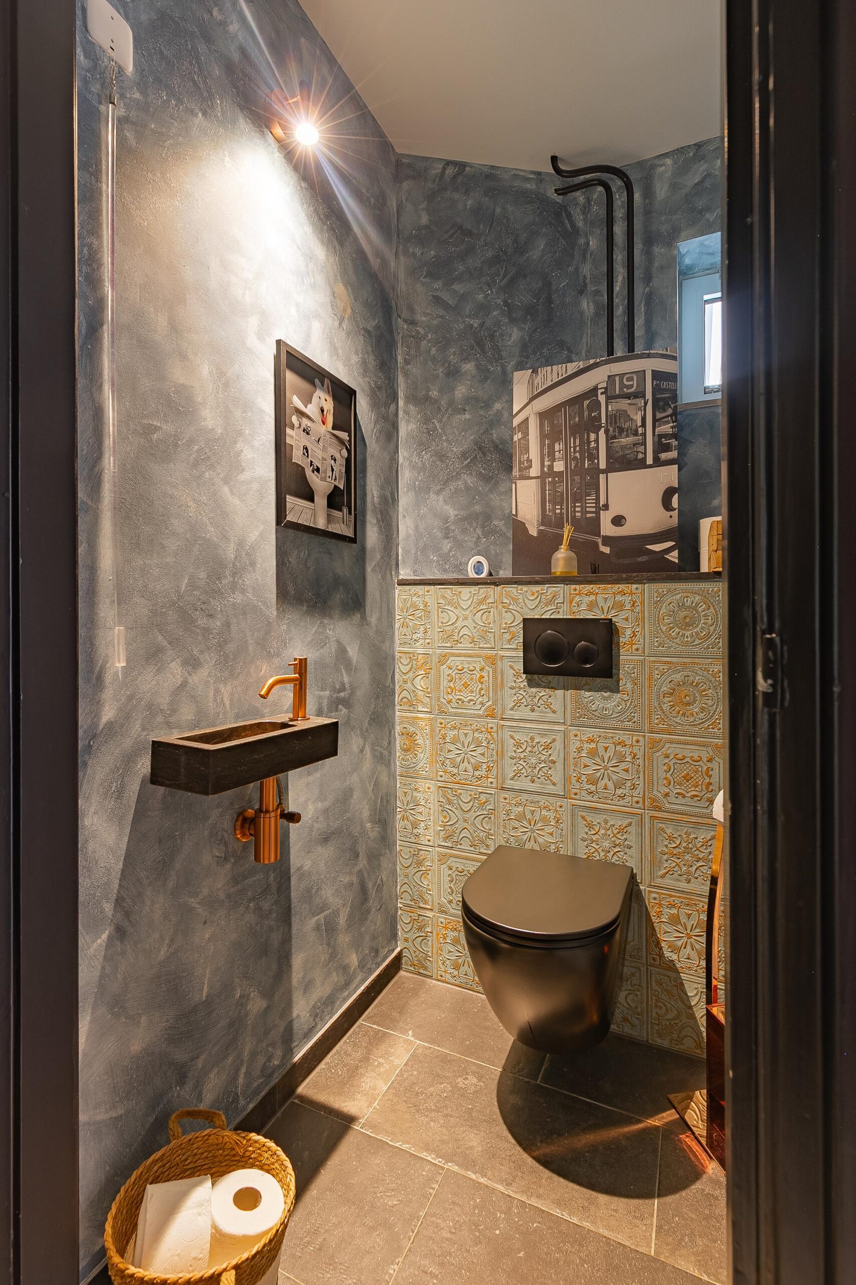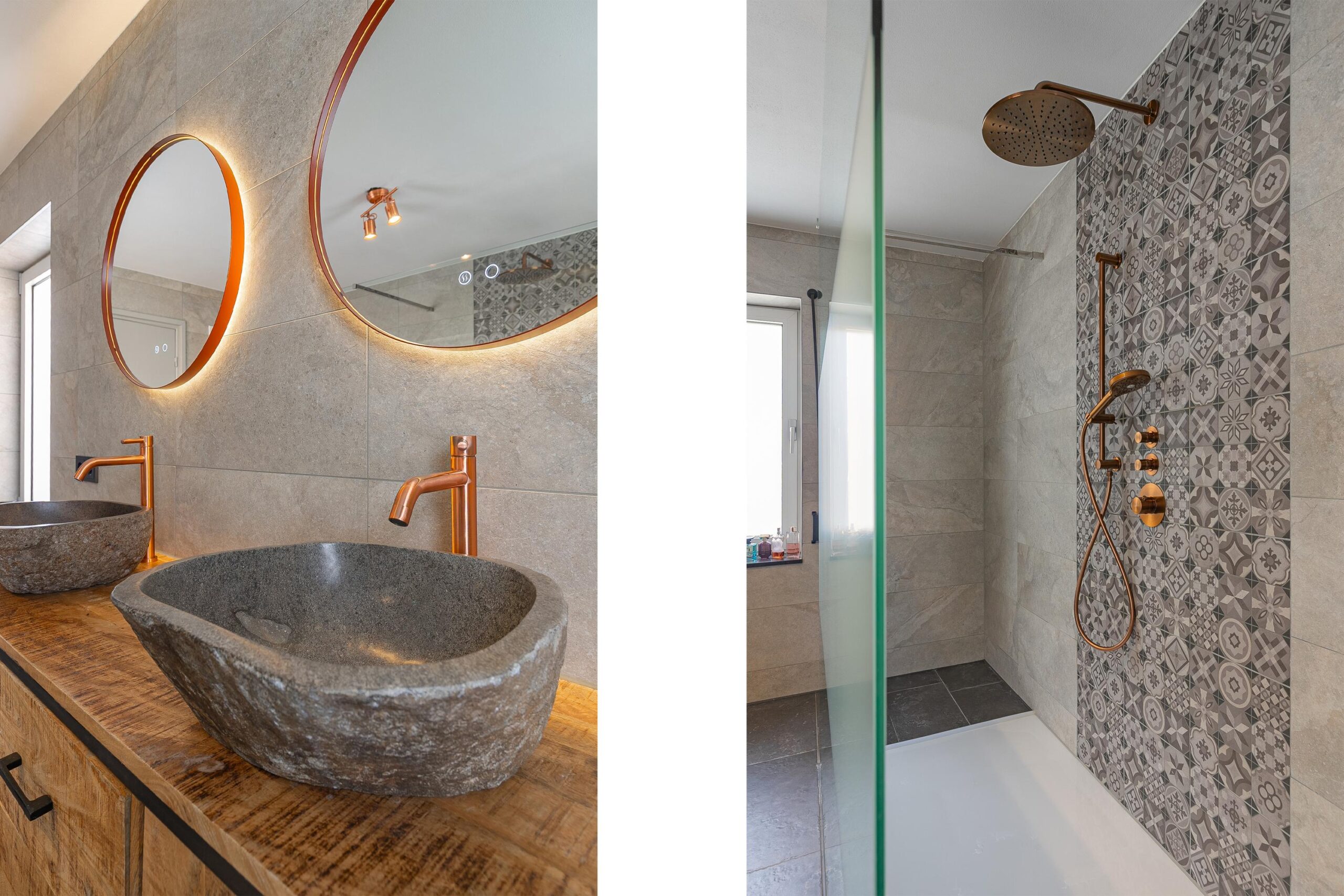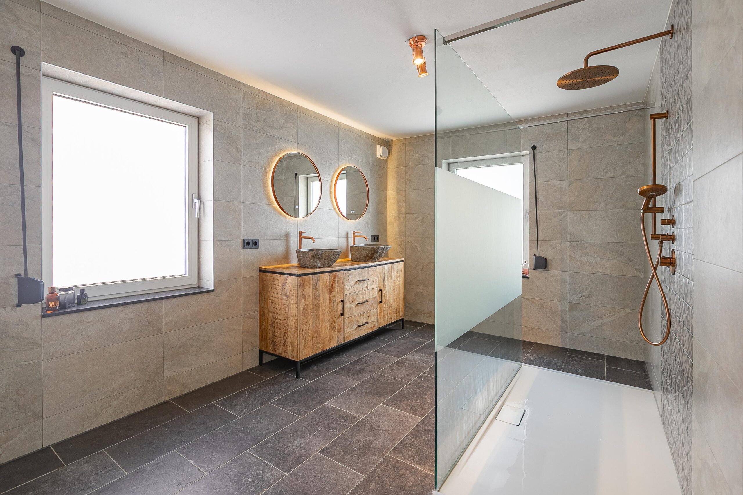 De volledig betegelde badkamer (ca. 11 m²), gemoderniseerd in 2023, is ruim opgezet en voorzien van een dubbele wastafel en een inloopdouche met regendouche. De bronzen accenten geven de ruimte een moderne en luxe uitstraling. Daarnaast beschikt de badkamer over vloerverwarming en twee ramen met rolluiken.