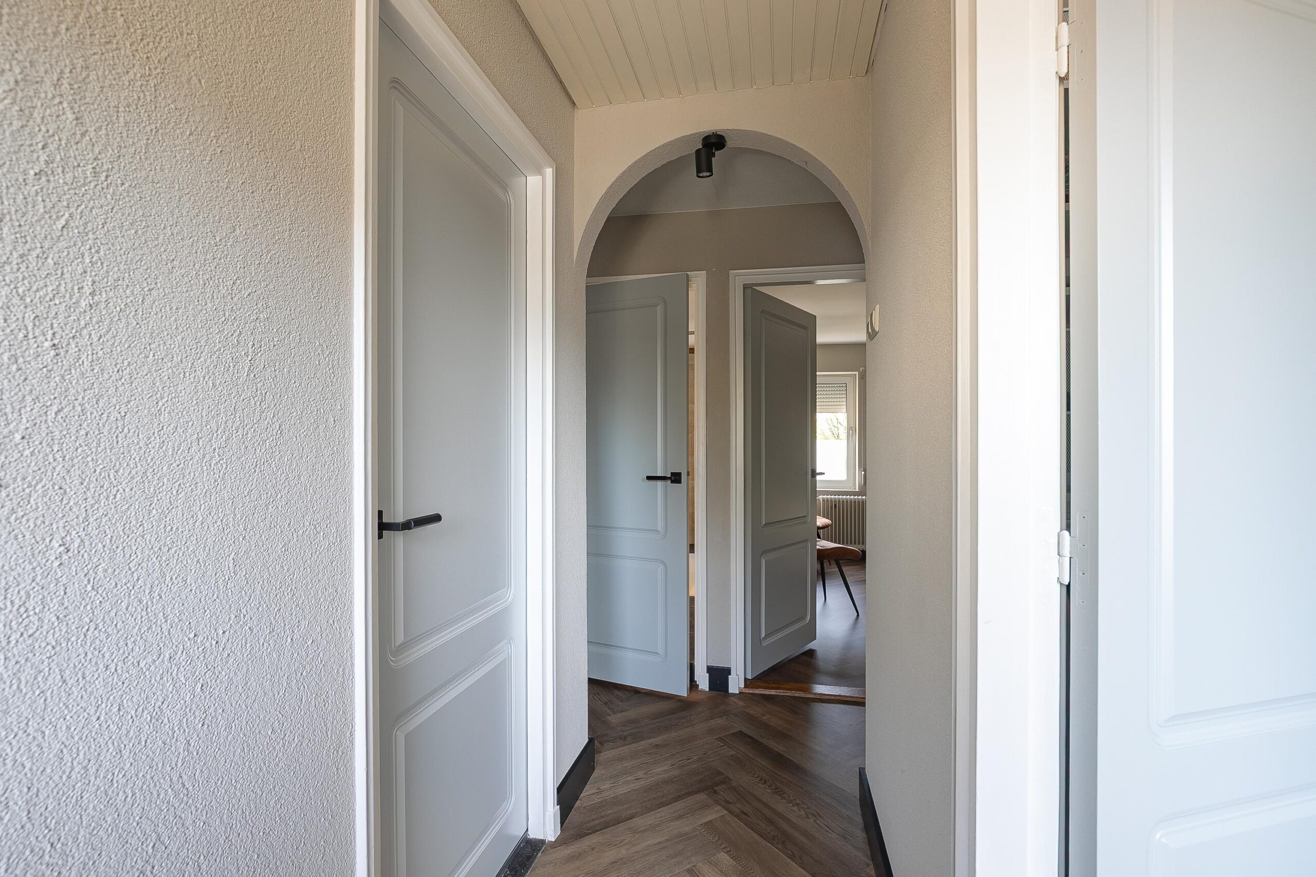 Op de overloop en in de slaapkamers ligt een stijlvolle visgraatvloer.