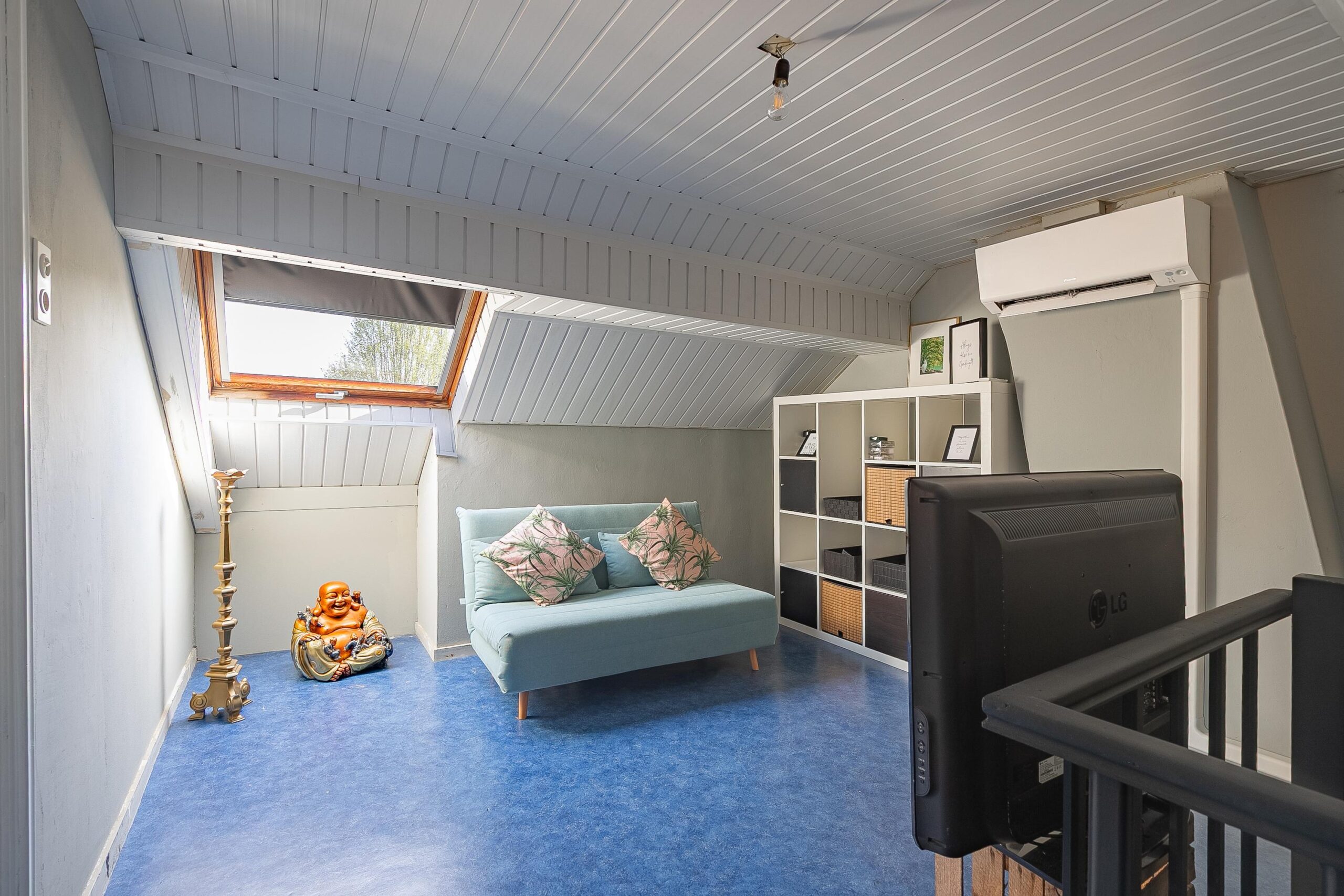 Via een vaste trap bereikt u de tweede verdieping, die is verdeeld in drie ruimtes. De eerste ruimte (ca. 13 m²) beschikt over een airconditioning (Daikin, 2023) en een dakraam en is multifunctioneel in gebruik. Hier bevindt zich tevens de cv-installatie (Nefit, 2023, eigendom). Vanuit deze ruimte bereikt u een slaapkamer (ca. 9 m²) met dakkapel. De derde ruimte wordt momenteel gebruikt als bergruimte.
