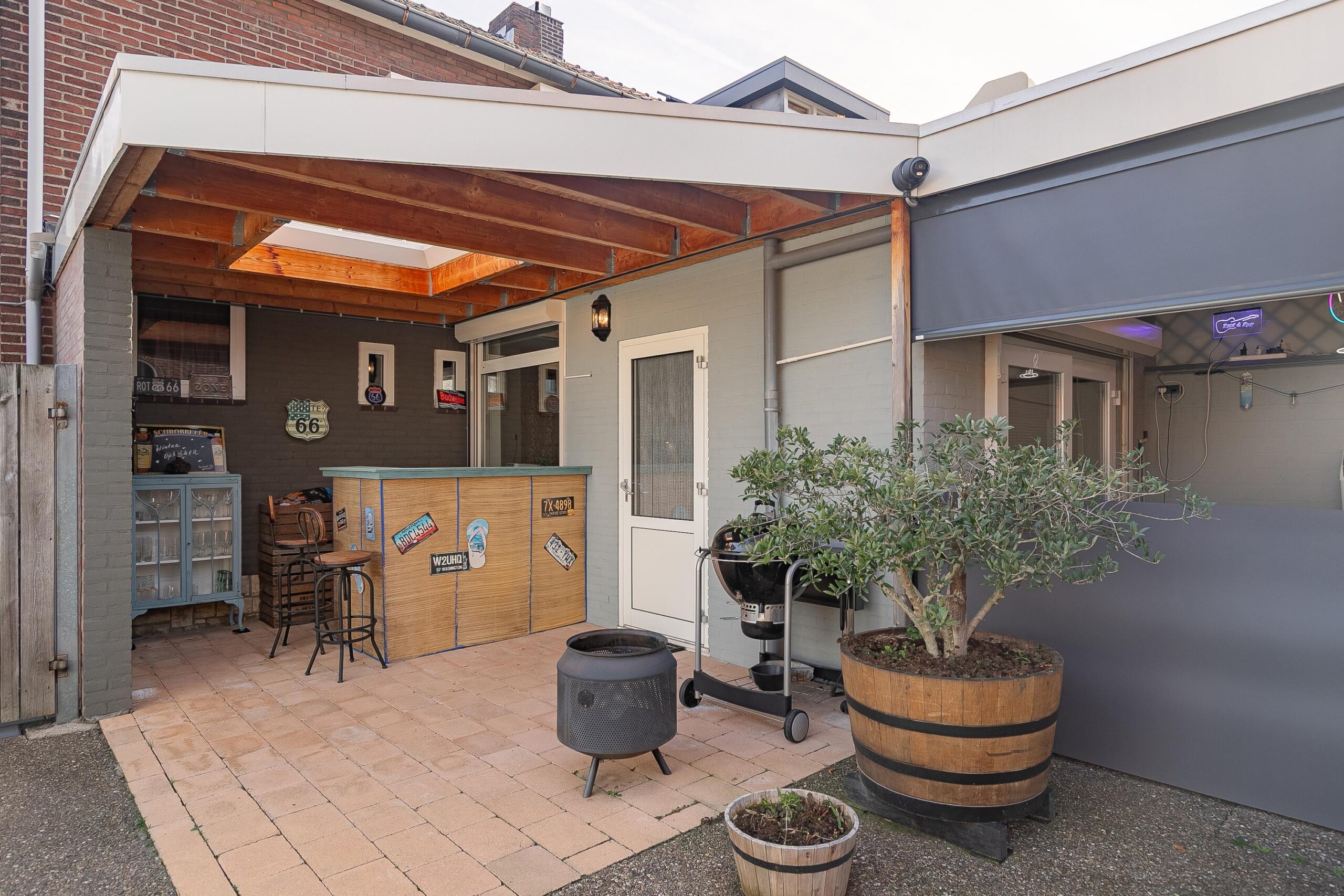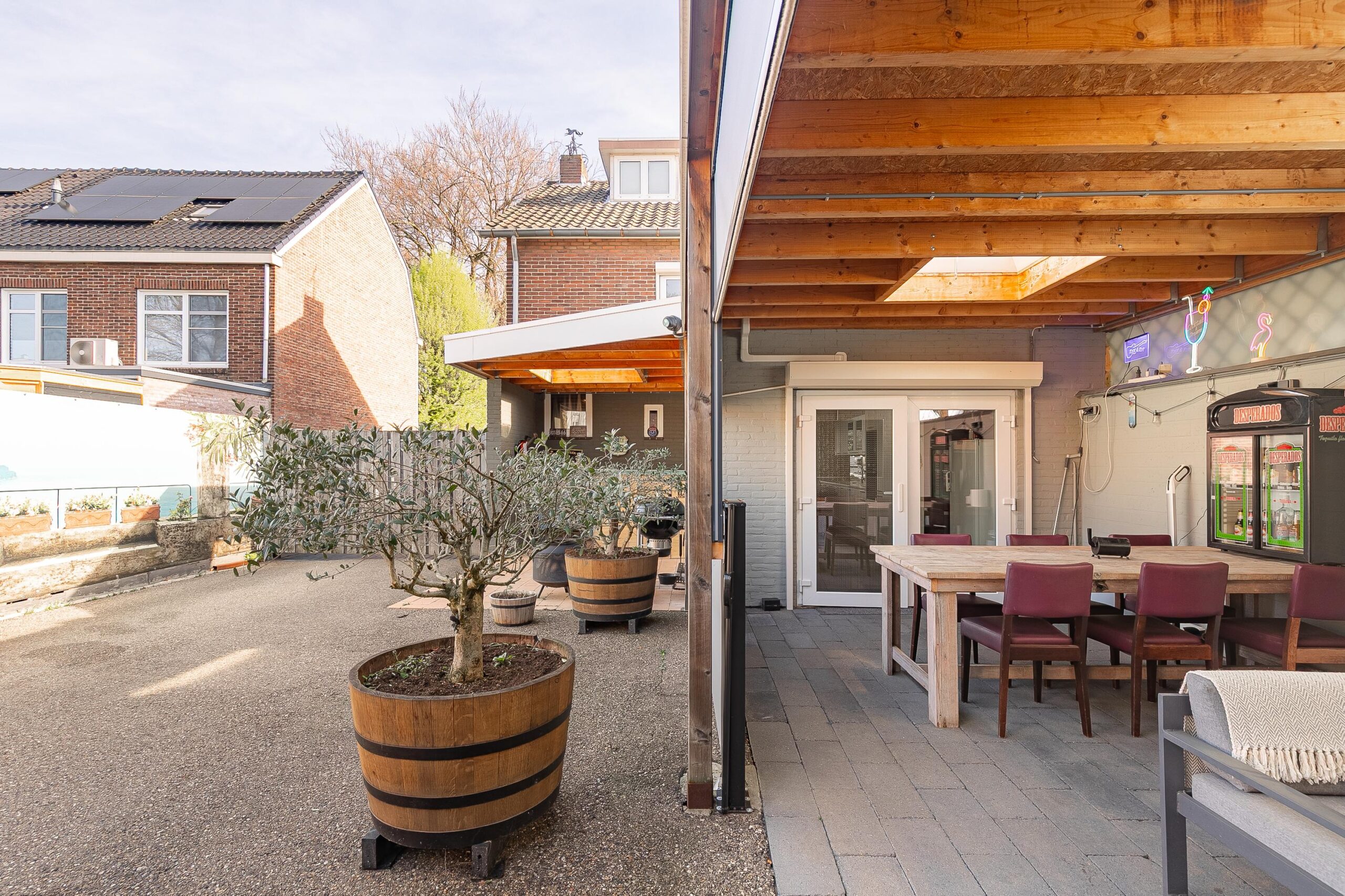 Grenzend aan de keuken bevindt zich het ruime, overdekte en beklinkerde terras (ca. 23 m²), voorzien van twee dakkoepels, elektra-aansluitingen en elektrisch bedienbare screens. Hierdoor kunt u hier comfortabel en beschut genieten van het buitenleven. Daarnaast is er naast de woning een tweede overdekt terras (ca. 10 m²) met bar, waar u eveneens heerlijk kunt verblijven.