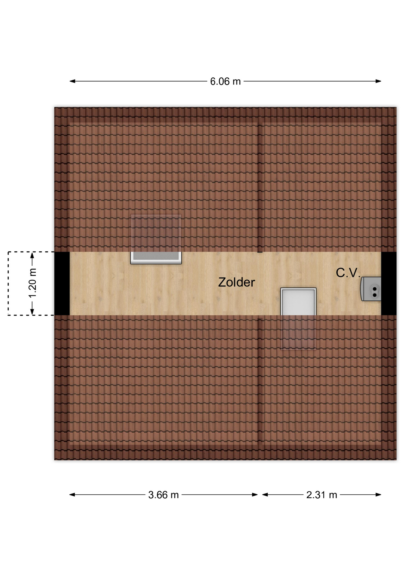 Via een vlizotrap bereikbare bergzolder met een nokhoogte van 1,69 meter. Op zolder is tevens de opstelling van de CV-combiketel (Nefit, eigendom, bwjr. 2016).