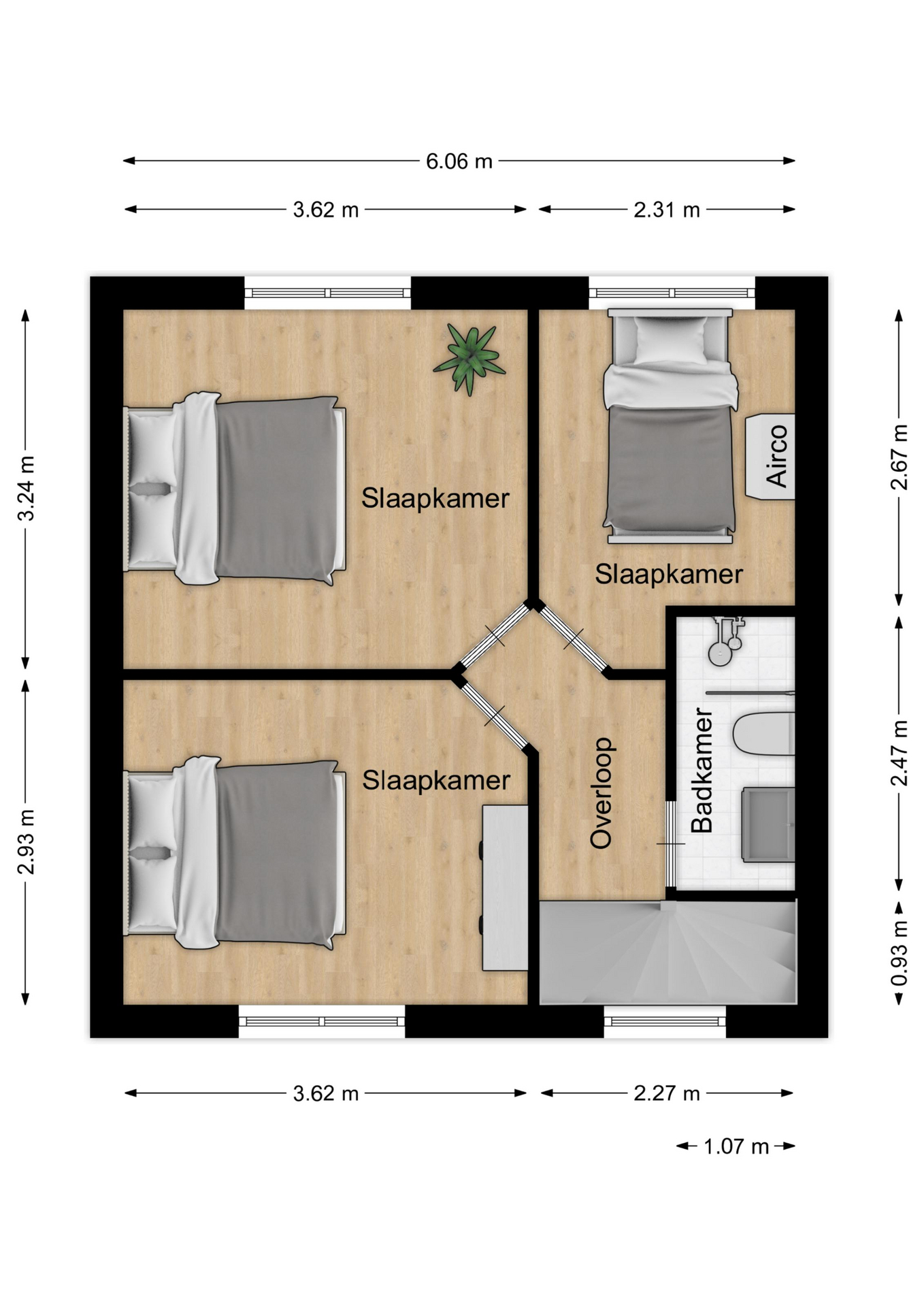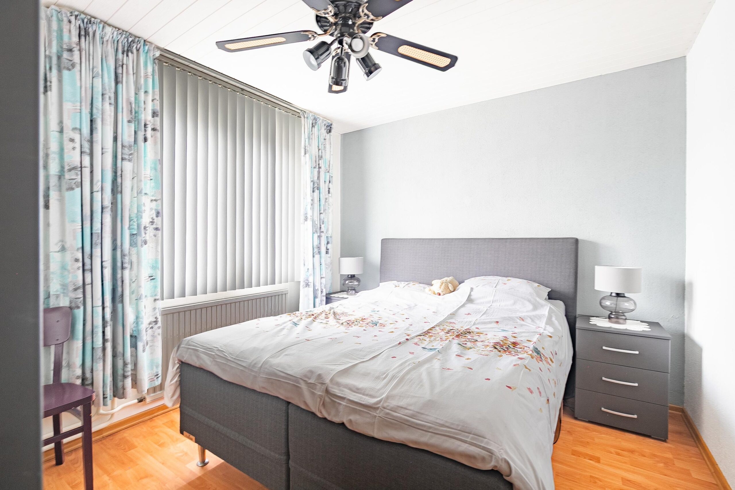 Overloop, drie slaapkamers (resp. 11.6m², 10.5m² en 6.6m²), allen voorzien van laminaatvloeren. Op één van de slaapkamers is een airco geplaatst. Moderne badkamer (ca. 2.6m²) met inloopdouche, wandcloset en badmeubel met wastafel.