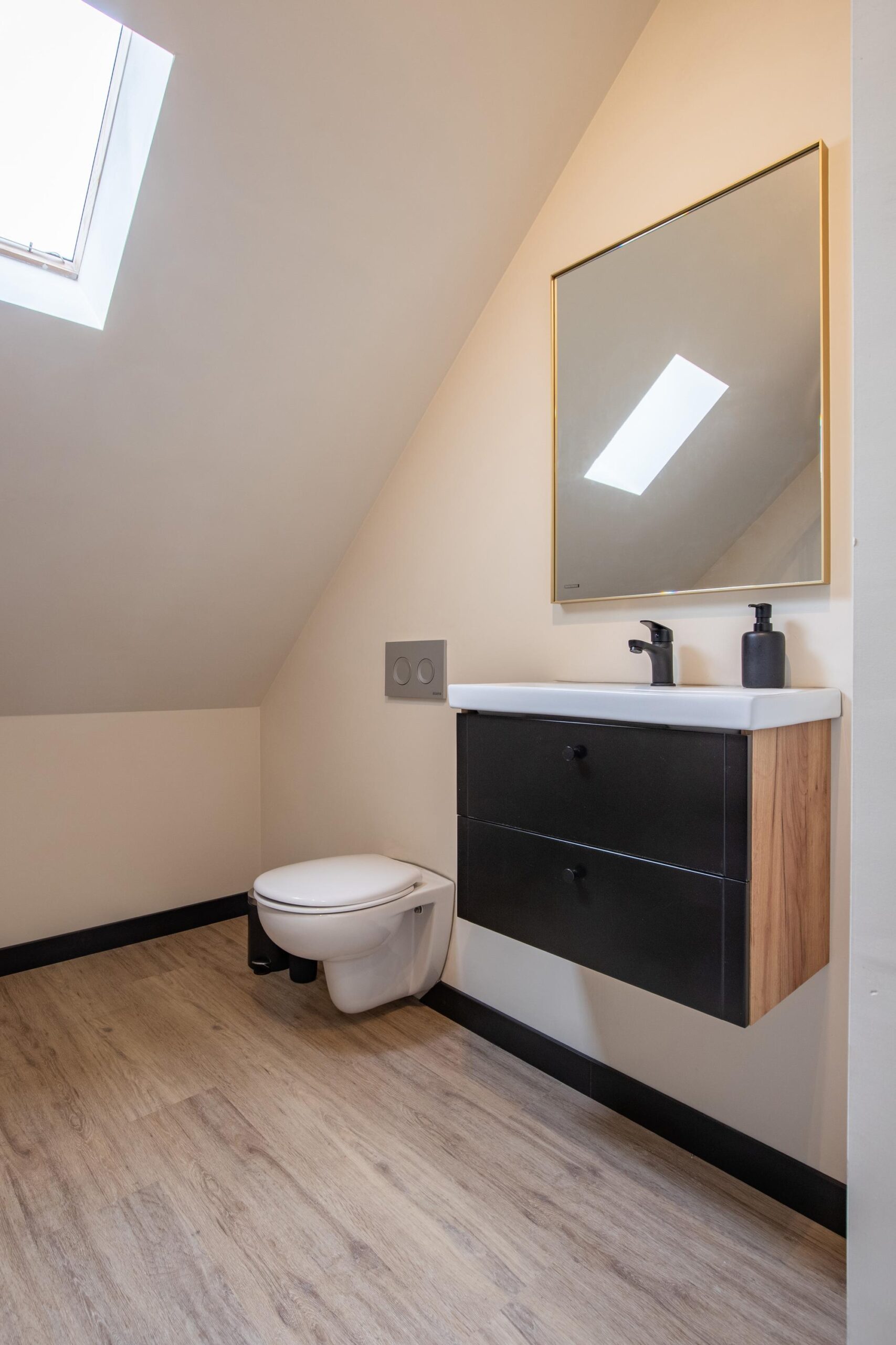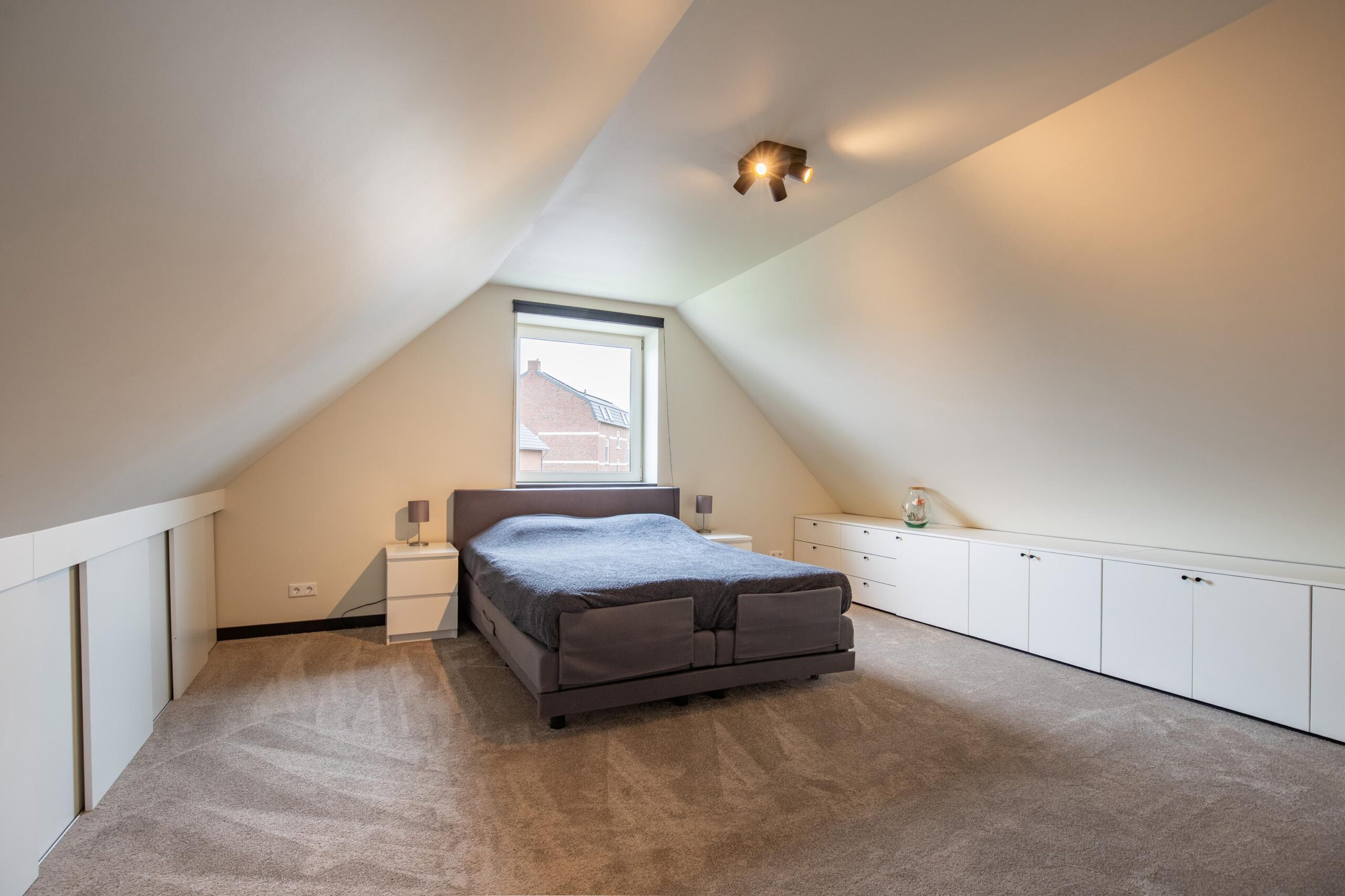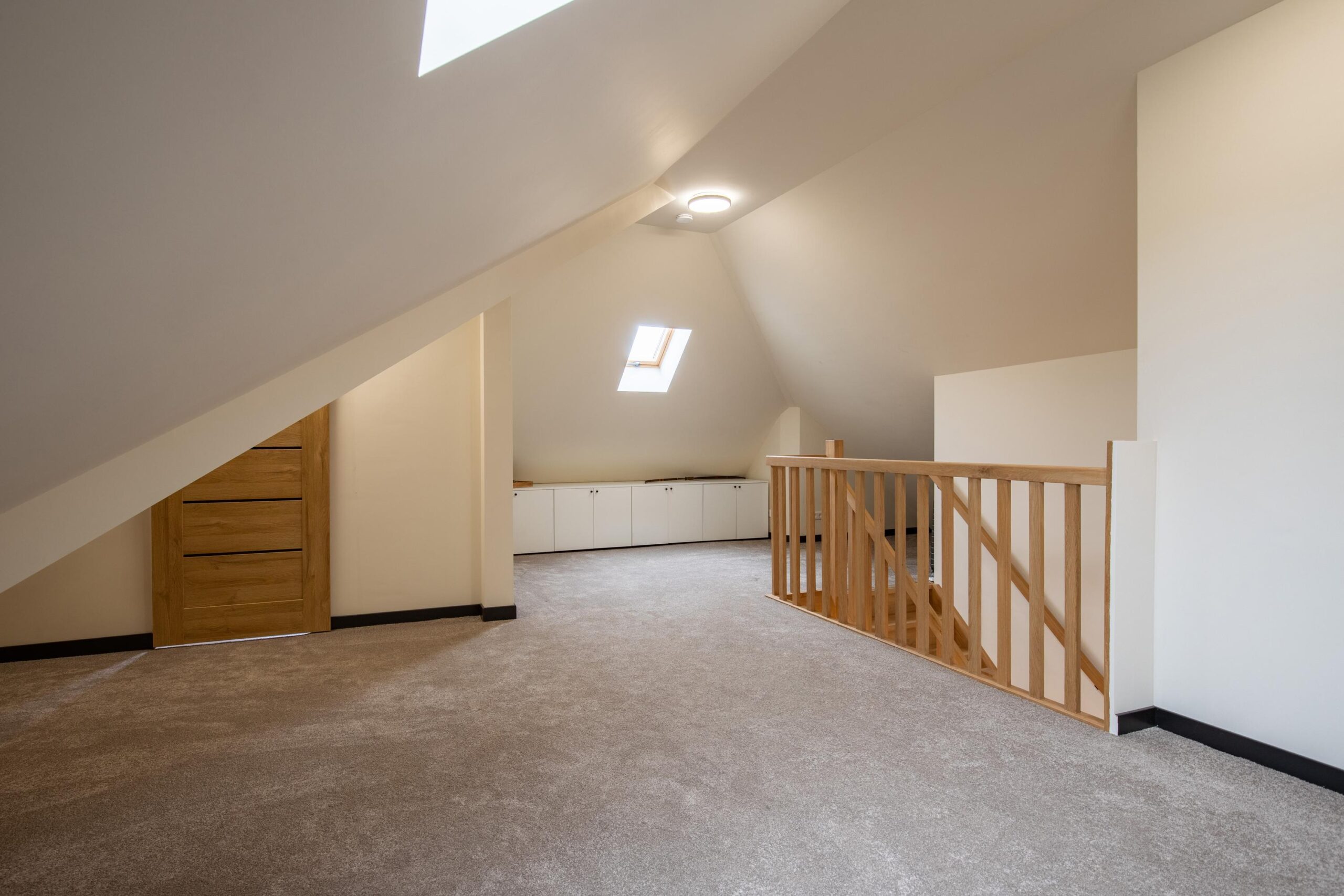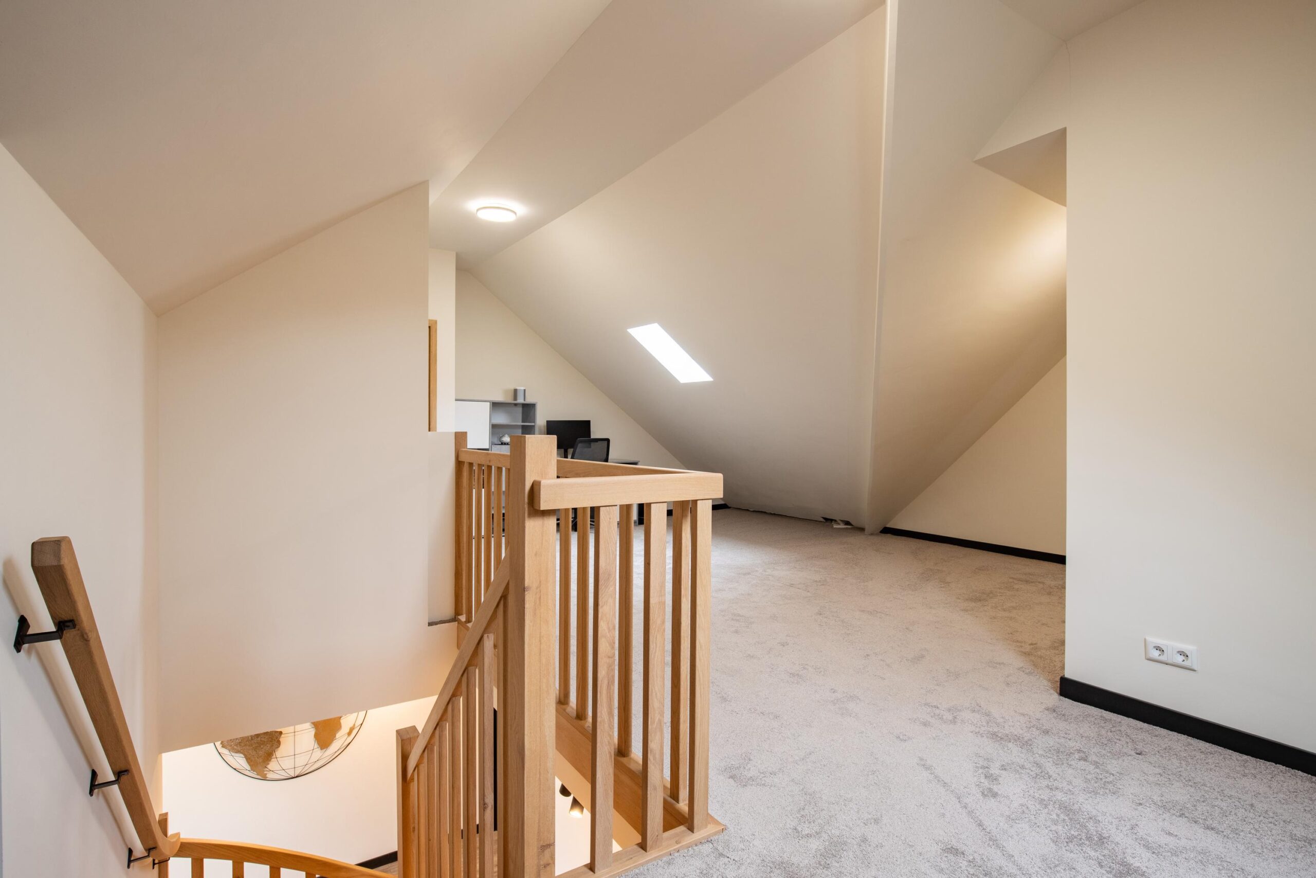 Ook de eerste verdieping moest eraan geloven. Waar dit vroeger alleen zolderruimte was, is er nu een volwaardige, goed afgewerkte verdieping gerealiseerd die bestaat uit een zeer royale overloop, twee ruime slaapkamers en een tweede badkamer. Daarnaast is er ook aan opbergruimte gedacht door de aanwezigheid van verschillende kastruimtes in de knieschotten en aparte hoeken met opbergruimtes. De bovenverdieping is eveneens voorzien van kunststof kozijnen met HR+++ beglazing en diverse nieuwe Velux dakraampjes. De gehele verdiepingsvloer is, net als het dak, nageïsoleerd en voorzien van een moderne, neutrale vloerbedekking.