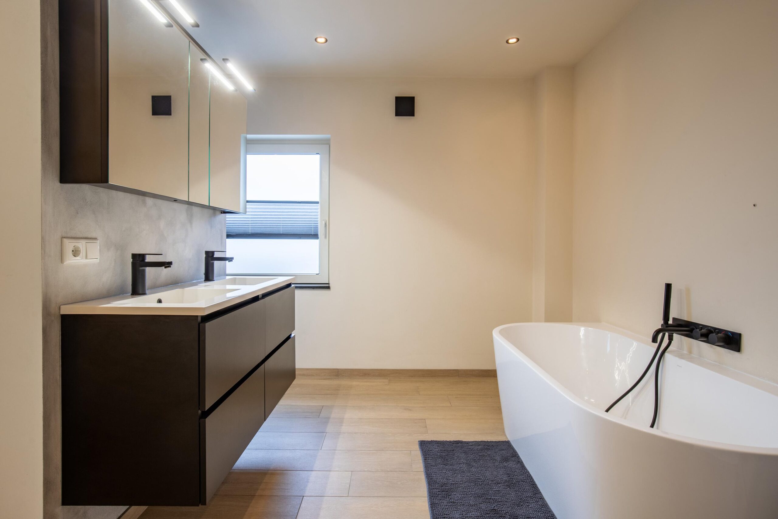 - Badkamervoorzieningen Ligbad, toilet, dubbele wastafel, wastafelmeubel, inloopdouche, vloerverwarming, toilet, douche, wastafel, wastafelmeubel