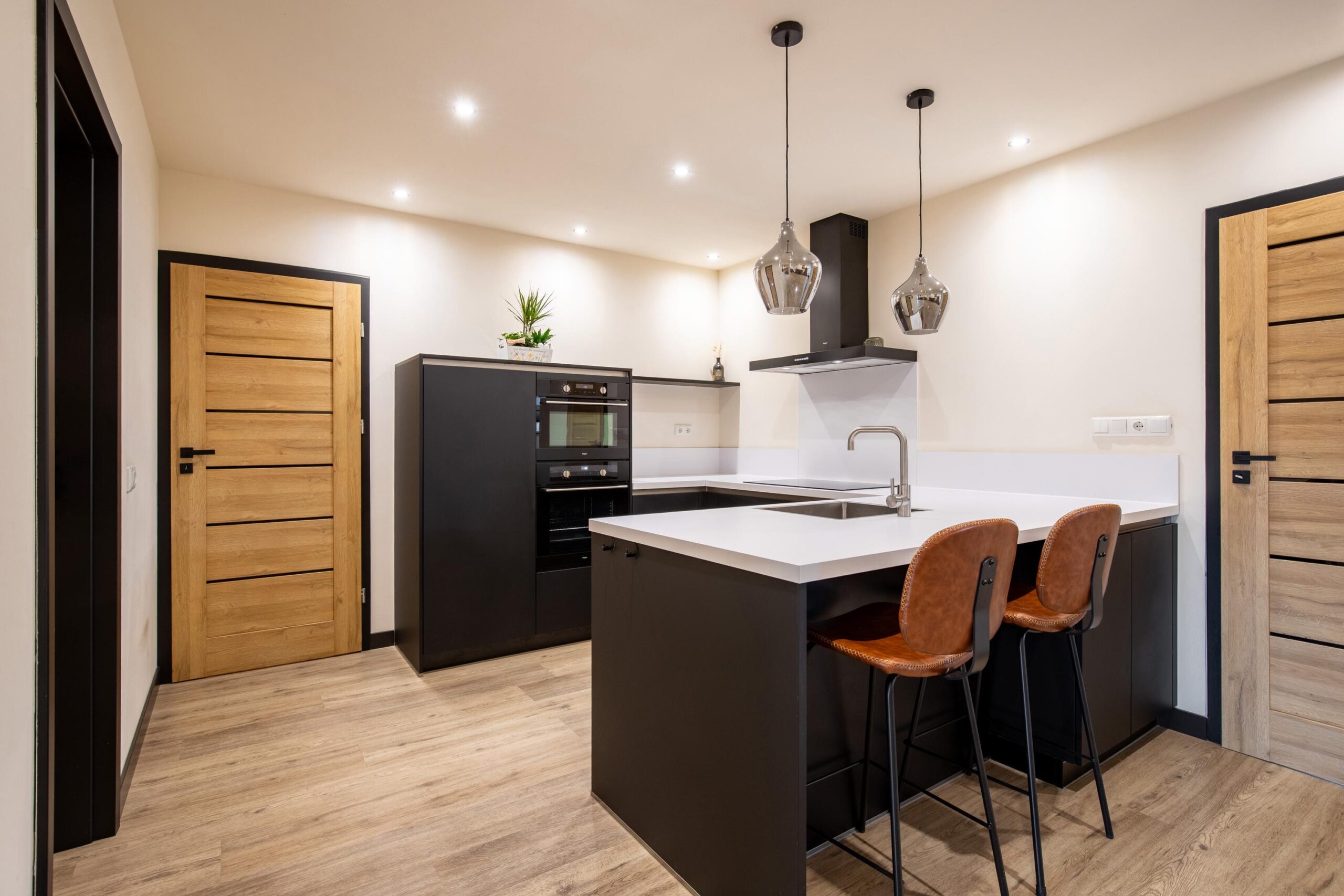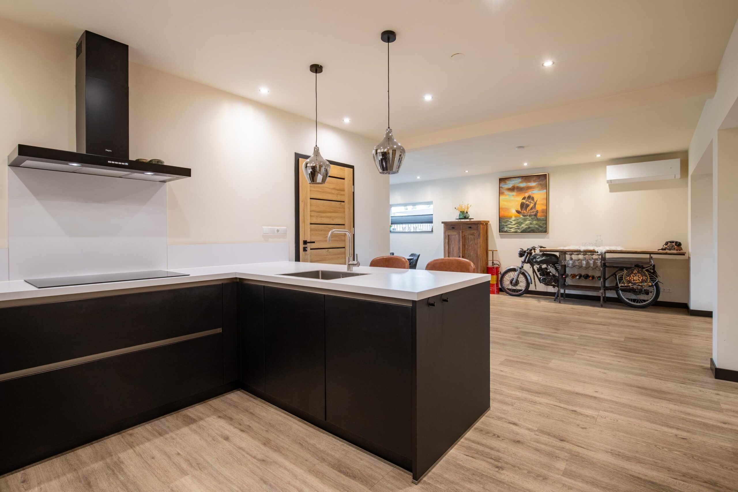 De ruimte in de woonkamer en keuken is erg verrassend, waarbij de woonkamer is aangebouwd en de keuken het centrale hart van de woning vormt. Aan de voorzijde is de woonkamer momenteel ingericht als royale eetkamer en aan de achterzijde van de woning is een zithoek gecreëerd waardoor je middels openslaande tuindeuren volledig contact heb met de achtertuin. Centraal in de ruimte hangt een airco die ideaal te gebruiken is voor verkoeling en verwarming. De in 2022 geplaatste moderne keuken is voorzien van een U-opstelling met schiereiland en zitbar en de navolgende installaties: inductiekookplaat, afzuigkap, koelkast, combi-magnetron, oven, vaatwasser, spoelbak en diverse opbergkastjes en lades. De keuken is helemaal in moderne stijl afgewerkt met zwarte kastjes en een smaakvol wit aanrechtblad. De totale oppervlakte van de woonkamer en keuken bedraagt maar liefst 63 m2. Er is een aparte bijkeuken (circa 5 m2) waar plek is voor een extra koelkast of diepvries en met aansluitpunten voor het witgoed.