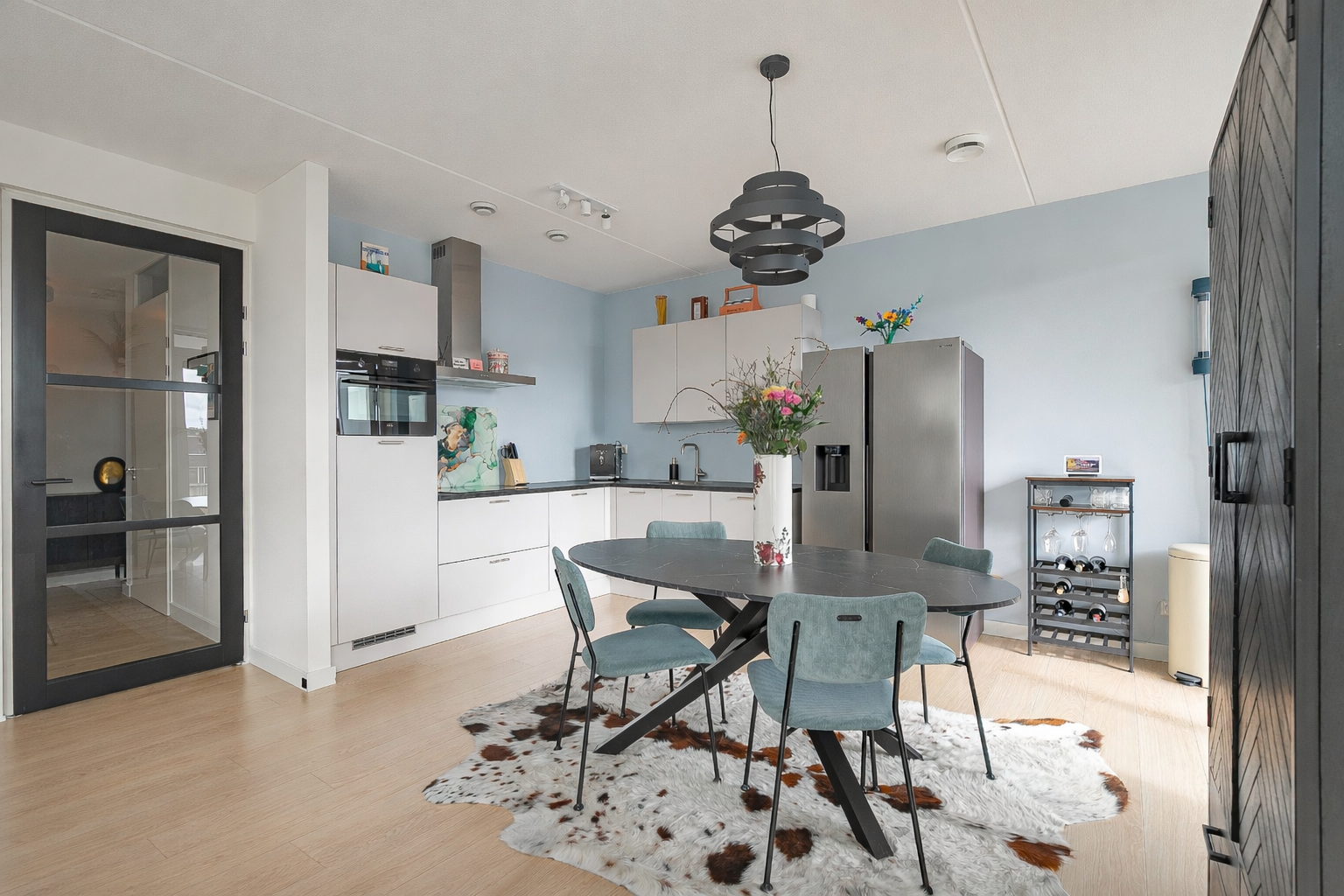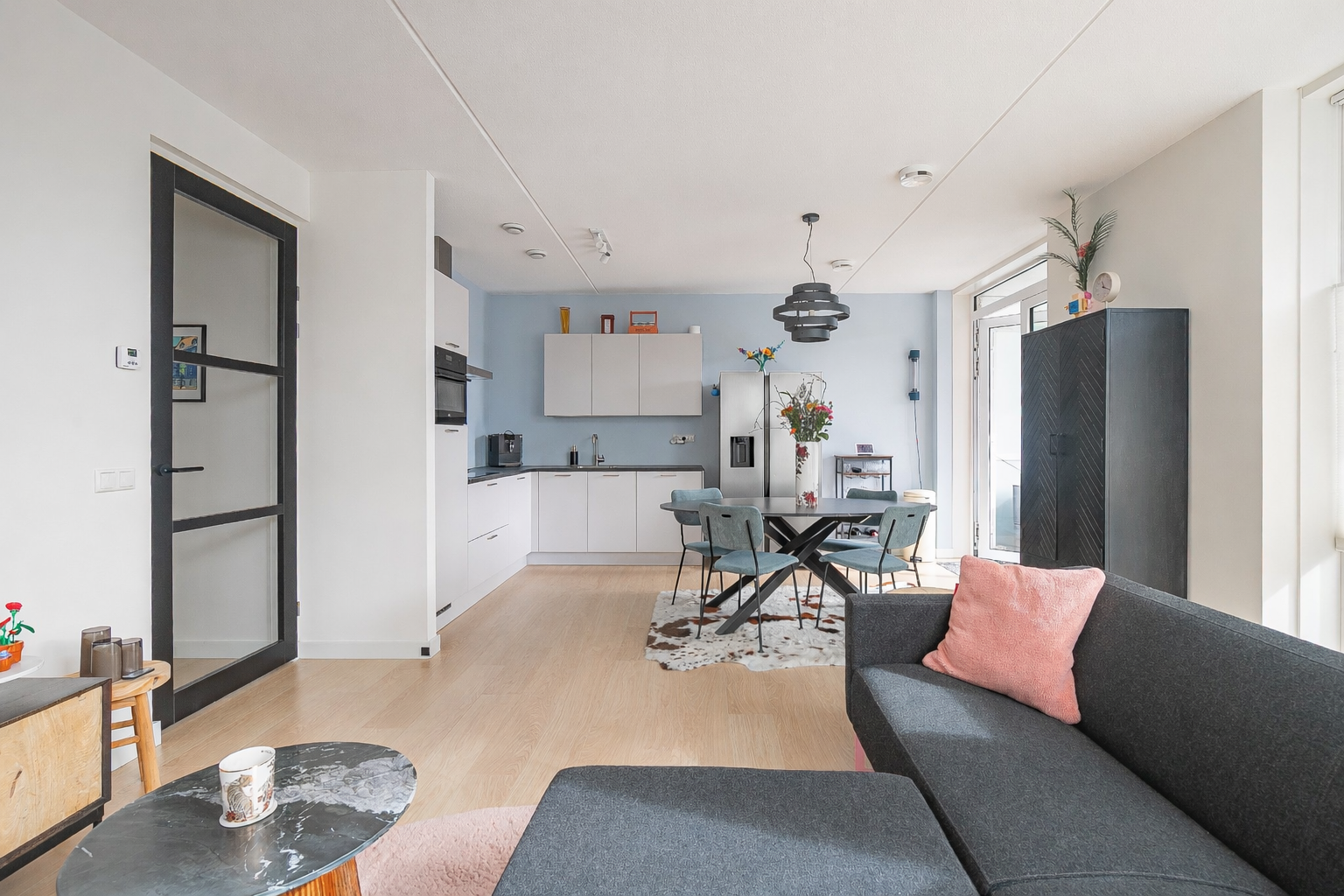 Bij binnenkomst wordt u verwelkomd in een opvallend ruime hal, die toegang biedt tot alle vertrekken. De lichte woonkamer met open keuken vormt het hart van de woning. Hier zorgen de ramen tot op de vloer en de hoekligging voor een aangename, open sfeer. De moderne keuken is compleet uitgevoerd en voorzien van alle benodigde inbouwapparatuur.