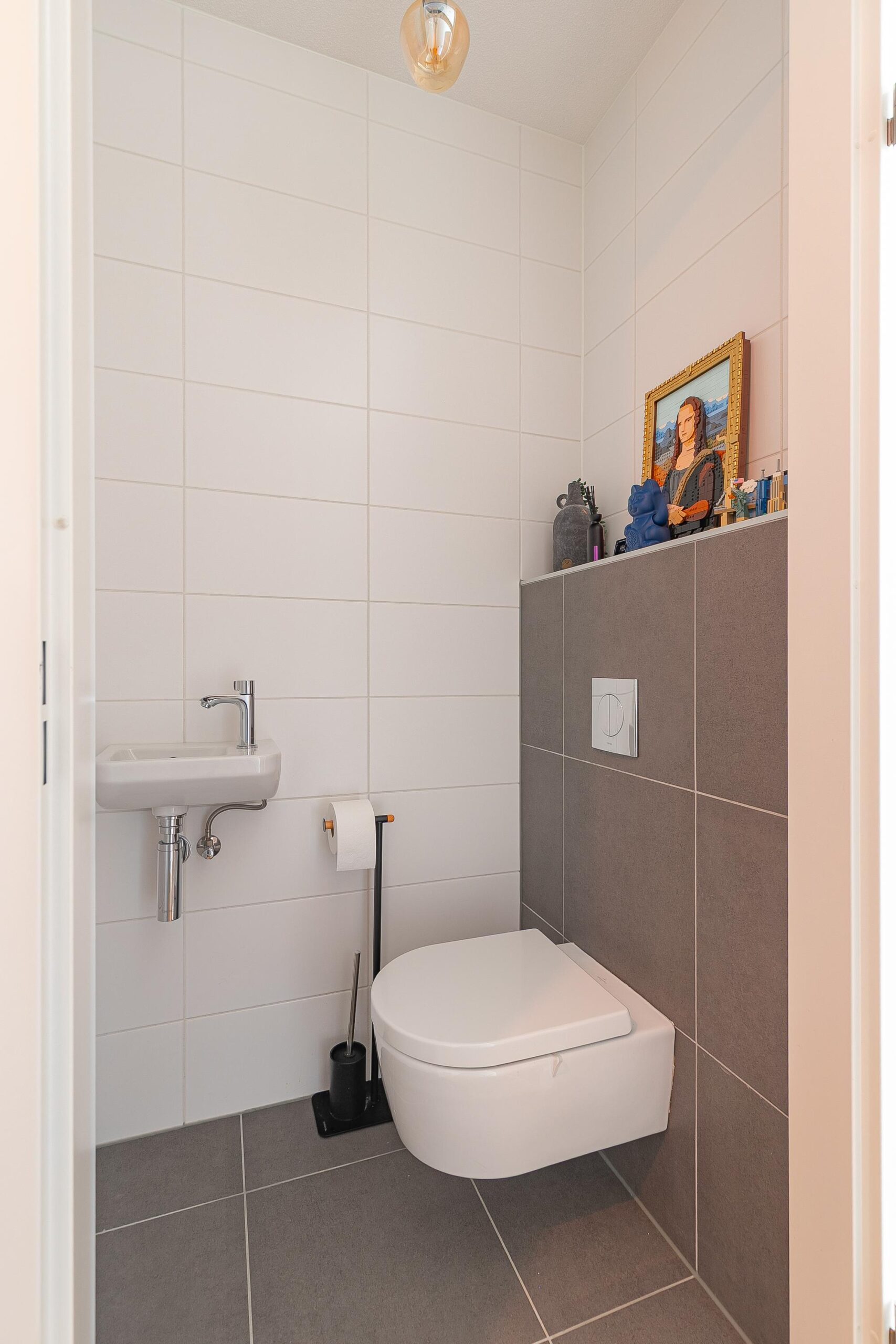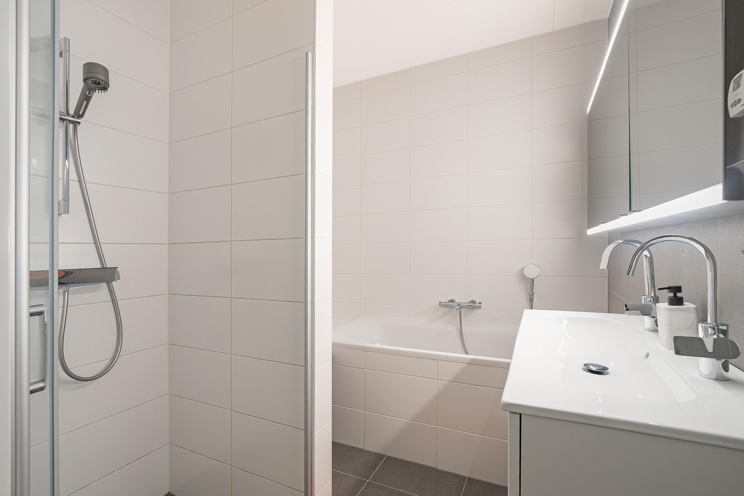 De stijlvolle badkamer is compleet ingericht met een ligbad, inloopdouche en een brede wastafel. Het separate toilet is in dezelfde moderne stijl uitgevoerd. Daarnaast is er een praktische inpandige berging met ruimte voor wasapparatuur en installaties.