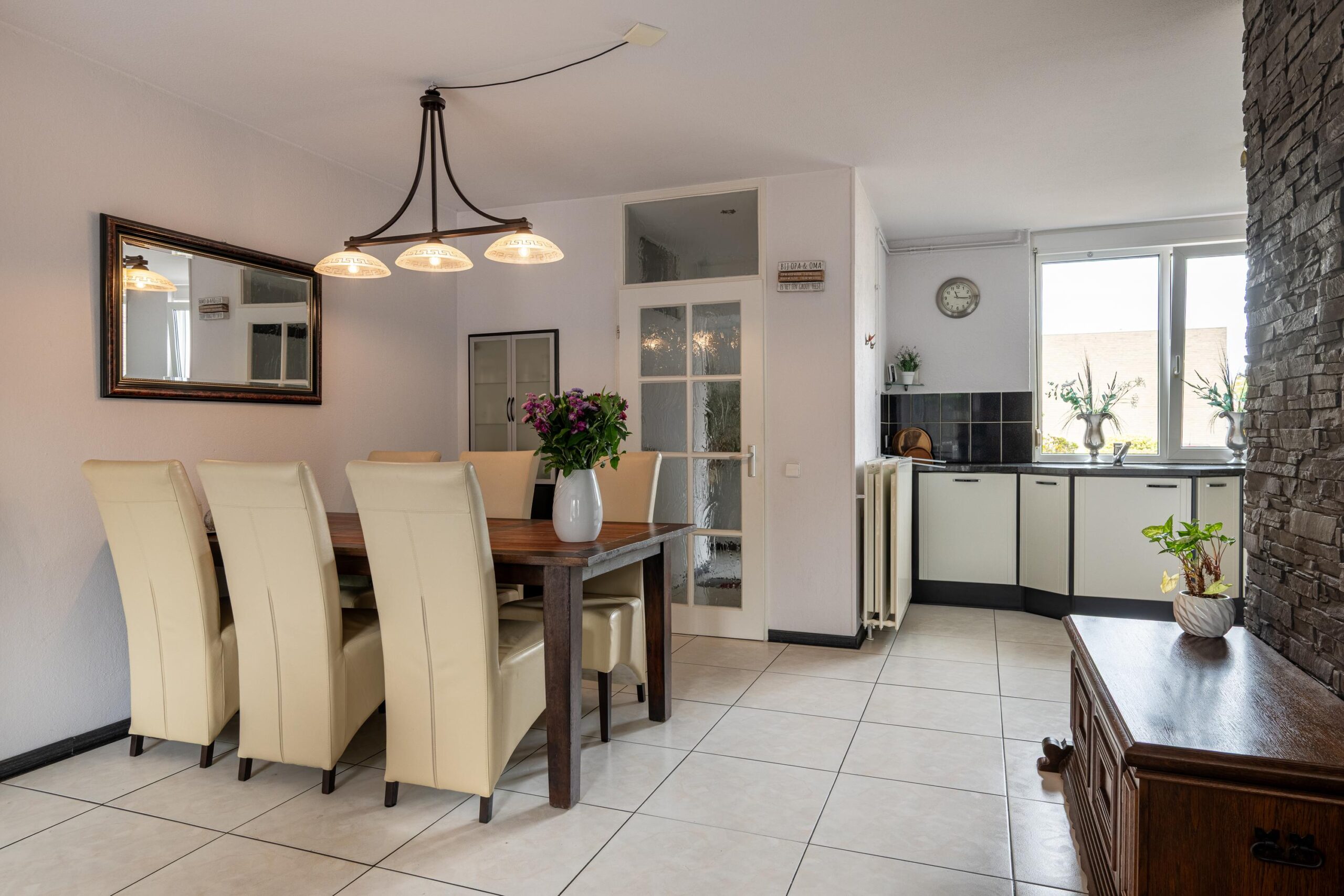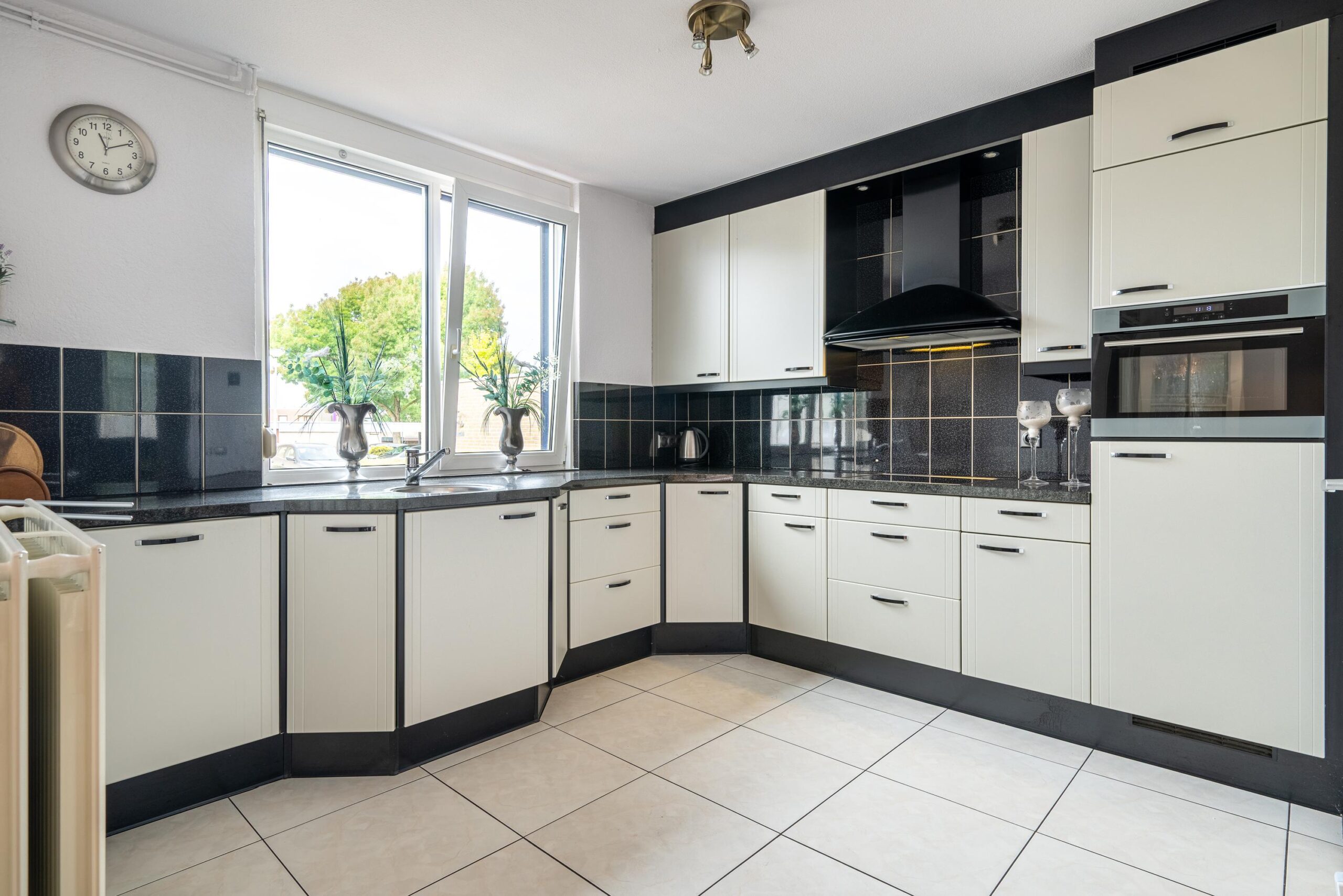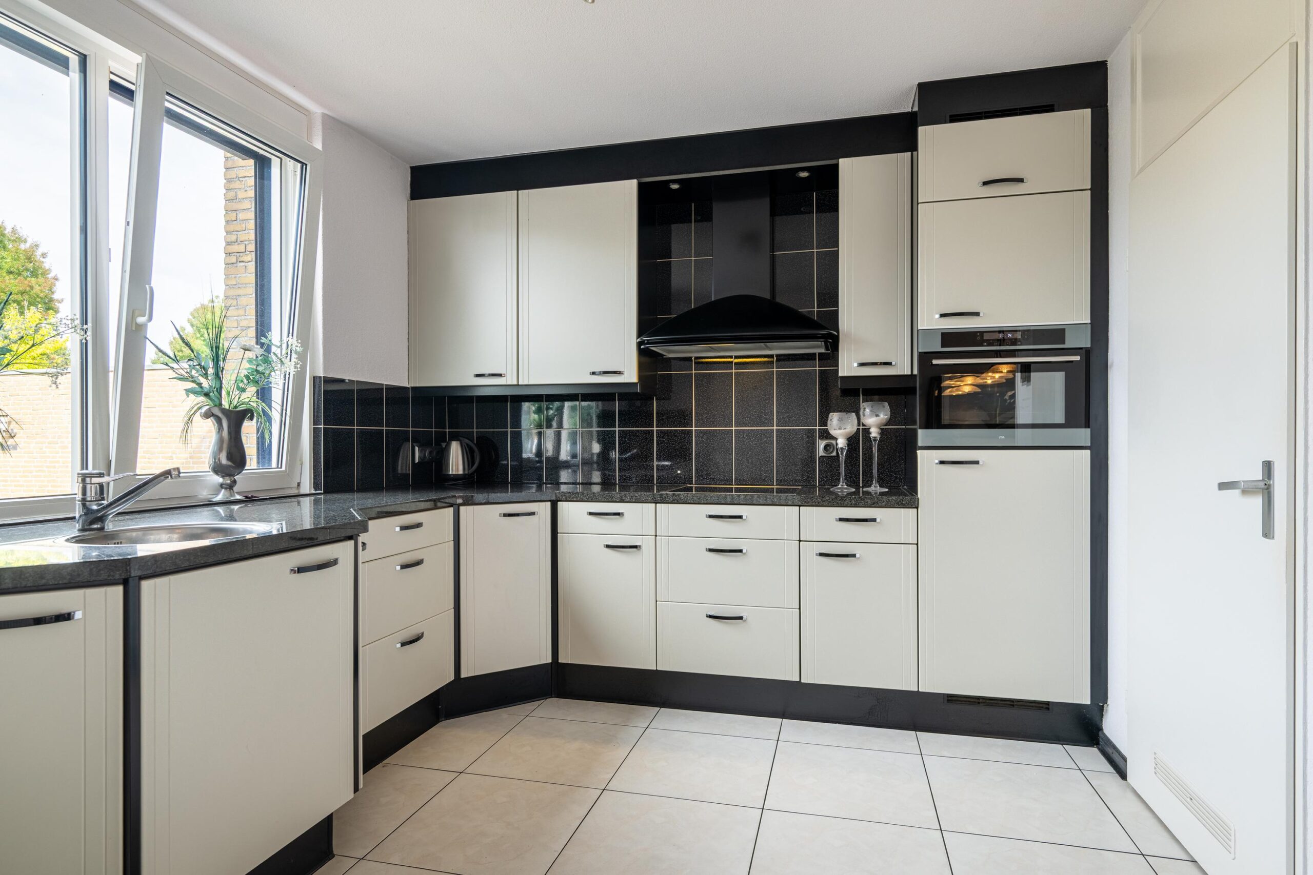 Aan de voorzijde bevindt zich de betegelde keuken met L-vormige opstelling, voorzien van veel kast- en bergruimte, een granieten werkblad en diverse inbouwapparatuur: schouwafzuigkap, keramische kookplaat, koelkast, combimagnetron en vaatwasser. Vanuit de keuken kijkt u uit over een fraai plantsoen.