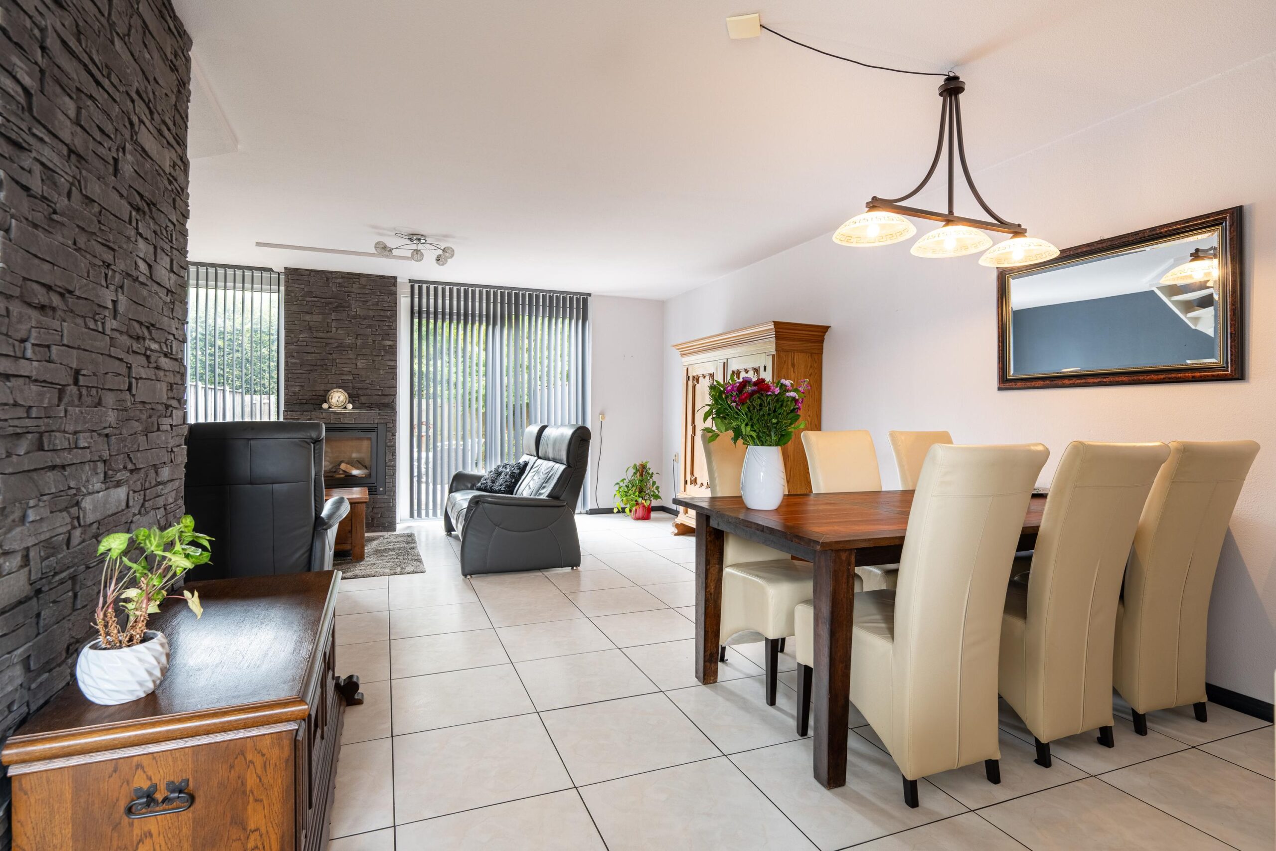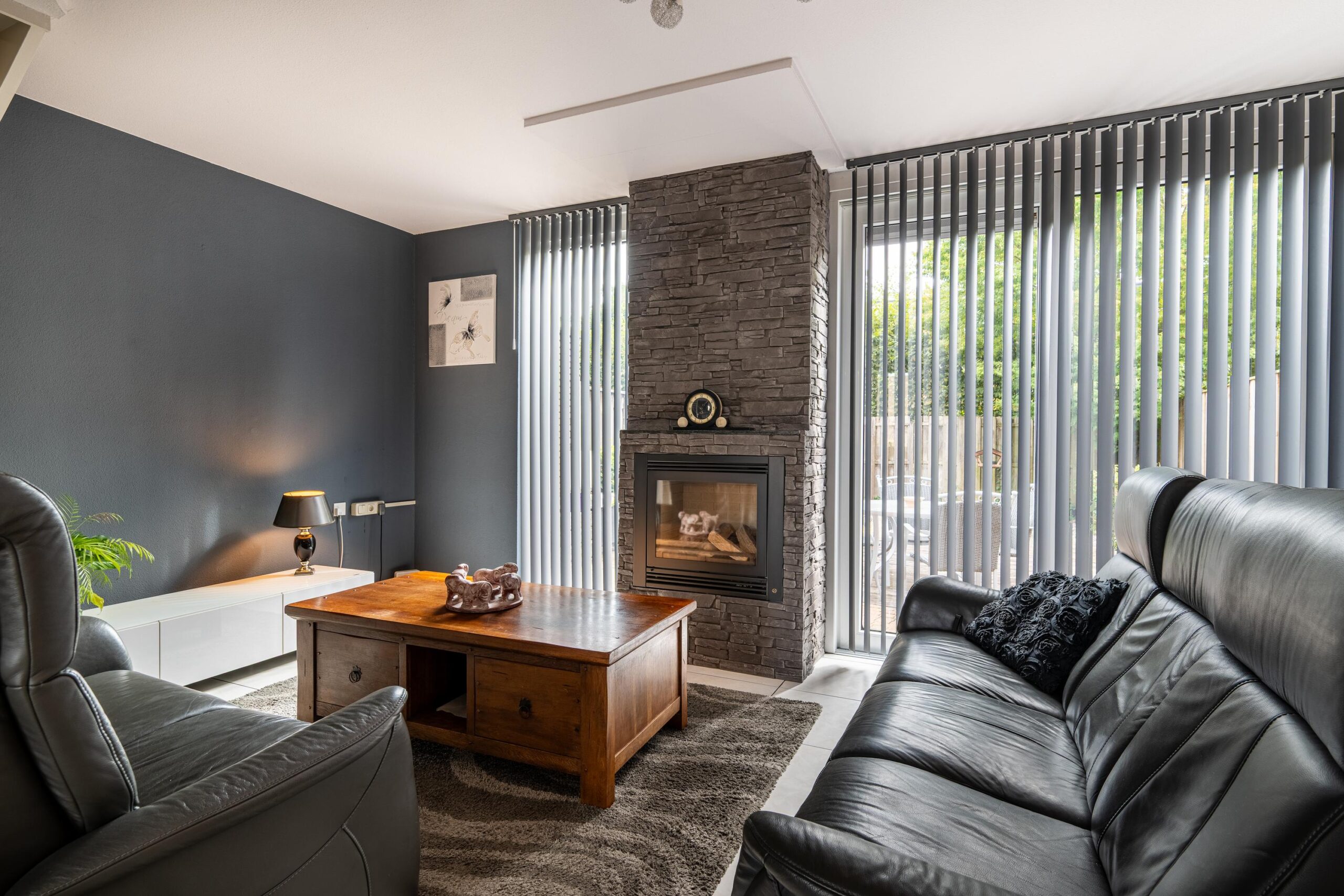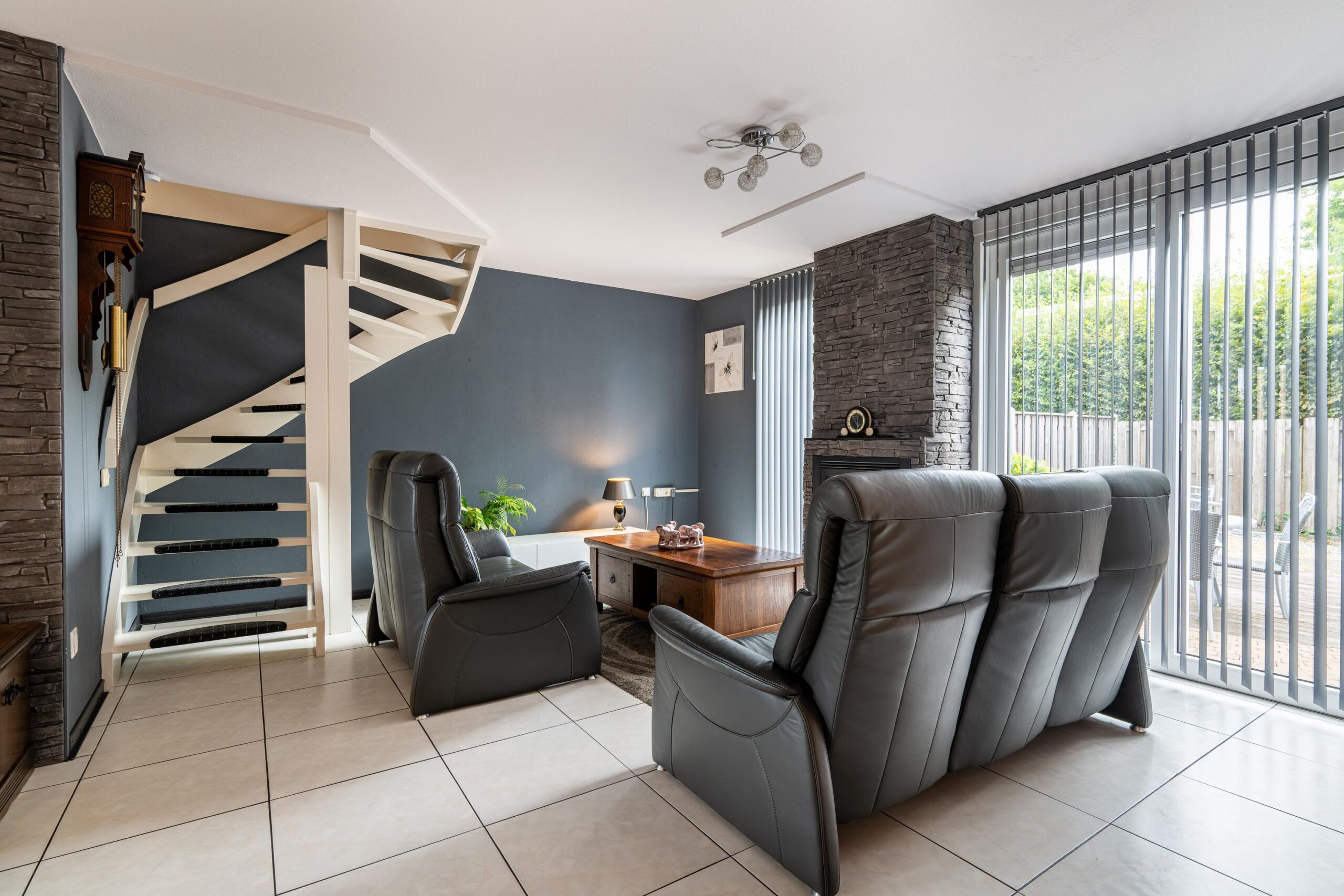 De speels ingedeelde Z-vormige woonkamer is voorzien van een centraal geplaatste gashaard, grote raampartijen en een schuifpui naar de tuin, waardoor de ruimte heerlijk licht en open aanvoelt. De open trap naar de verdieping geeft de woonkamer extra karakter.